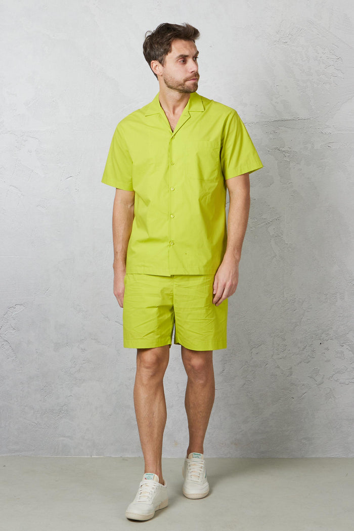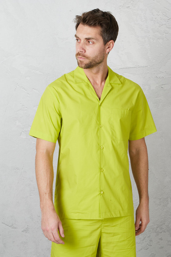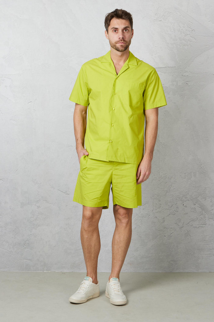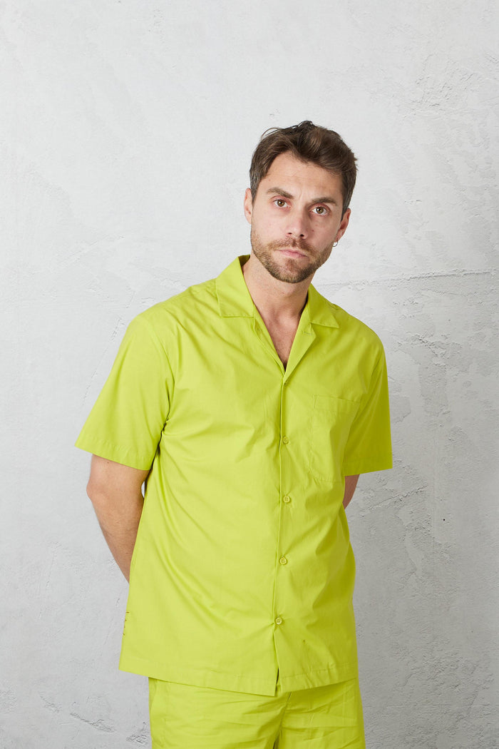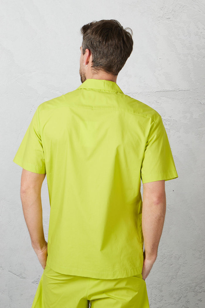 Camicia a maniche corte con chiusura frontale con bottoni. Taschino frontale. Il modello è alto 187 cm e indossa la taglia 48. Made in Italy.