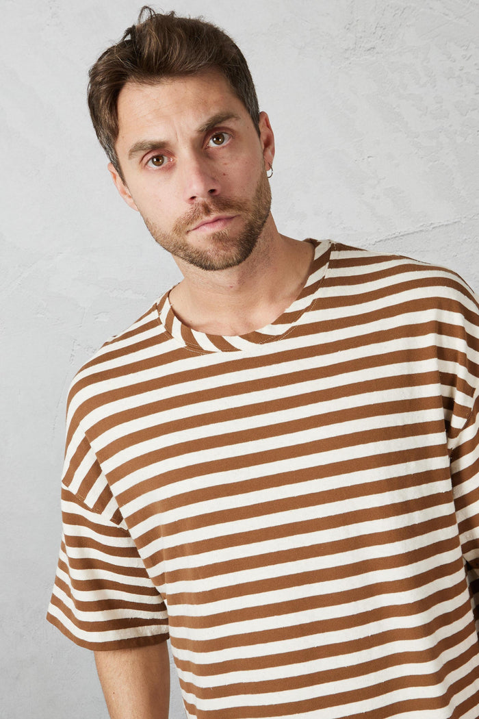 T-shirt mezze maniche a riche panna/tabacco. Vestibilità over. Il modello è alto 187cm e indossa la taglia L. Mde in Italy.