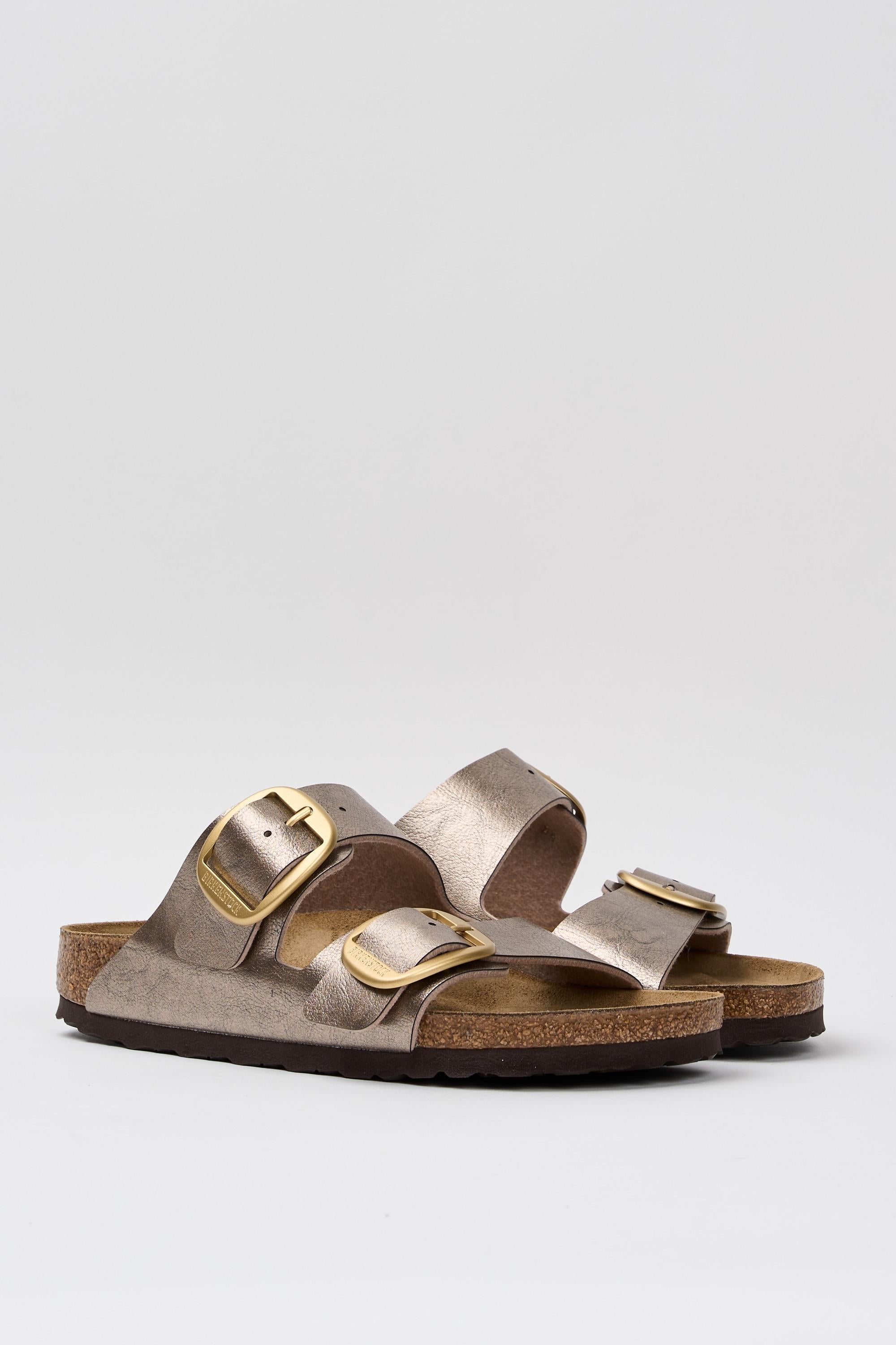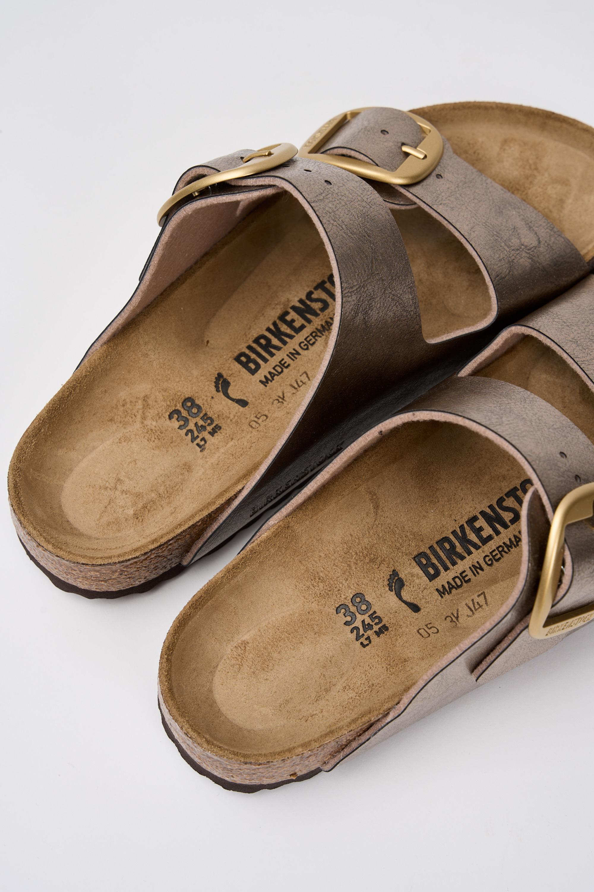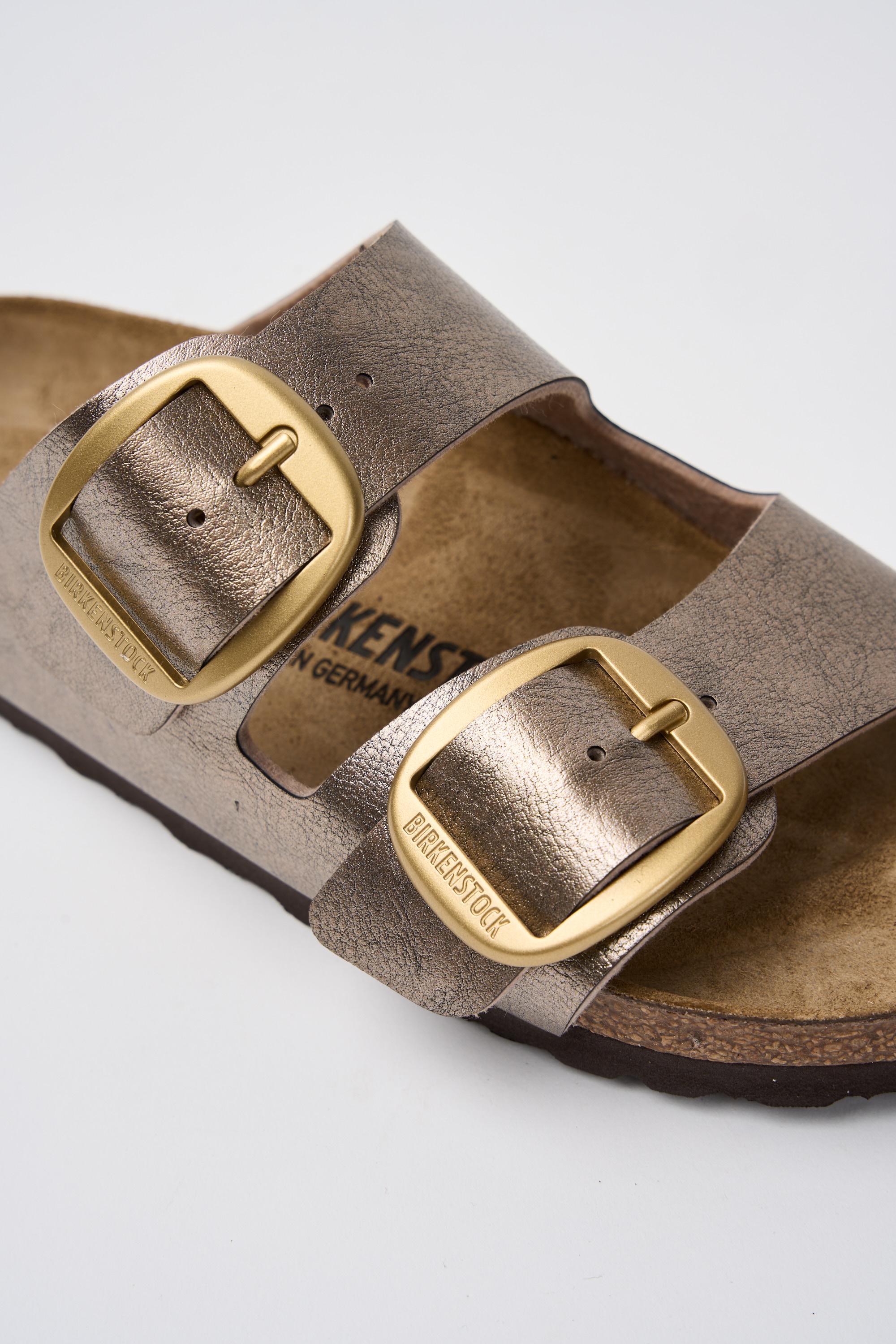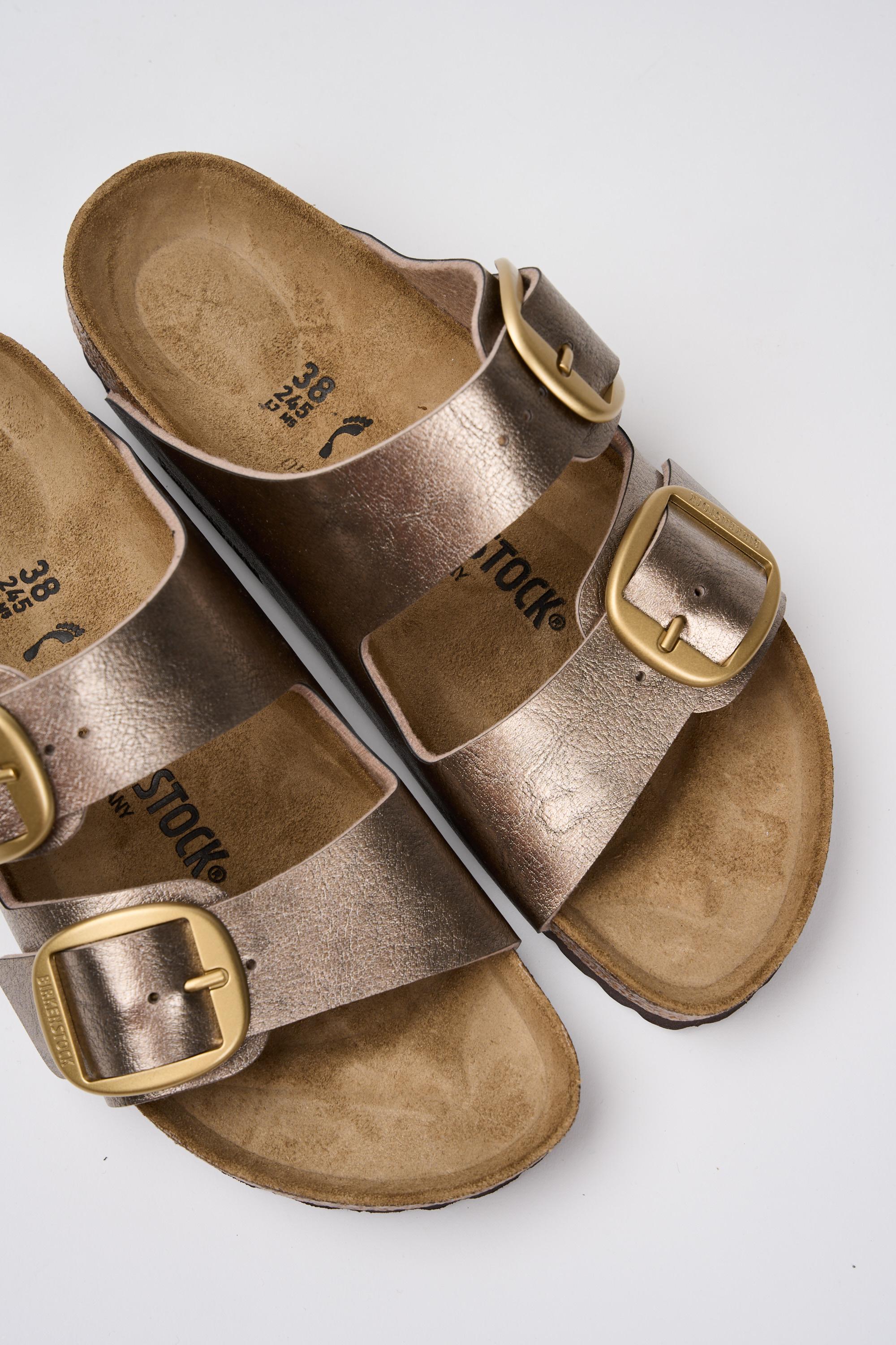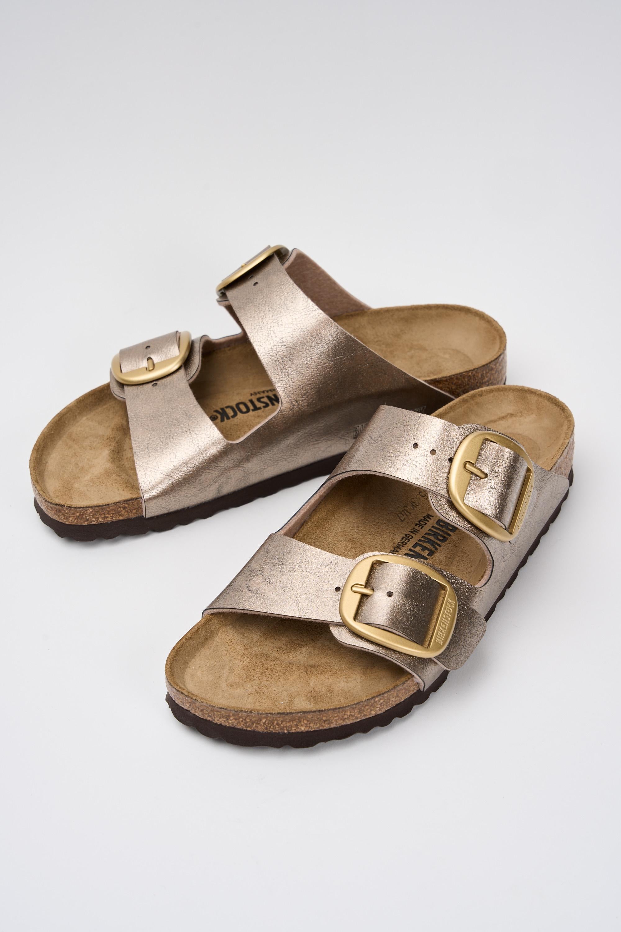 Sandalo modello Arizona con tomaia in Birko-Flor®, un materiale sintetico resistente all'usura e delicato per la pelle. Due cinturini con fibbie in metallo regolabili individualmente e suola in EVA. Sottopiede in pelle scamosciata e plantare dalla forma anatomica in sughero e lattice. Pianta stretta.