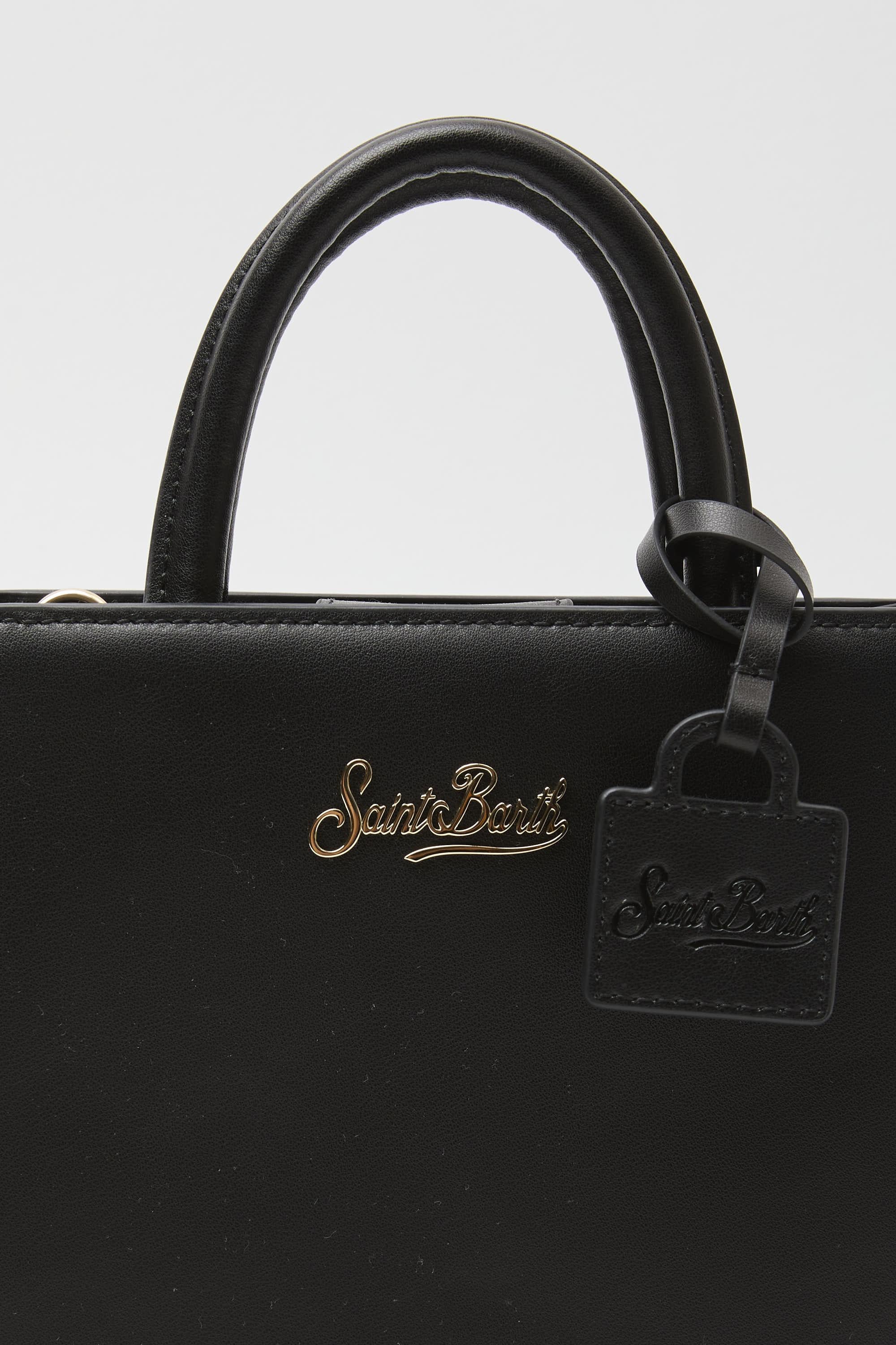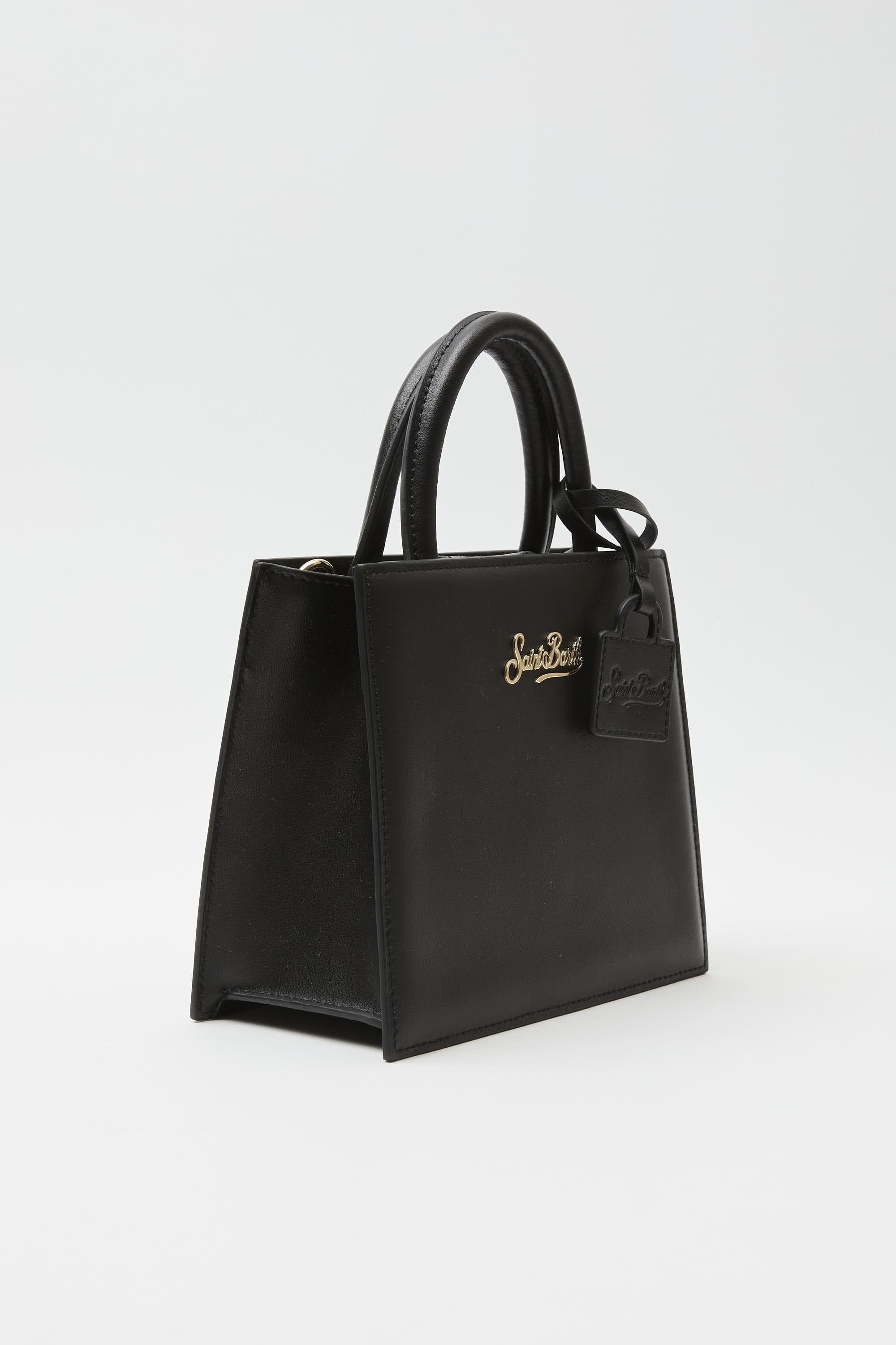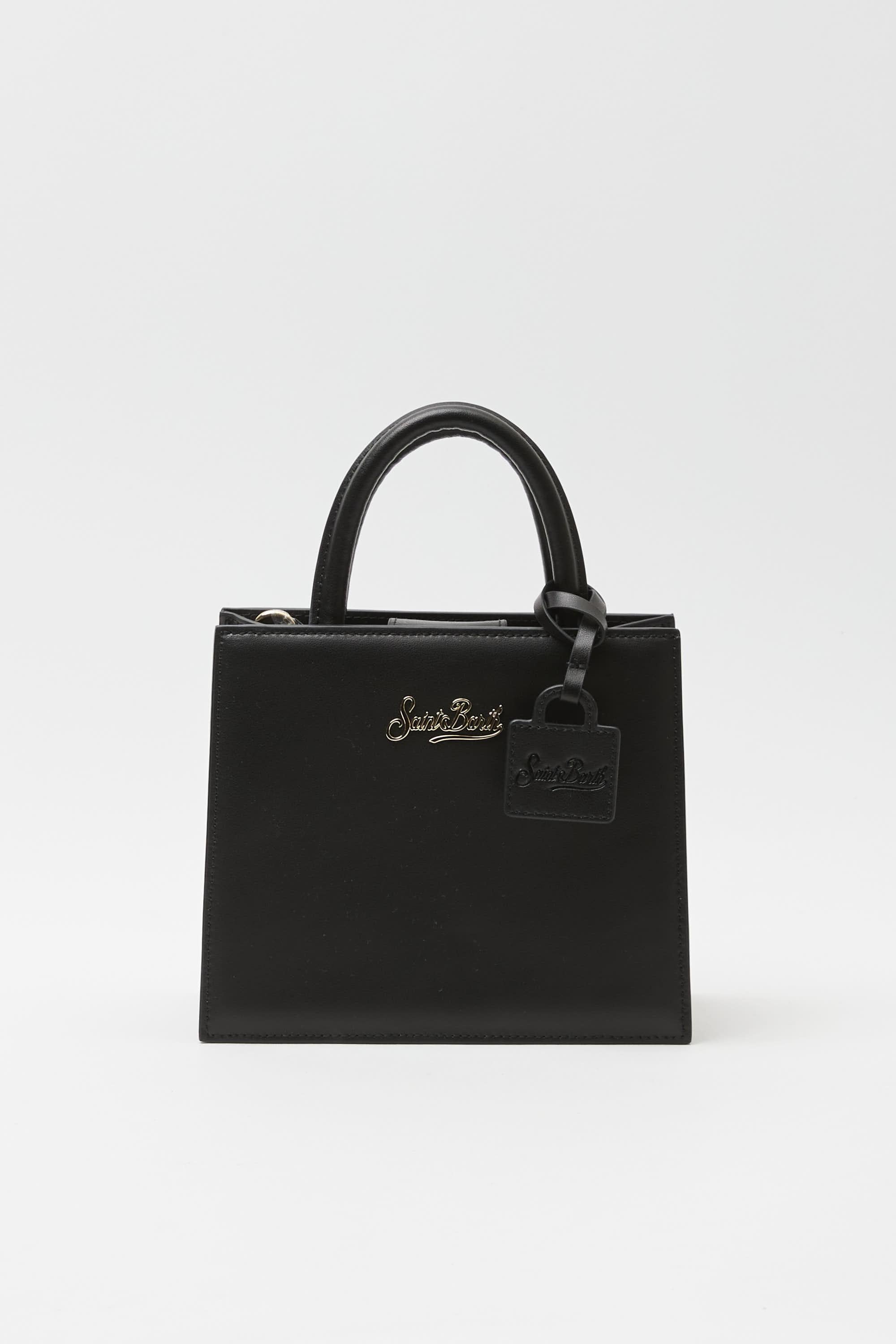 Shop Bag Mini in pelle liscia nera con tracolla removibile e regolabile. Tasca interna. Pattina con chiusura magnetica e logo frontale in metallo con finitura oro galvanico. Charm in pelle, con logo impresso e agganciato al manico per un dettaglio distintivo. Dimensioni: 19x16x8cm.