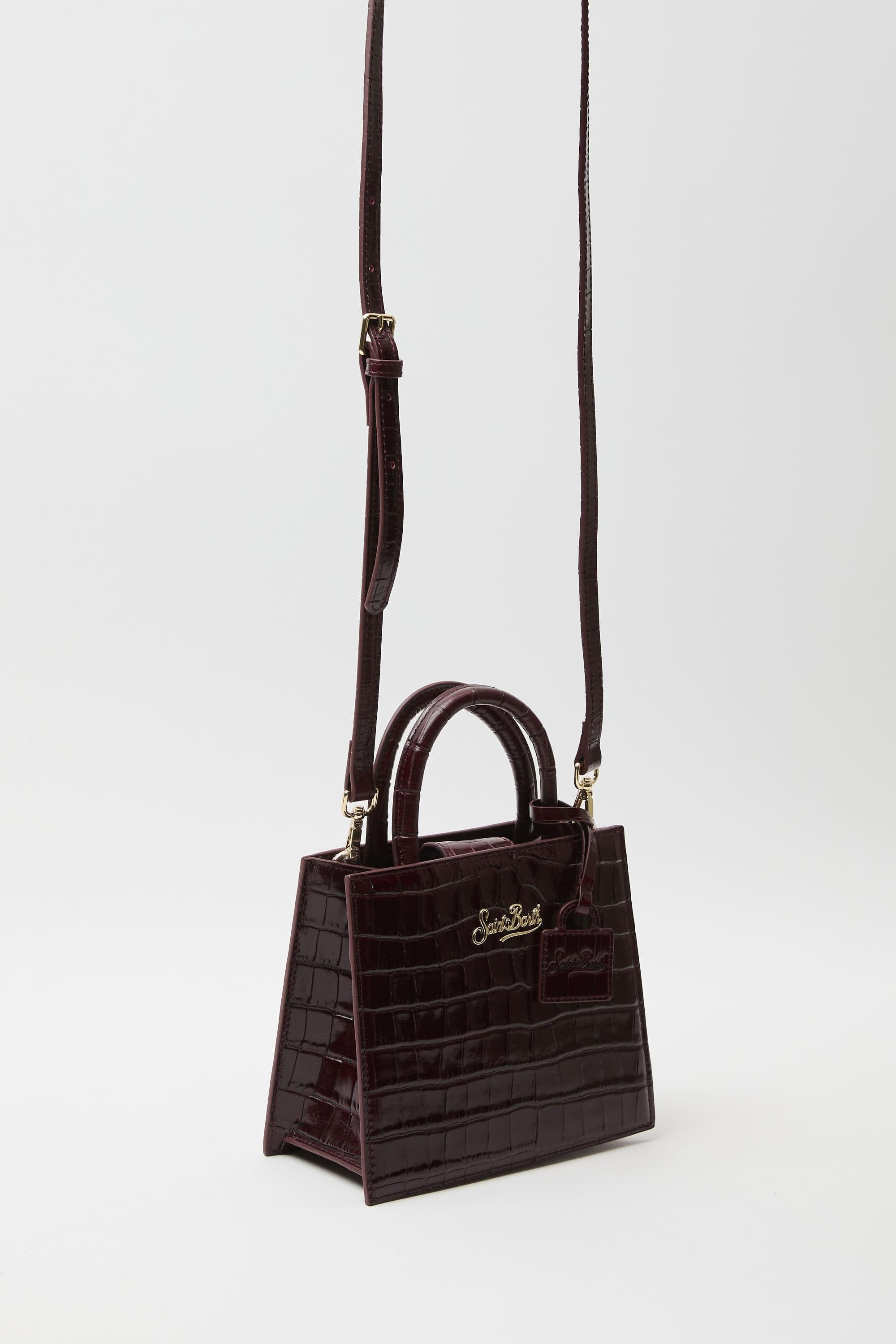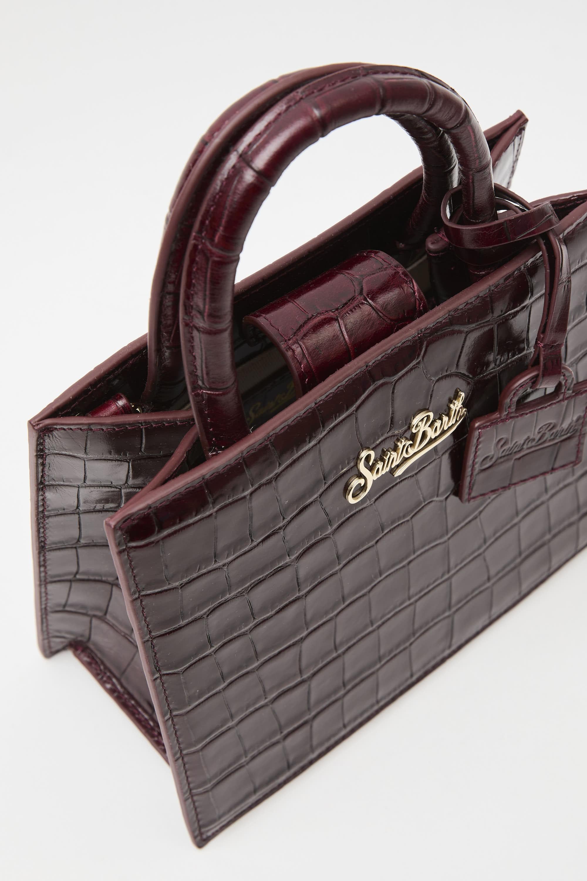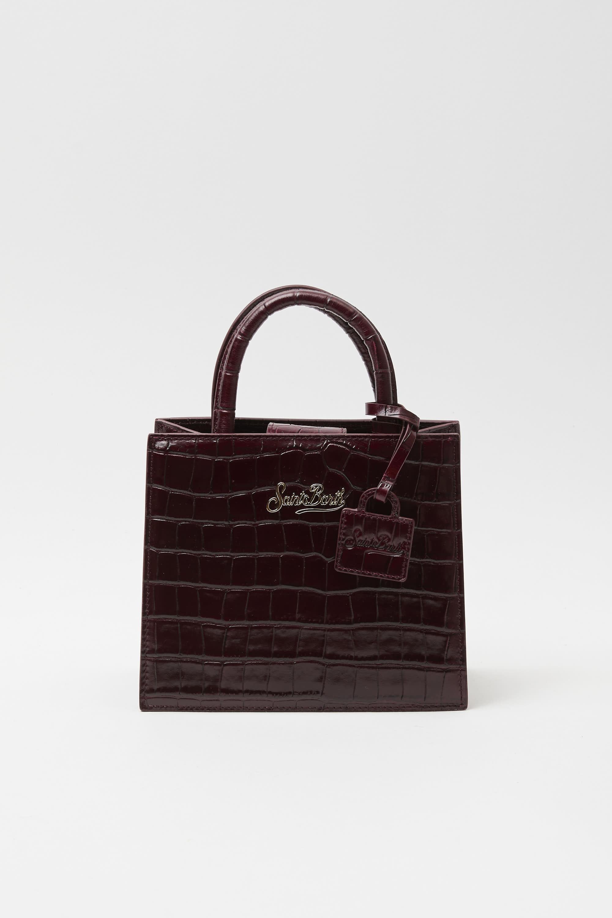 Shop Bag Mini in pelle stampa cocco bordeaux con tracolla removibile e regolabile. Tasca interna. Pattina con chiusura magnetica e logo frontale in metallo con finitura oro galvanico. Charm in pelle, con logo impresso e agganciato al manico per un dettaglio distintivo. Dimensioni: 19x16x8cm.