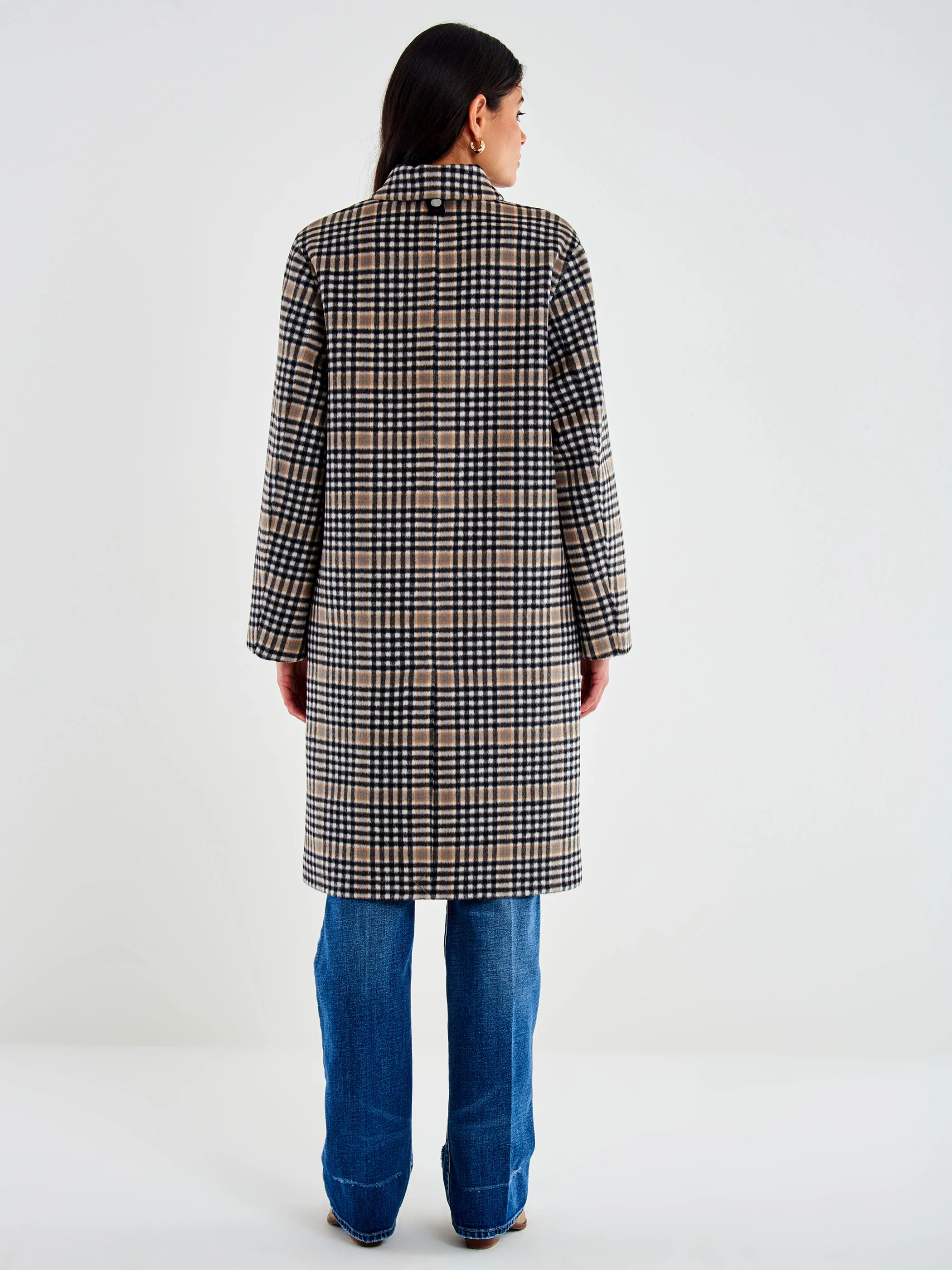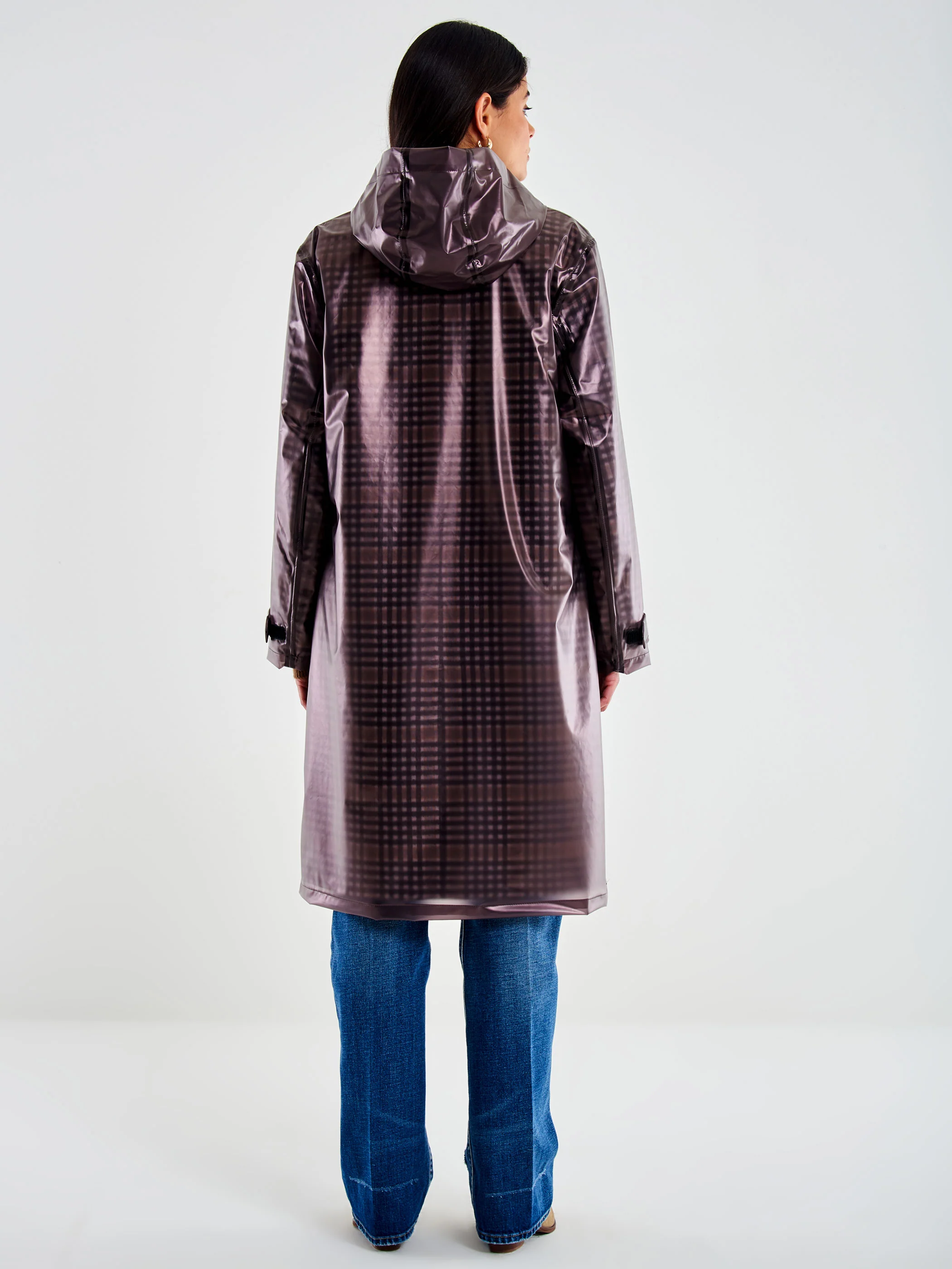 Cappotto lungo a quadri maniche lunghe con colletto. Chiusura frontale monopetto. Tasche frontali a pattina applicate. Spacco sul retro. Dettaglio impermeabile con cappuccio, con chiusura frontale con cerniera e tasche frontali con patta combinato. I due capi non sono vendibili separatamente. La modella è alta 178 cm e indossa la taglia S.