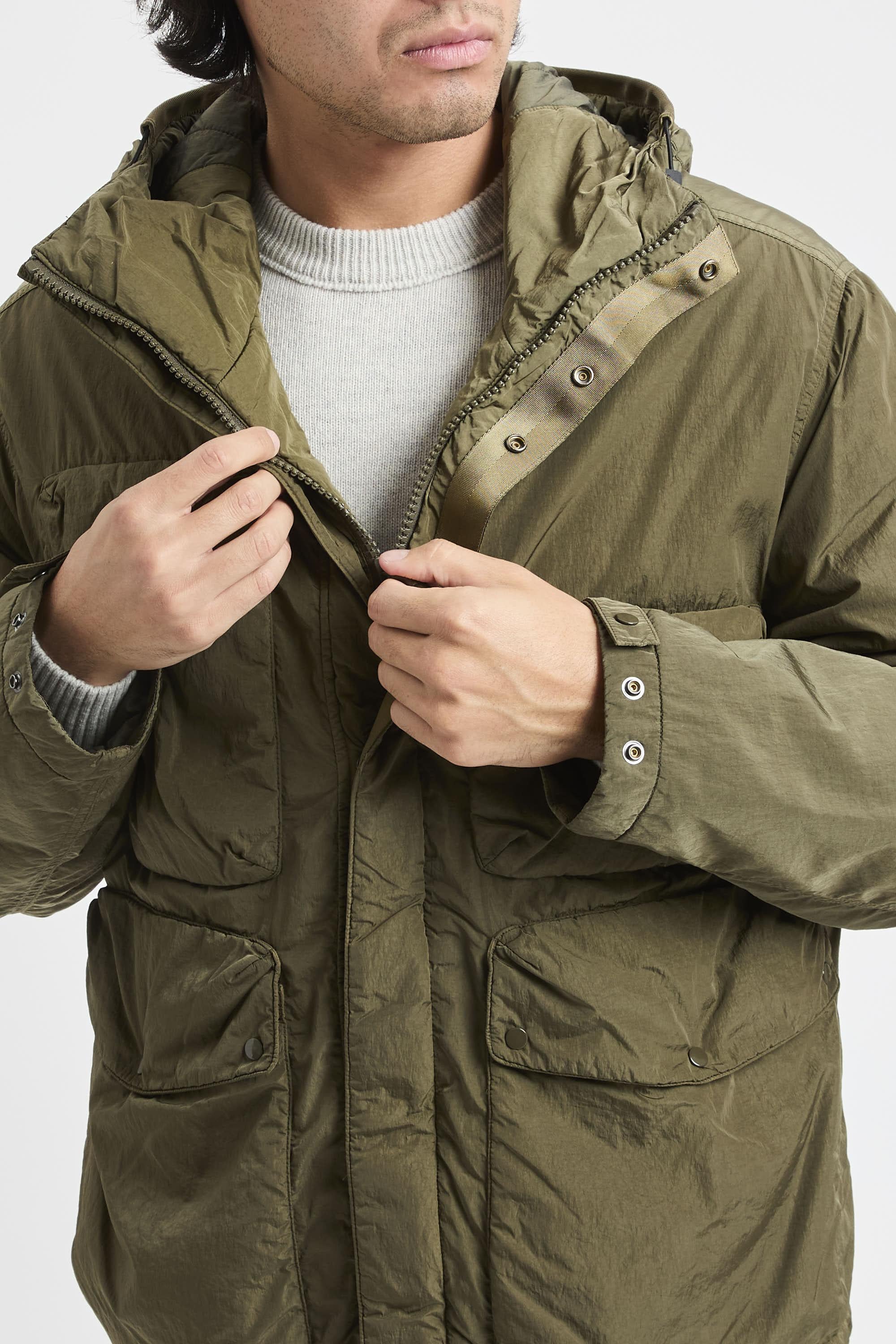 Goggle jacket realizzata in Chrome-R, un nylon multifilamento lucido e riciclato al 100%, ottenuto da scarti di lavorazione e trasformato in una nuova fibra certificata Global Recycled Standard (GRS). Il modello presenta liconico cappuccio con lenti Goggle regolabile di C.P. Company, chiusura full zip a doppio cursore nascosta da patta con bottoni automatici, tasche frontali con patta e polsini regolabili. Orlo con coulisse regolabile per una vestibilità personalizzata. Imbottitura in ovatta per maggiore comfort. Tinto in capo con trattamento anti-goccia. Regular fit. Il modello è alto 187cm e indossa la taglia L.