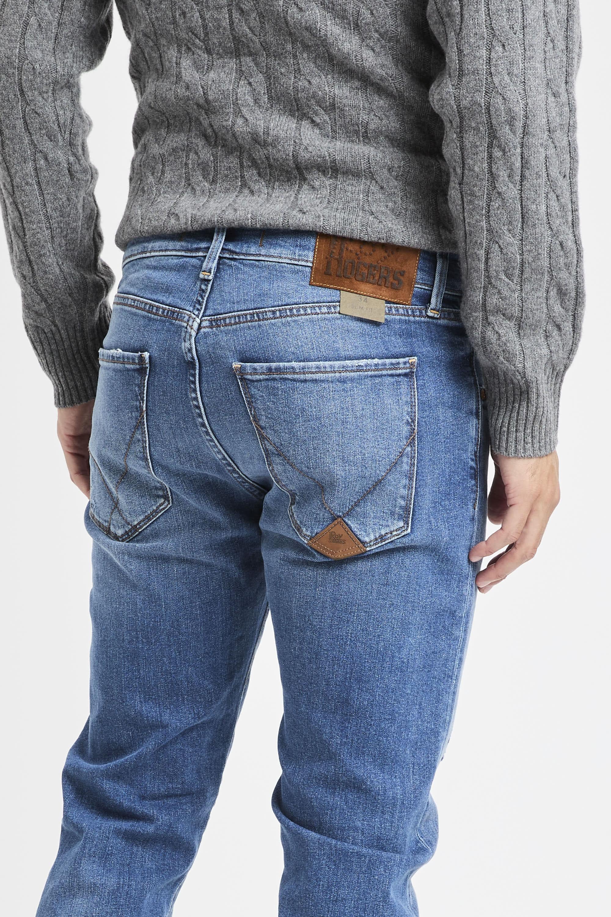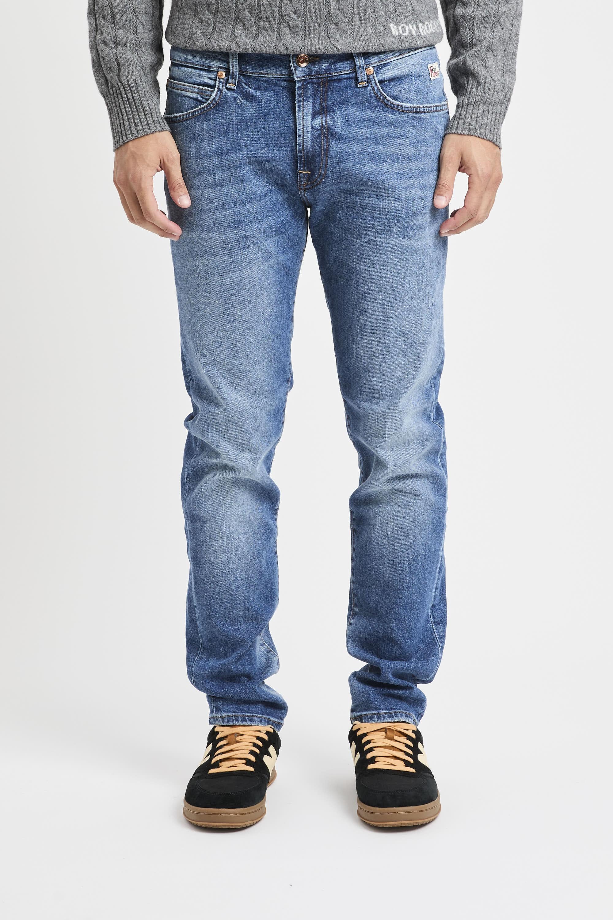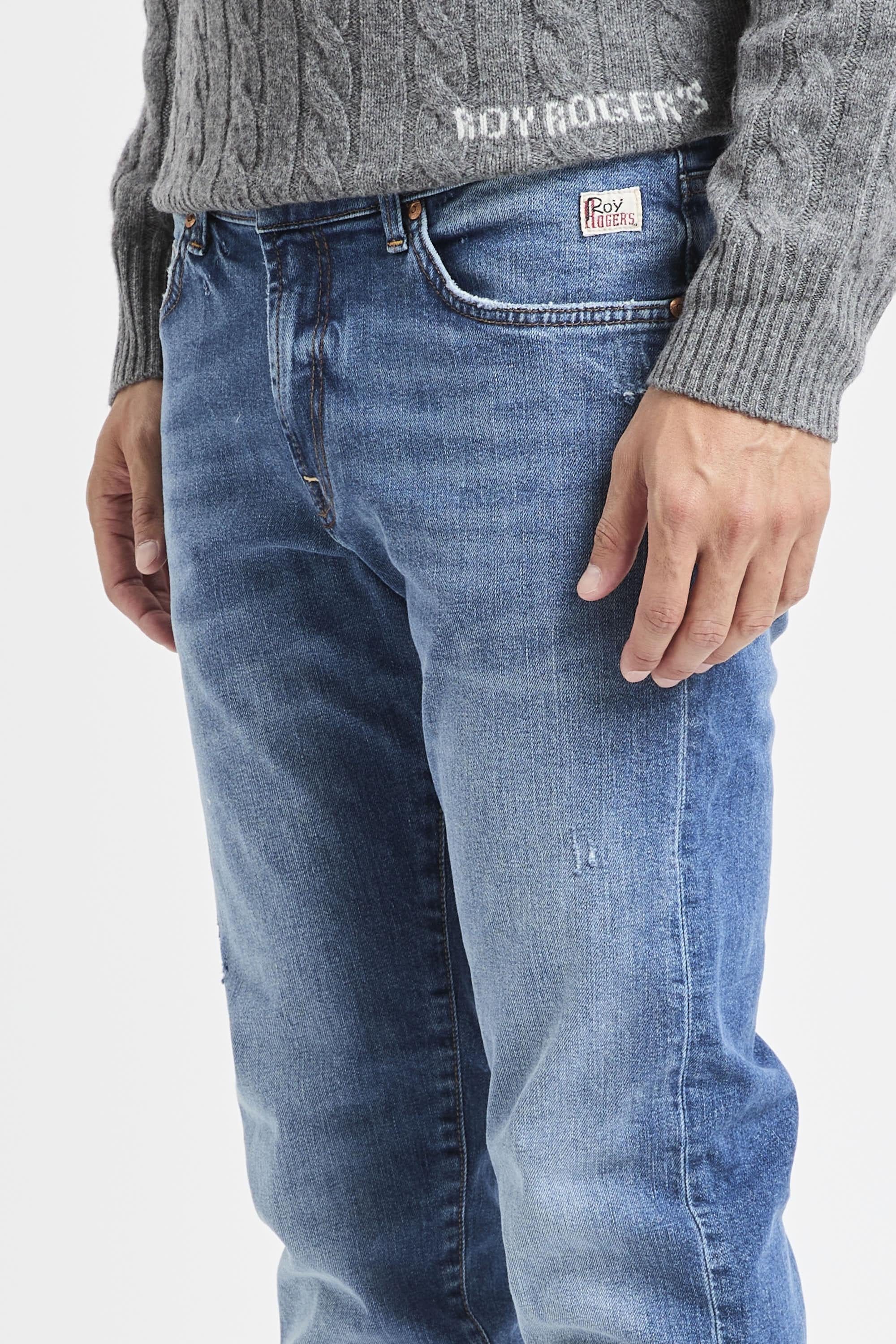 Jeans in denim con lavaggio medio e leggere baffature sul fronte, impunture in contrasto. Vita media con passanti e salpa applicata sul retro. Chiusura sul fronte con bottone logato e zip. Due tasche sul fronte e due tasche sul retro con label Roy Roger's applicato. Slim fit. Il modello è alto 187 cm e indossa la taglia 33. Made in Italy.