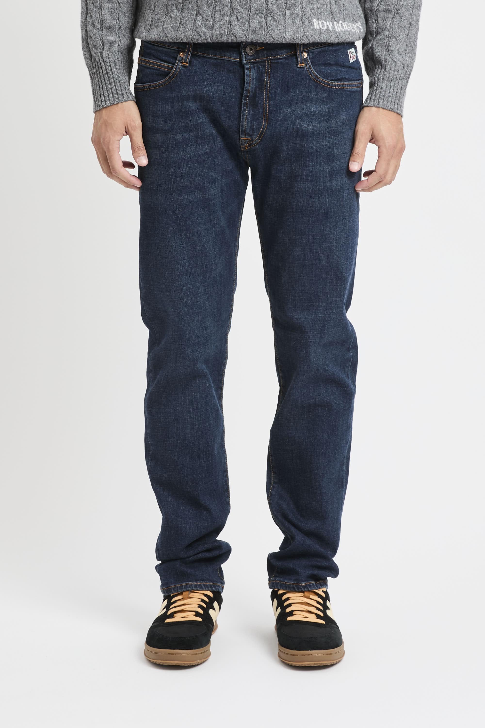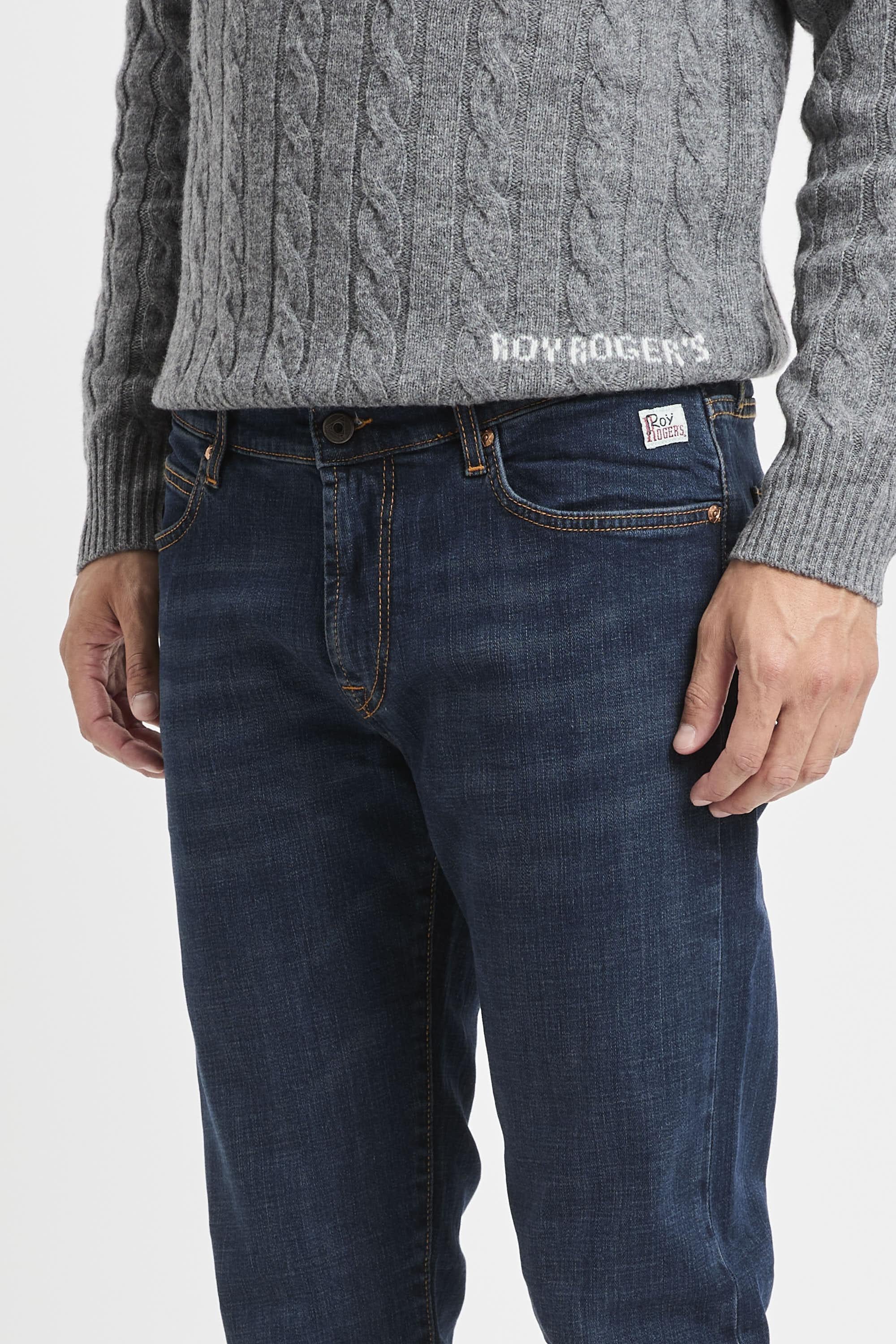 Jeans in denim con lavaggio scuro e impunture in contrasto. Vita media con passanti e salpa applicata sul retro. Chiusura sul fronte con bottone logato e zip. Due tasche sul fronte e due tasche sul retro con label Roy Roger's applicato. Slim fit. Il modello è alto 187 cm e indossa la taglia 33. Made in Italy.
