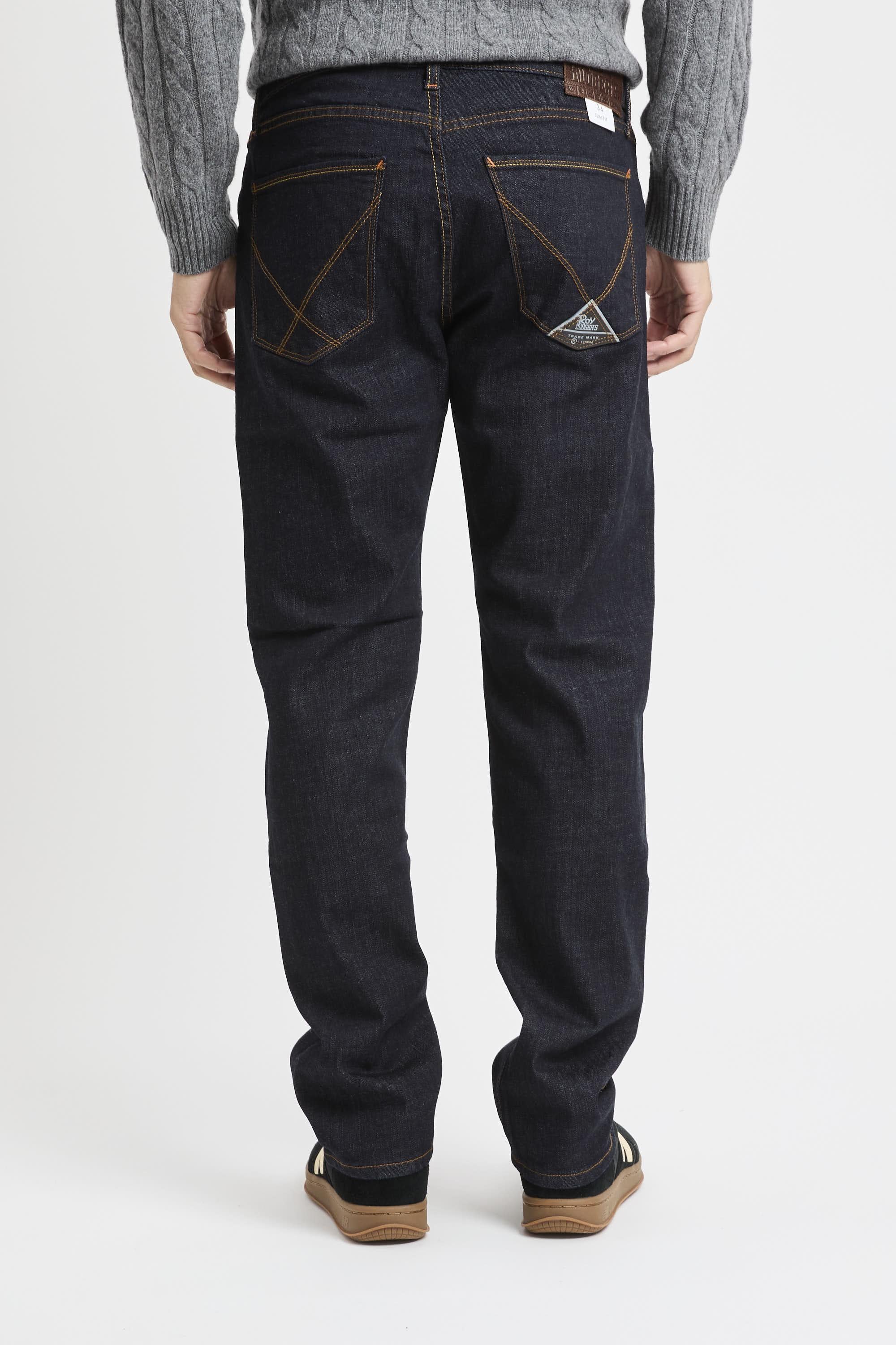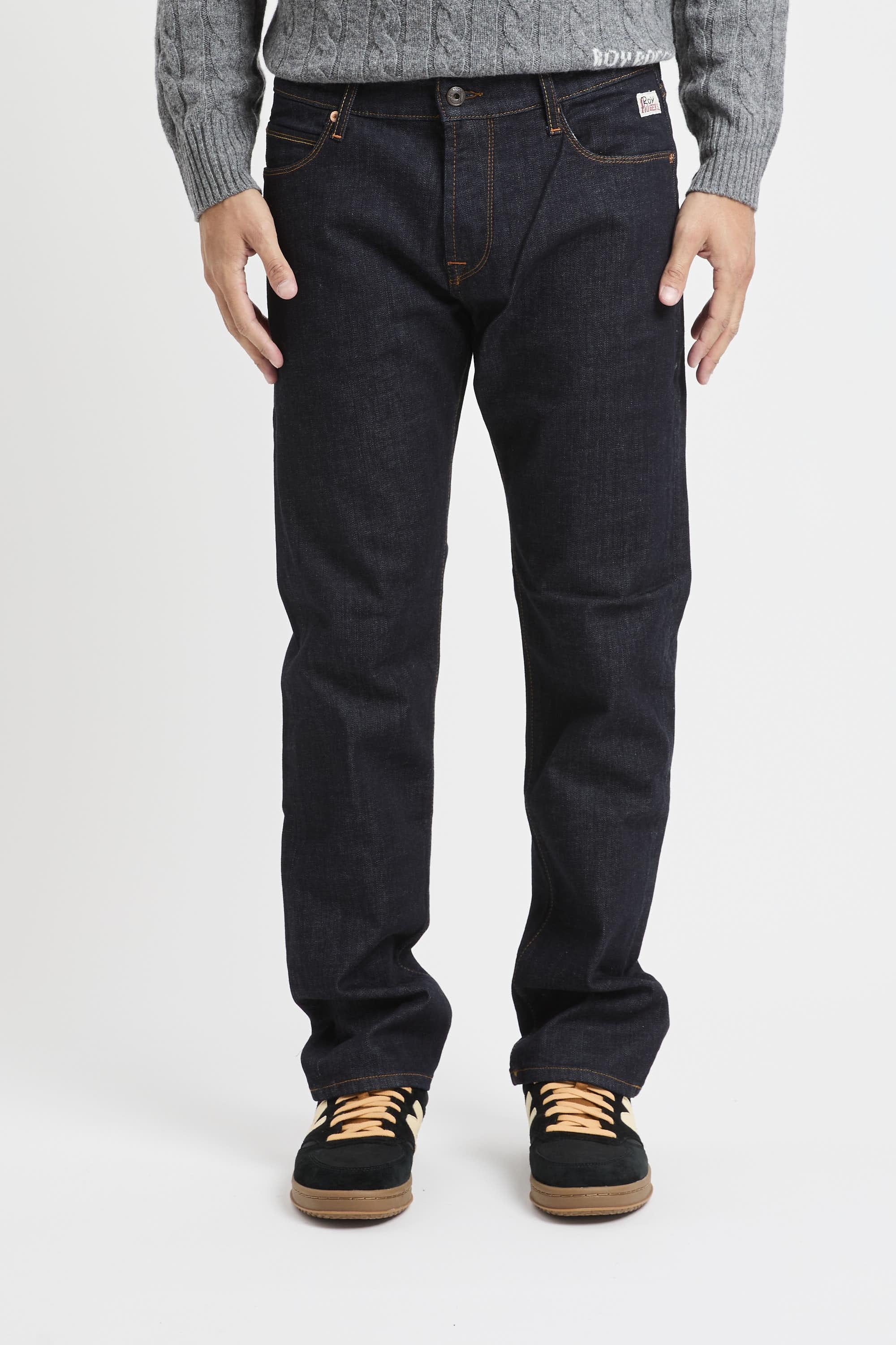 Jeans in denim con lavaggio scuro e impunture in contrasto. Vita media con passanti e salpa applicata sul retro. Chiusura sul fronte con bottone logato e zip. Due tasche sul fronte e due tasche sul retro con label Roy Roger's applicato. Slim fit. Il modello è alto 187 cm e indossa la taglia 33. Made in Italy.