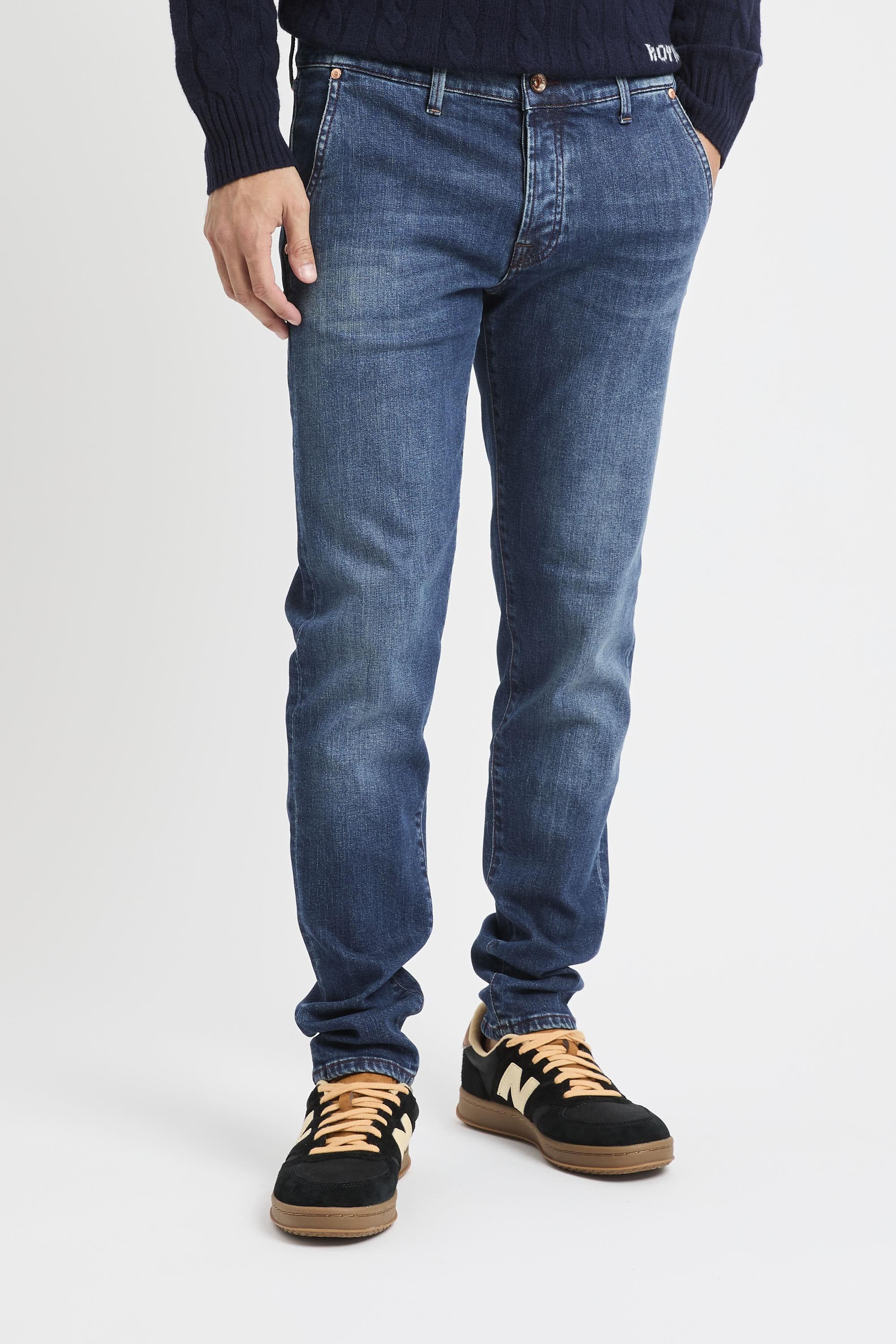 Jeans in denim washed con lavaggio scuro e leggere baffature sul fronte, impunture in contrasto. Vita media con passanti e salpa applicata sul retro. Chiusura sul fronte con bottone logato e zip. Due tasche all'americana sul fronte e due tasche sul retro con label Roy Roger's applicato. Slim fit. Il modello è alto 187 cm e indossa la taglia 33. Made in Italy.