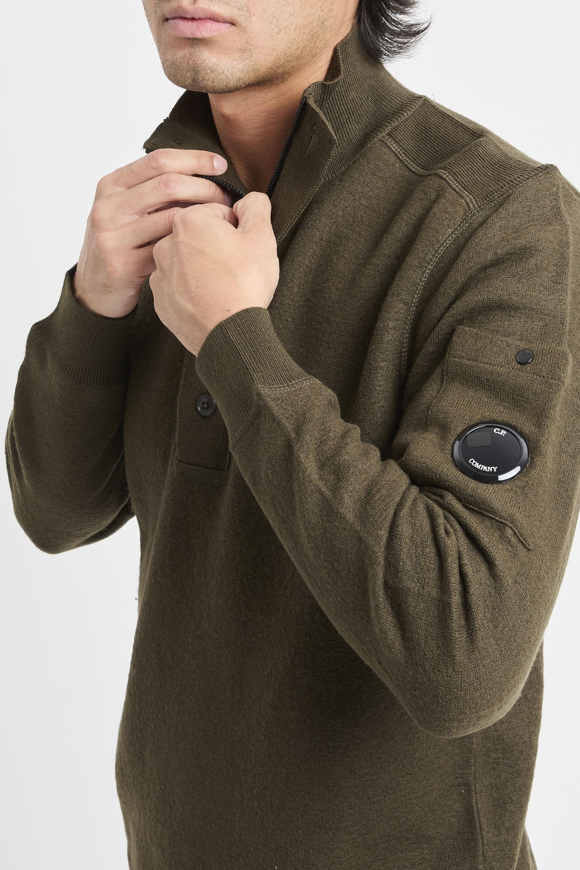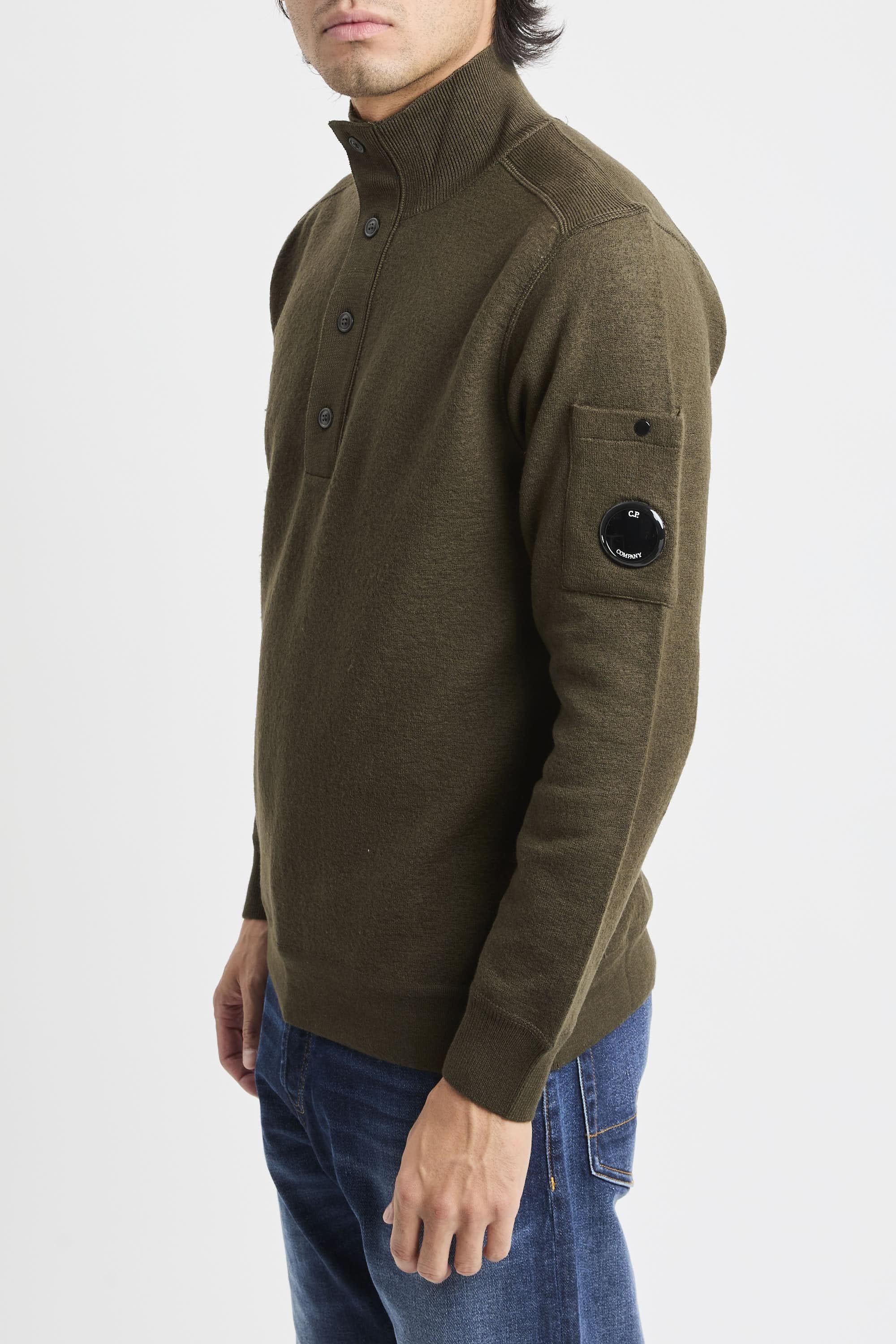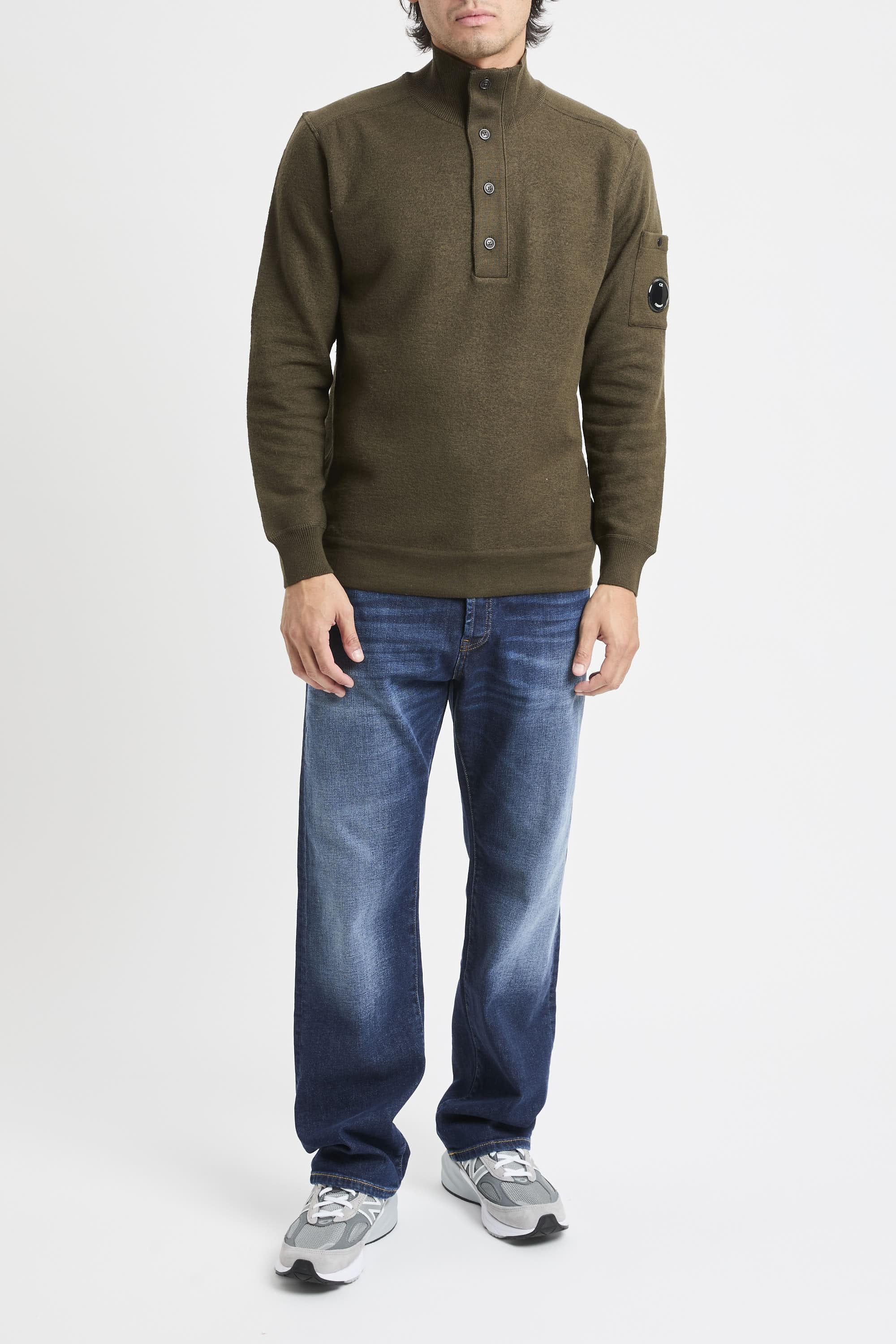 Maglione con mezza abbottonatura infeltrito in lana merino. Collo alto a costine e polsini a costine. Taschino con lente. Finezza 12. Regular fit. Il modello è alto 187cm e indossa la taglia L.