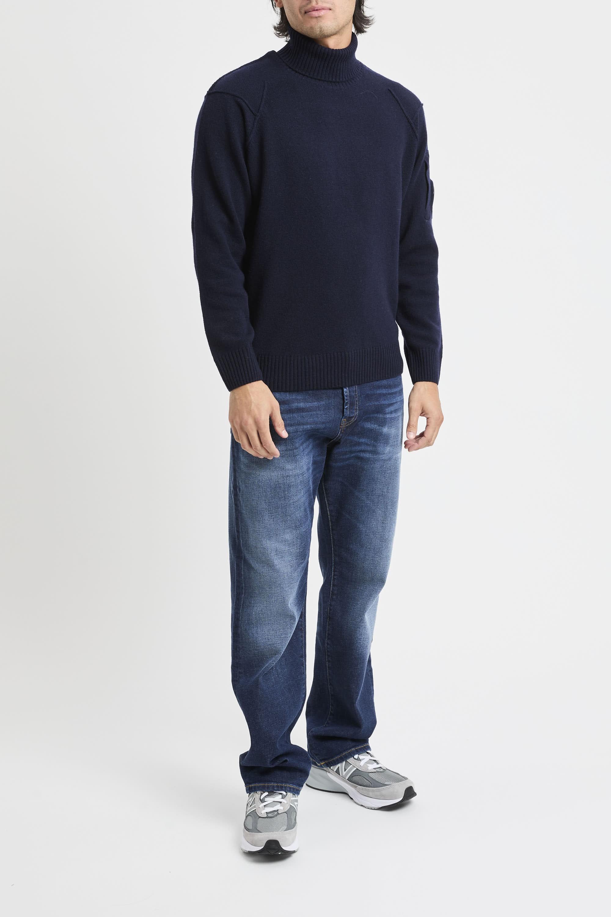 Maglione collo alto realizzato in Lambswool GRS. Global Recycled Standard certifica l'uso di prodotti nel rispetto di criteri ambientali e sociali estesi a tutte le fasi della filiera produttiva. Fondo, collo e polsini a costine, e scomparto sulla manica con C.P. Company Lens. Finezza 7. Regular fit. Il modello è alto 187cm e indossa la taglia L.