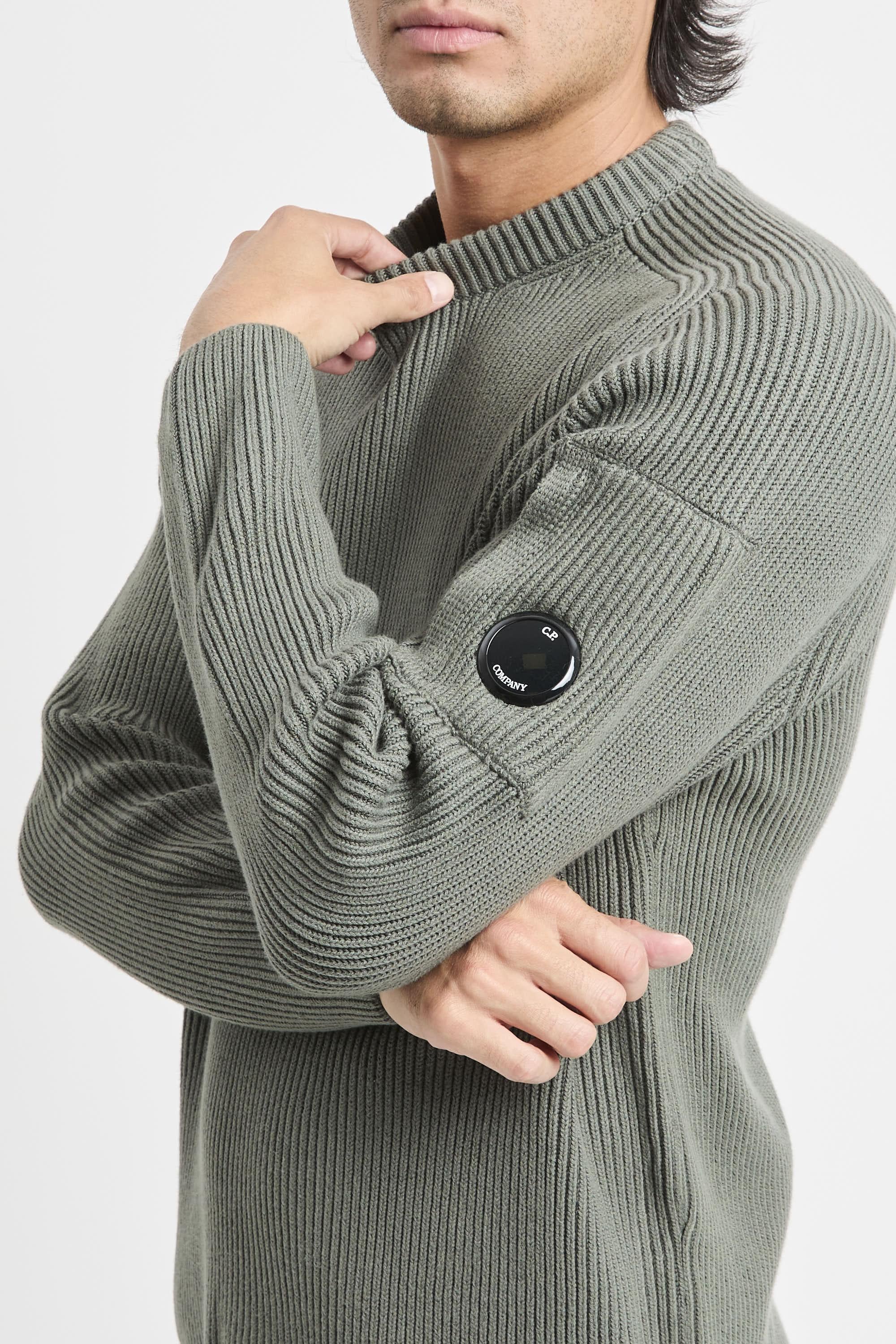 Maglione girocollo con lavorazione a costine e C.P. Company Lens, realizzato in cotone misto nylon elasticizzato. Taschino con lente sulla manica. Finezza 7. Regular fit. Il modello è alto 187cm e indossa la taglia L.