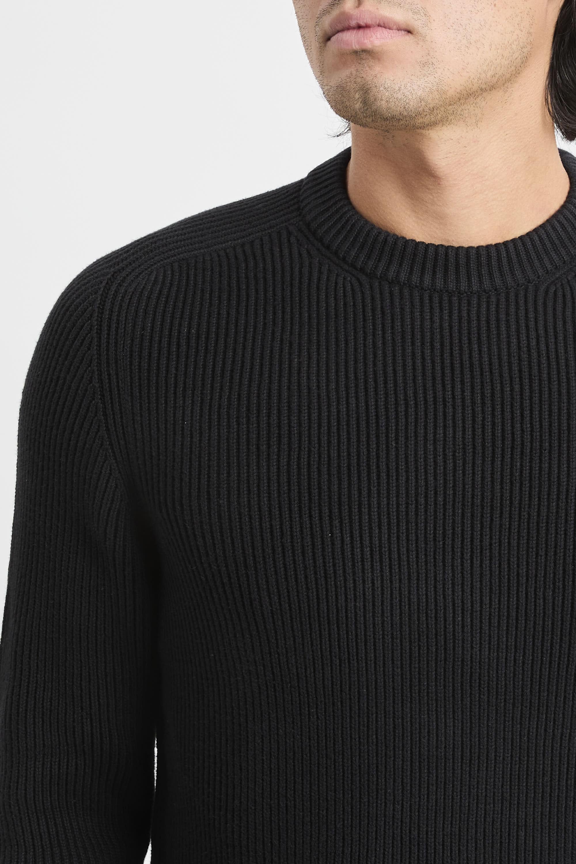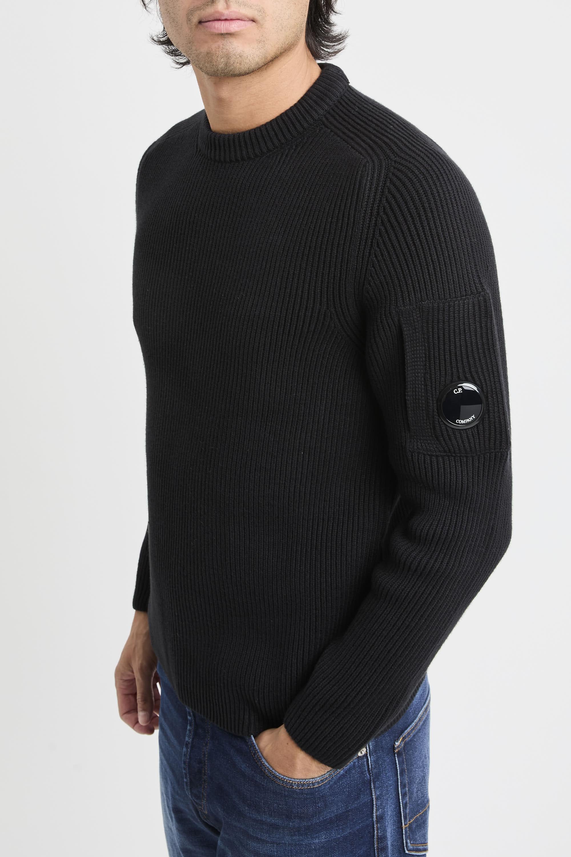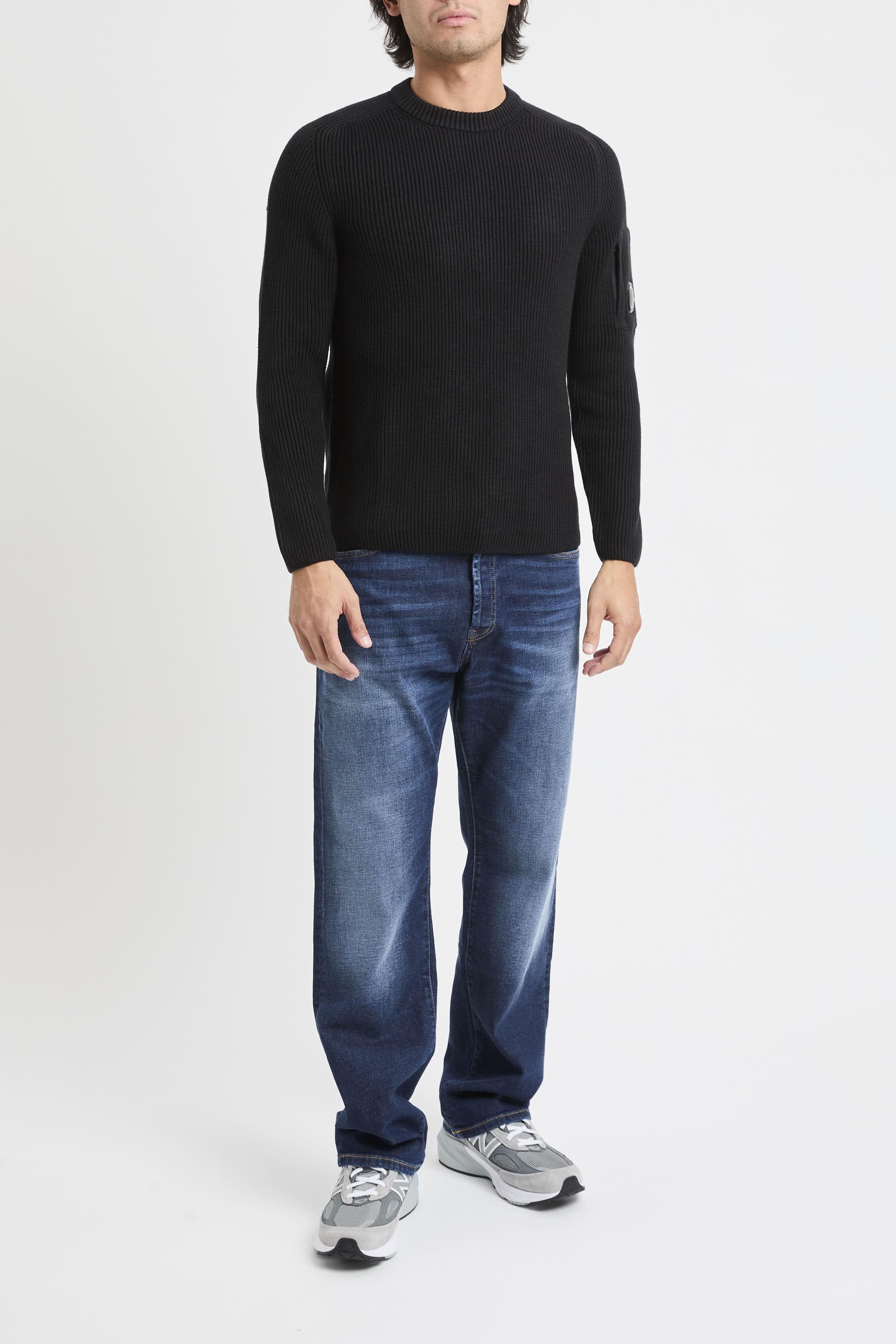 Maglione girocollo con lavorazione a costine e C.P. Company Lens, realizzato in cotone misto nylon elasticizzato. Taschino con lente sulla manica. Finezza 7. Regular fit. Il modello è alto 187cm e indossa la taglia L.