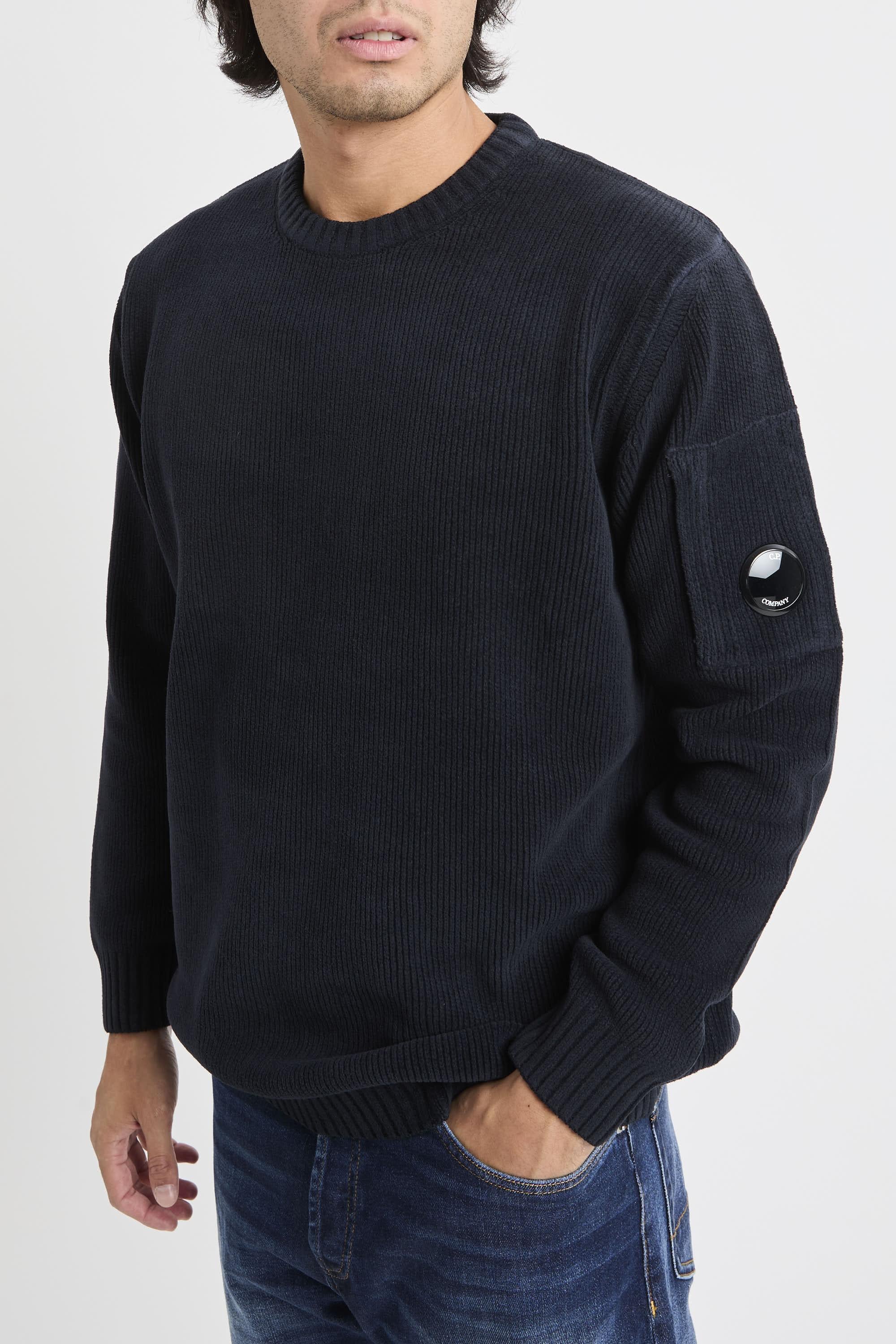 Maglione girocollo realizzato in ciniglia di cotone. Polsini e fondo a costine. Taschino con lente sulla manica. Finezza 7. Regular fit. Il modello è alto 187cm e indossa la taglia L.