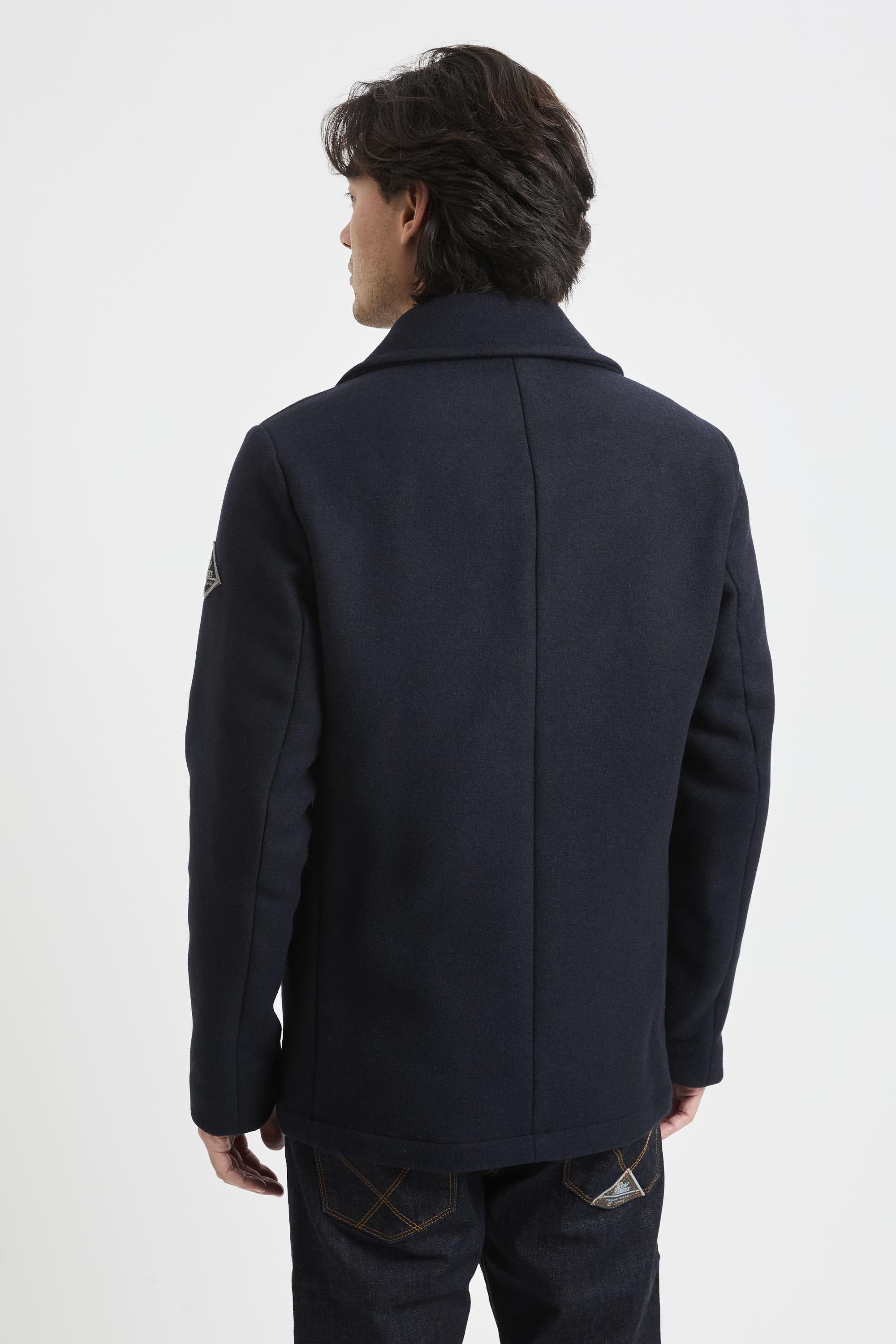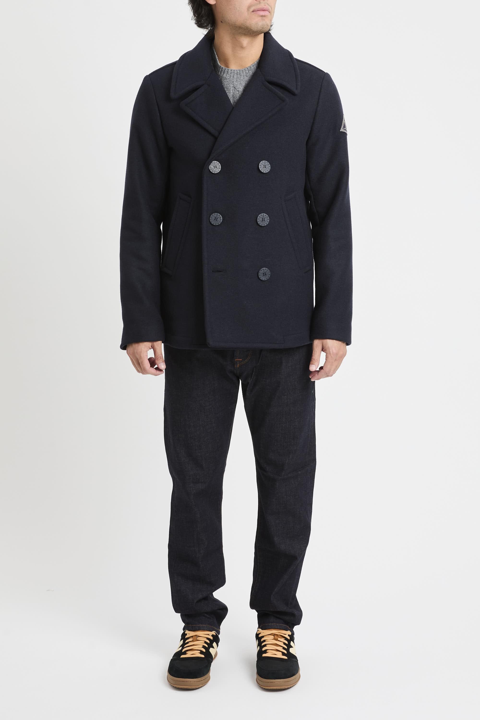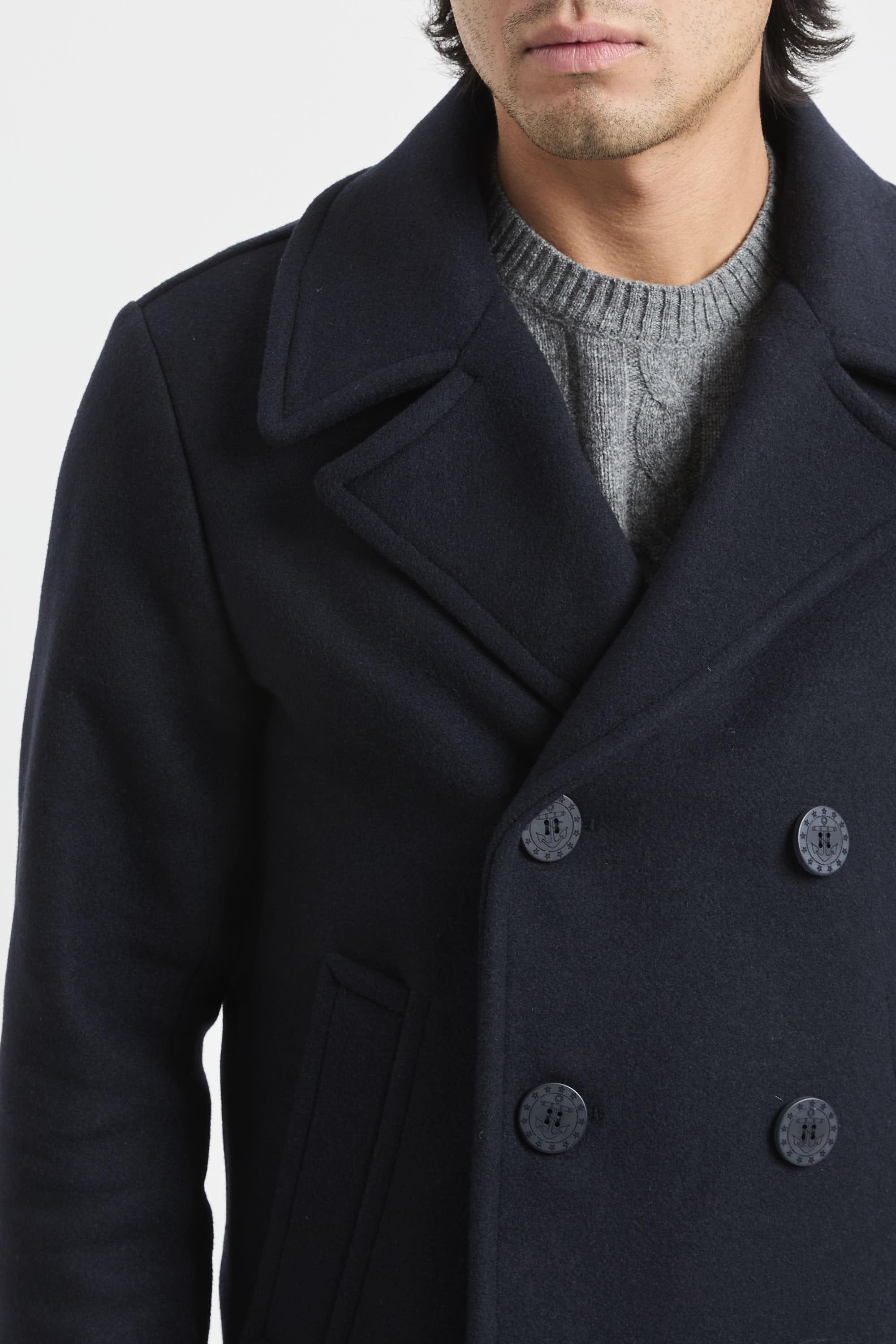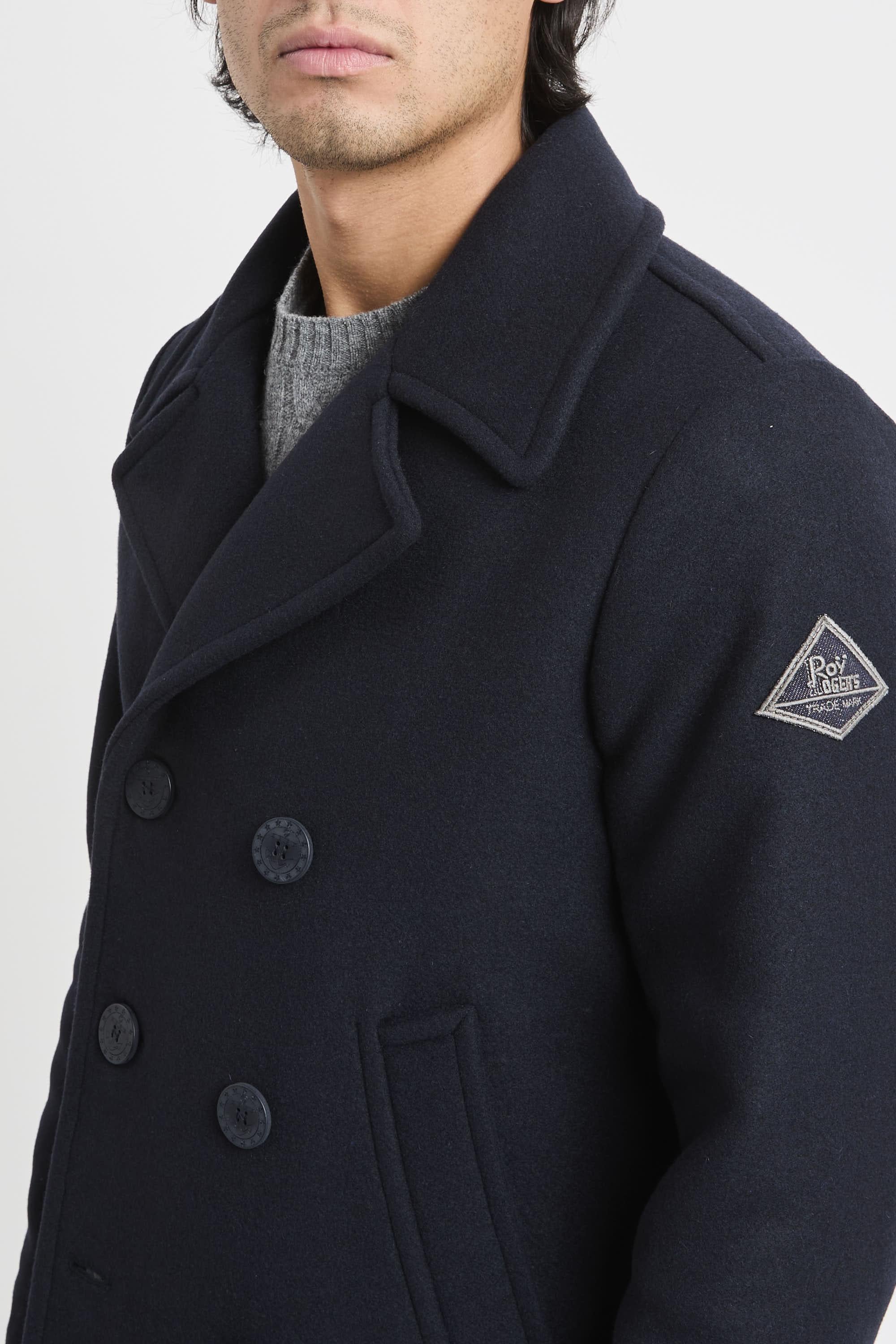 Peacoat Melton in calda lana tinta unita. Colletto classico. Chiusura doppiopetto con bottoni marinier in tono. Tasche oblique sul fronte. Patch Roy Roger's in denim applicata su una manica. Fodera interna in tono. Regular fit. Made in Italy. Il modello è alto 187cm e indossa la taglia L.