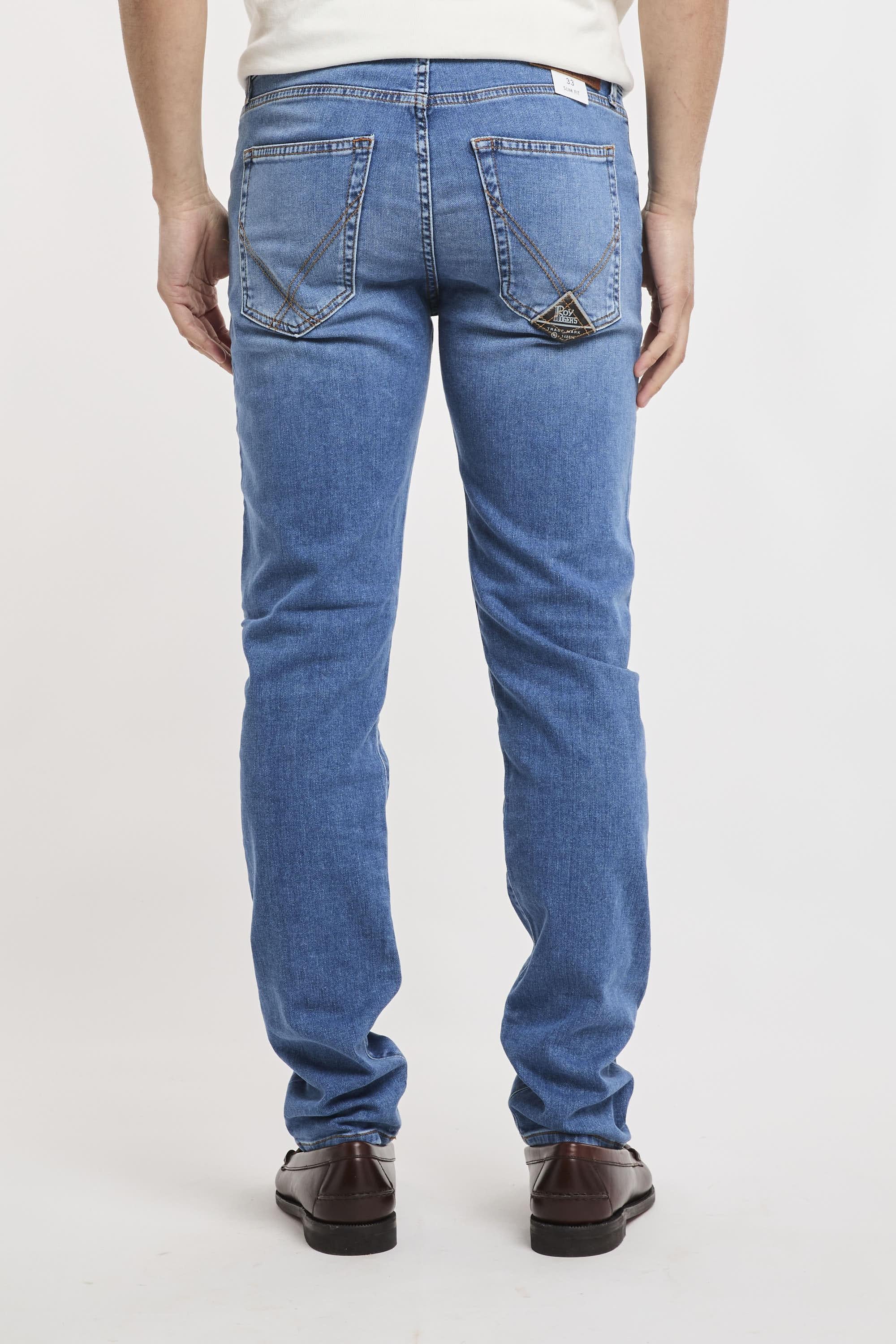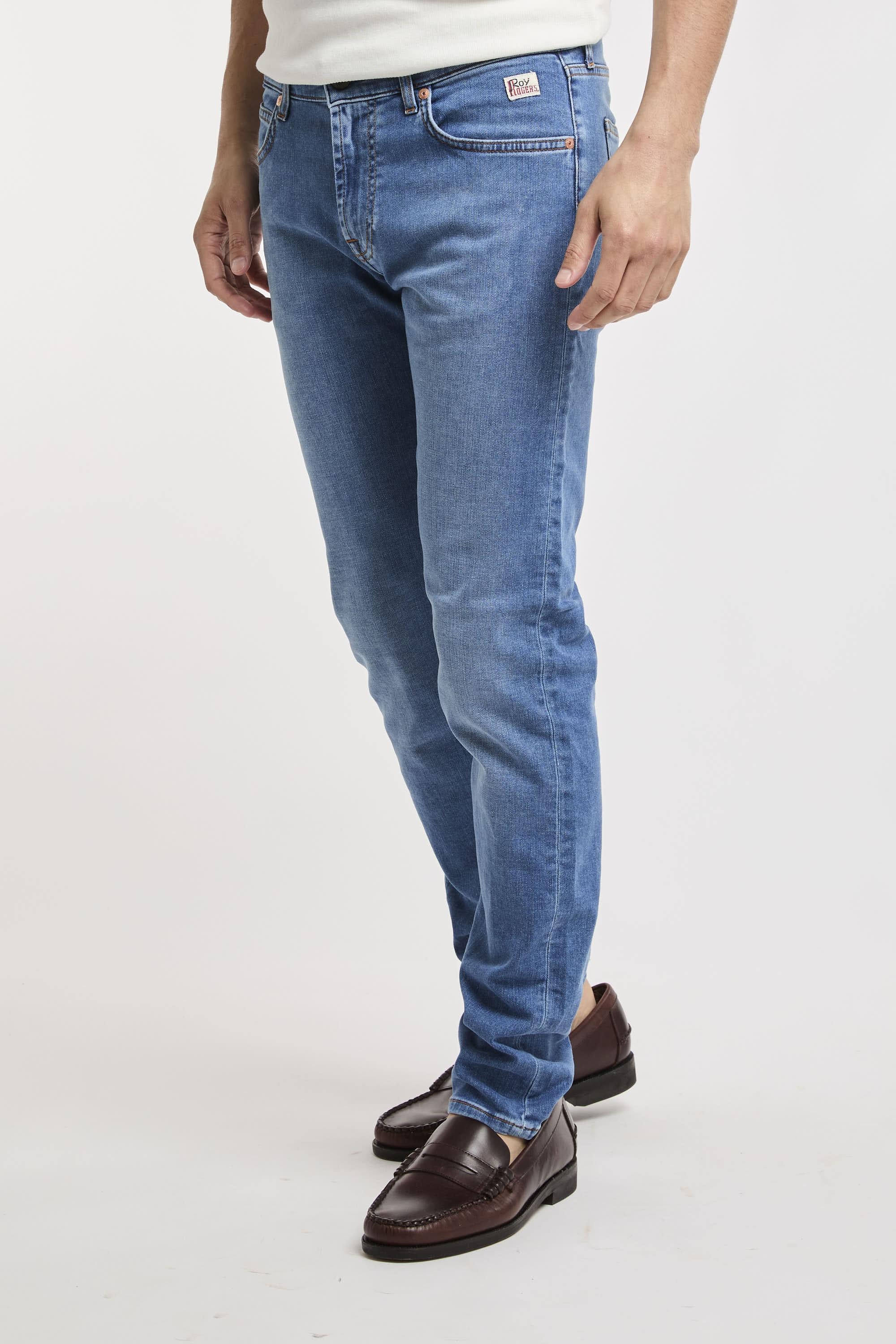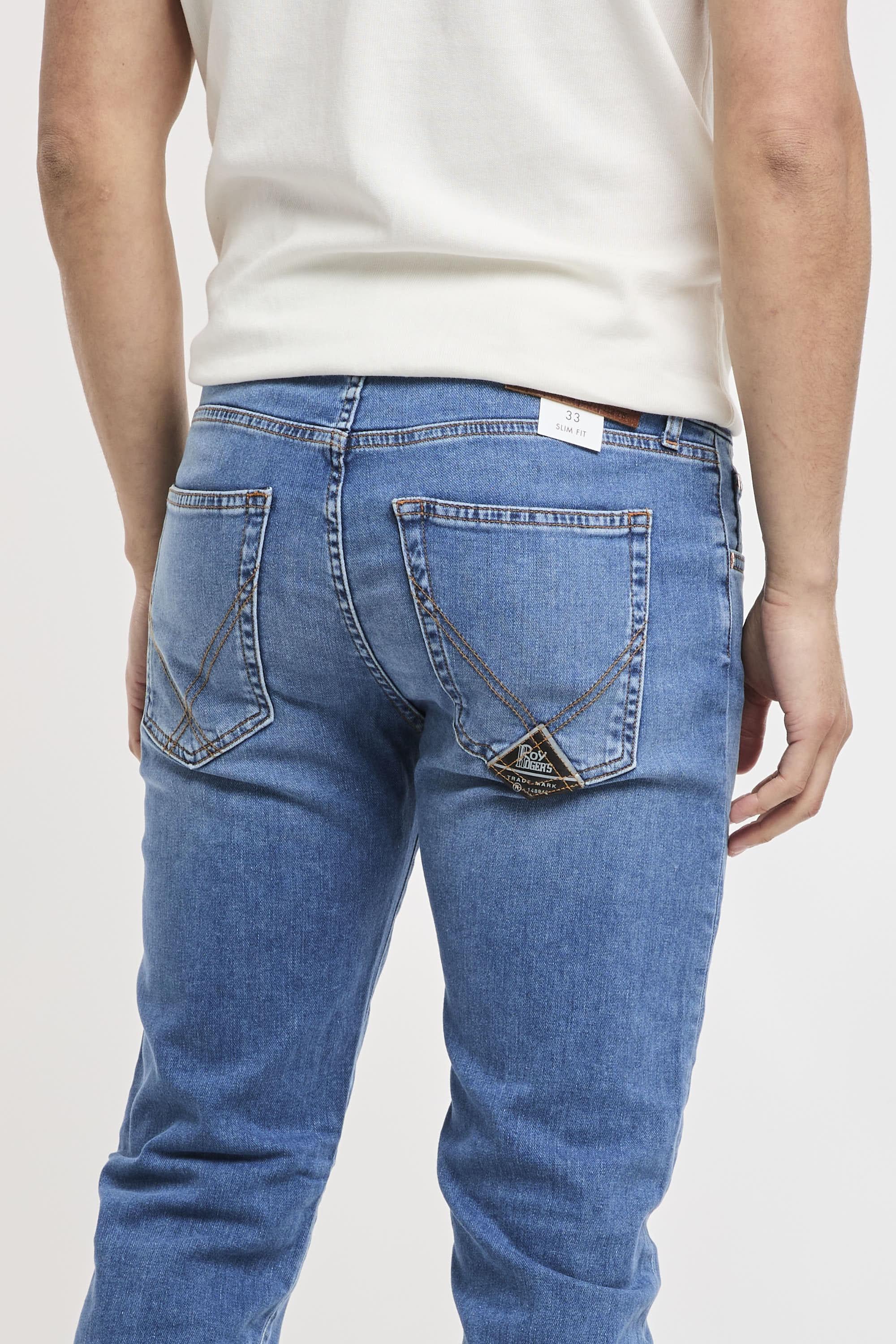 Jeans in denim con lavaggio medio e impunture in contrasto. Vita media con passanti e salpa applicata sul retro. Chiusura sul fronte con bottone logato e zip. Due tasche sul fronte e due tasche sul retro con label Roy Roger's applicato. Slim fit. Il modello è alto 187 cm e indossa la taglia 33. Made in Italy.