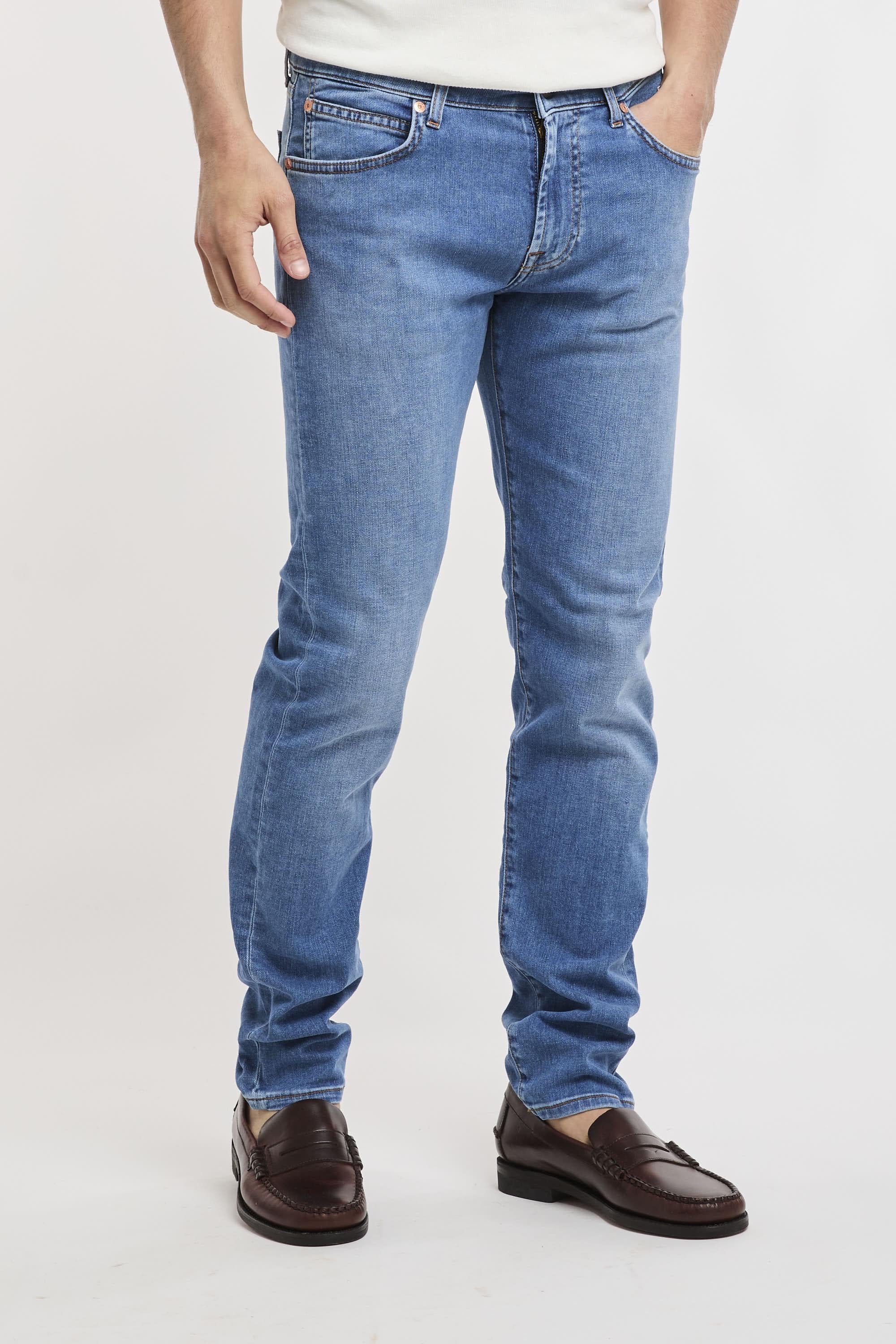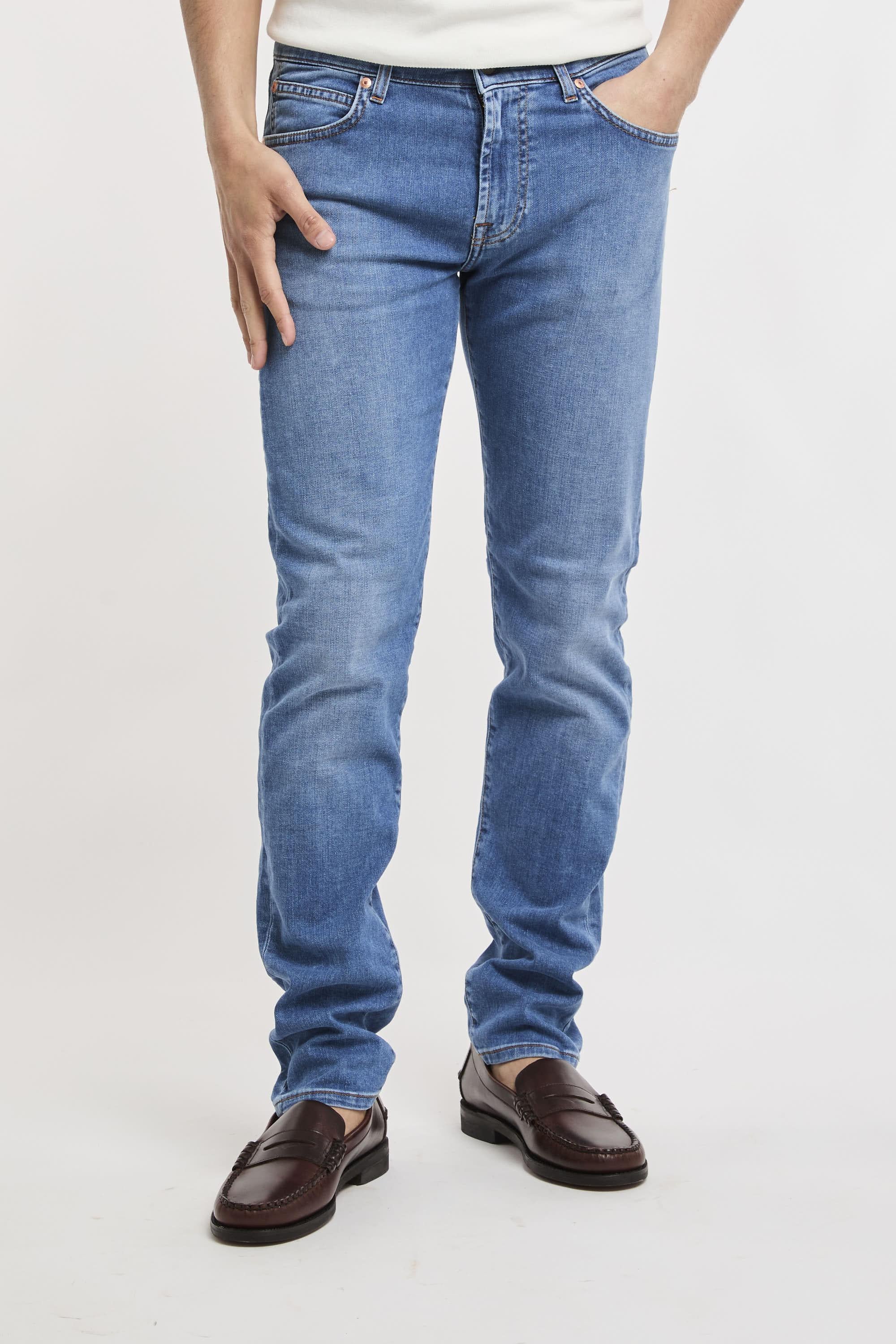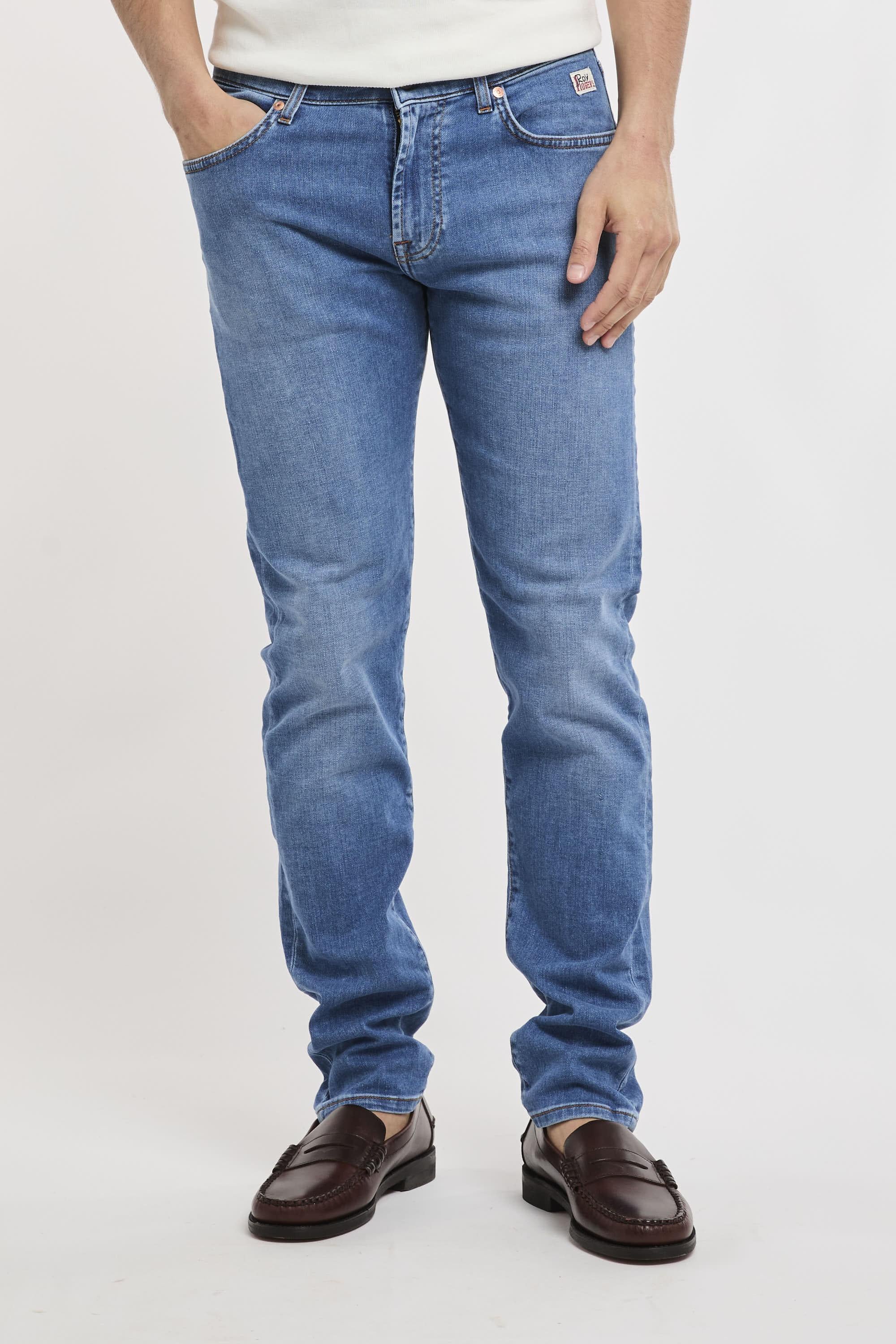 Jeans in denim con lavaggio medio e impunture in contrasto. Vita media con passanti e salpa applicata sul retro. Chiusura sul fronte con bottone logato e zip. Due tasche sul fronte e due tasche sul retro con label Roy Roger's applicato. Slim fit. Il modello è alto 187 cm e indossa la taglia 33. Made in Italy.