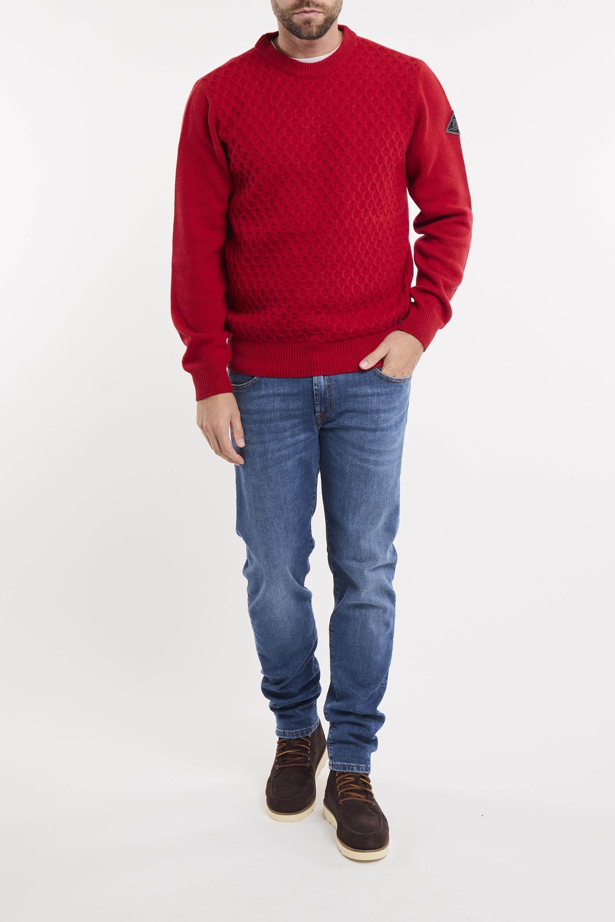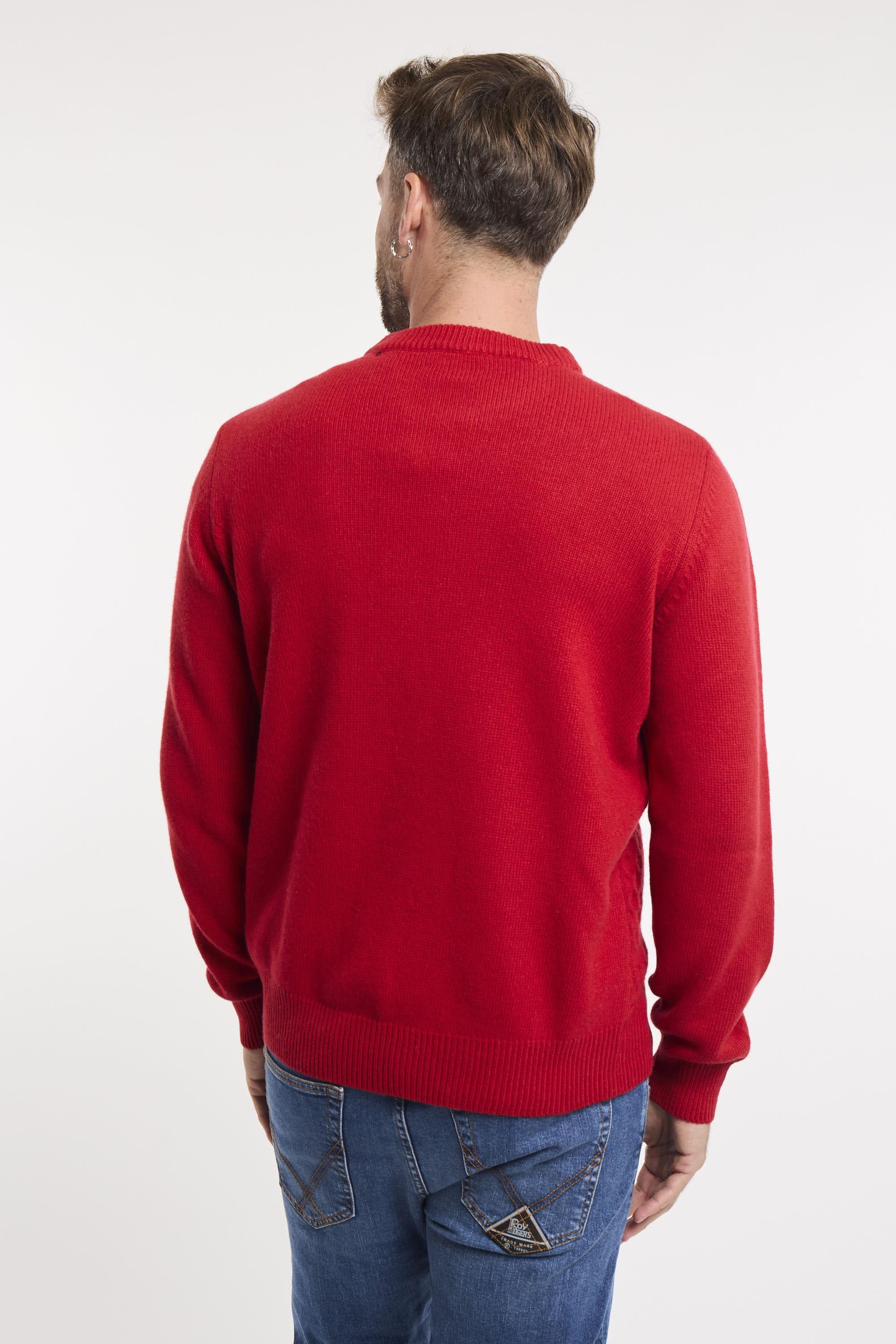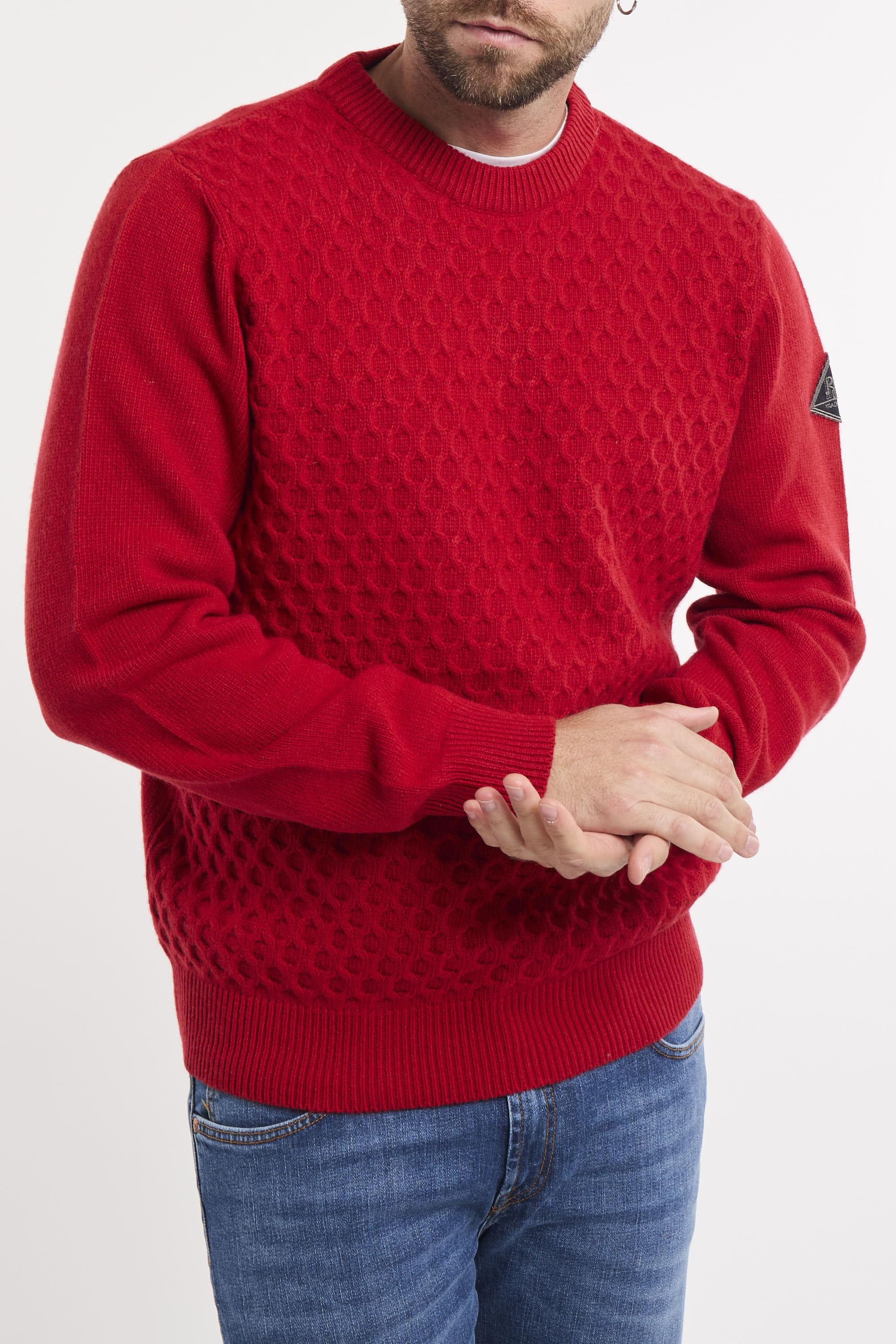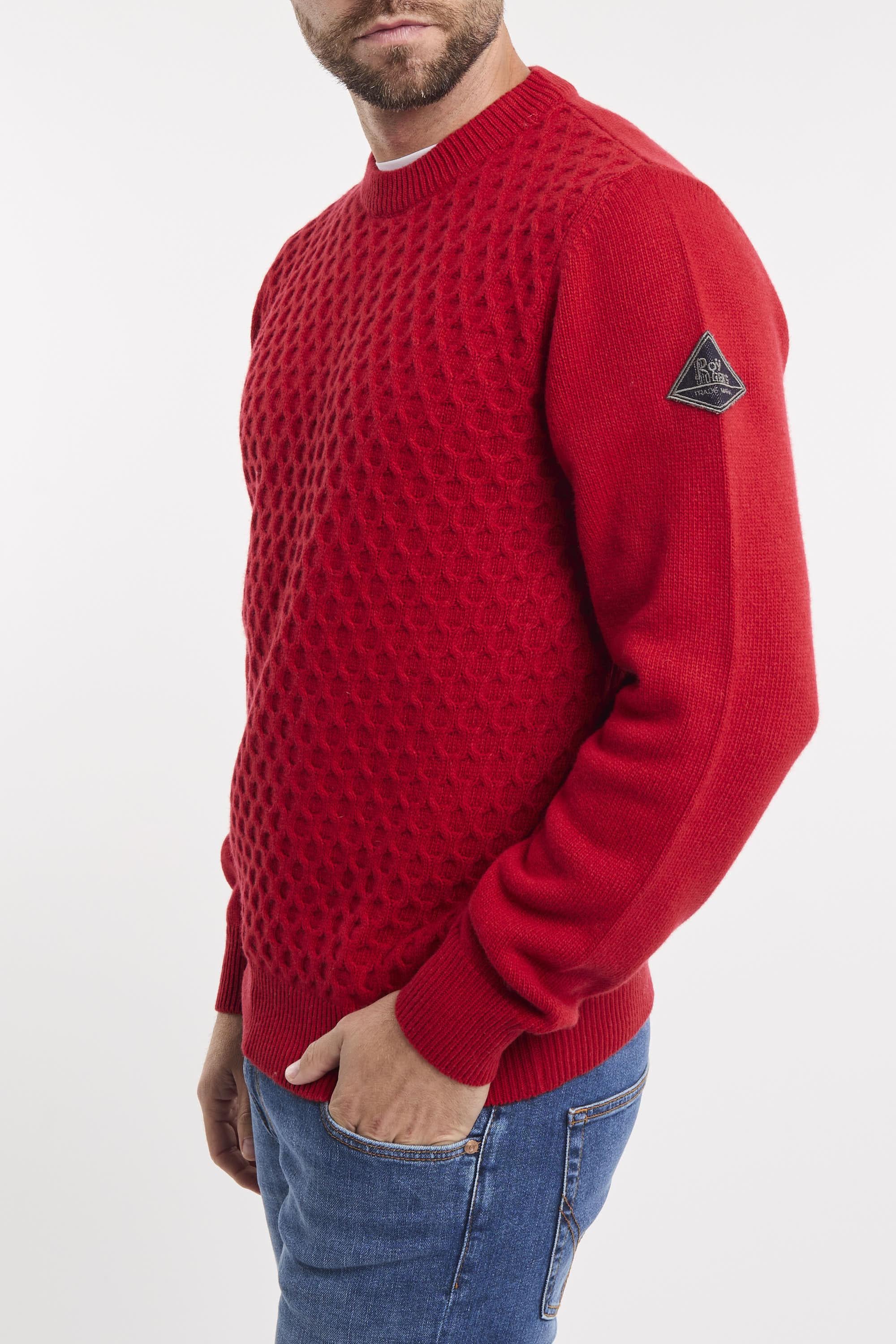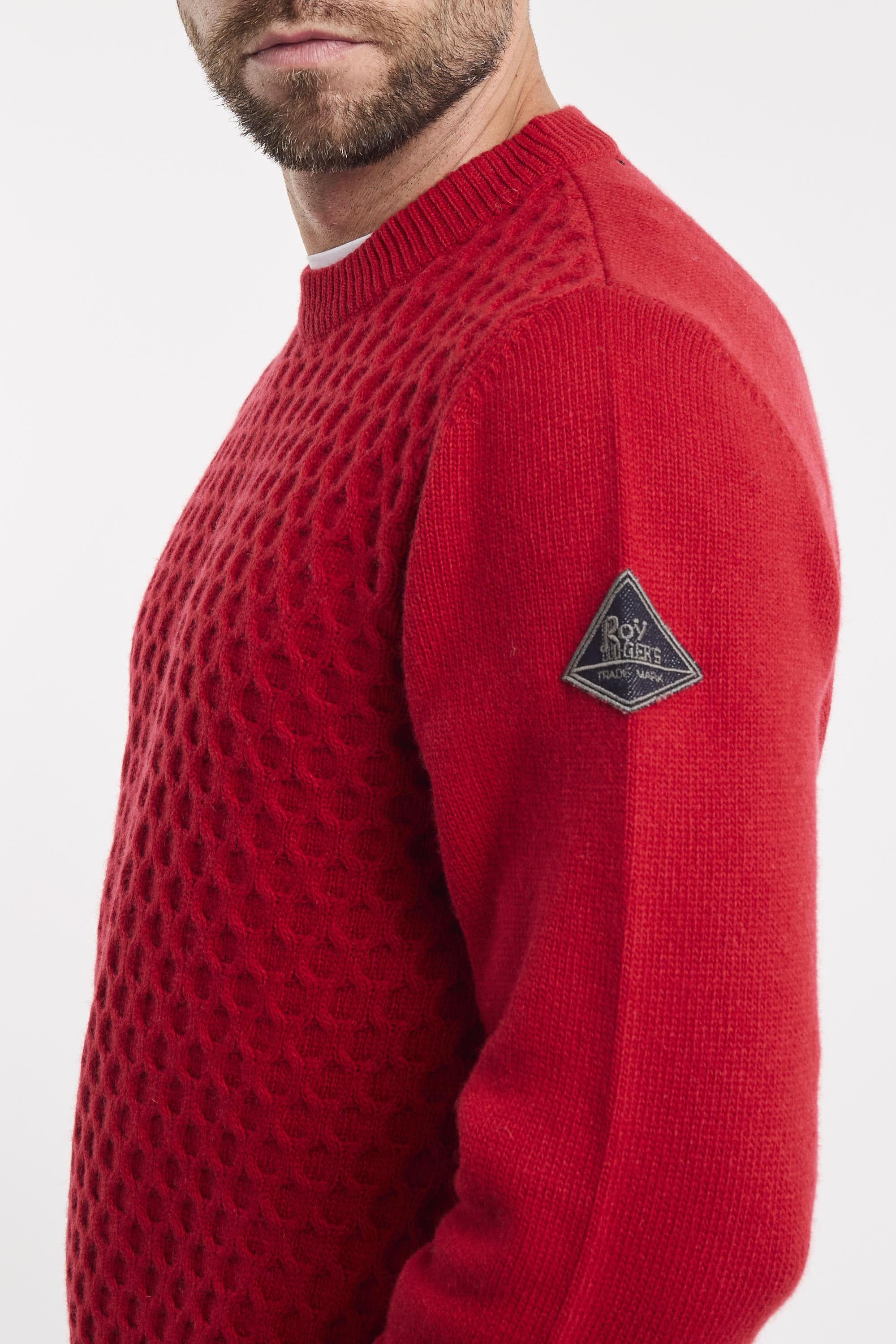 Maglia girocollo in lana e cashmere tinta unita. Lavorazione mini rombo. Collo, polsini e fondo maglia a costine. Patch Roy Roger's in denim applicata sulla manica sinistra. Regular fit. Made in Italy. Il modello è alto 187cm e indossa la taglia L.