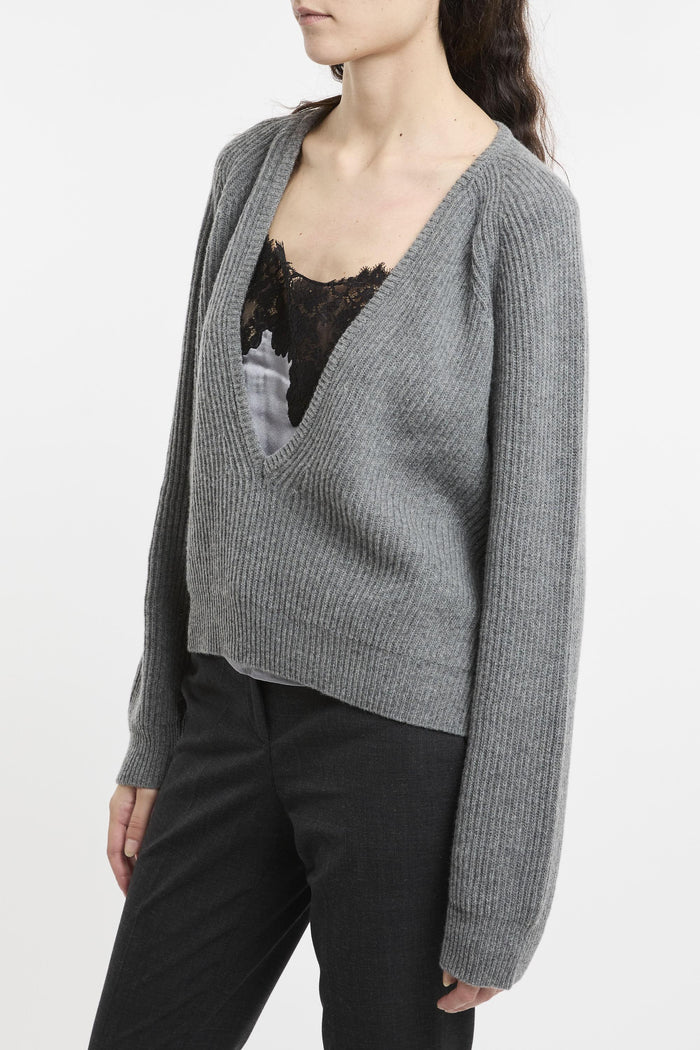 Maglia in misto lana. Modello scollato a V, inserto in envers satin e pizzo. Manica raglan. Vestibilità regular, lunghezza bacino. Made in Italy. La modella è alta 178 cm e indossa la taglia S.