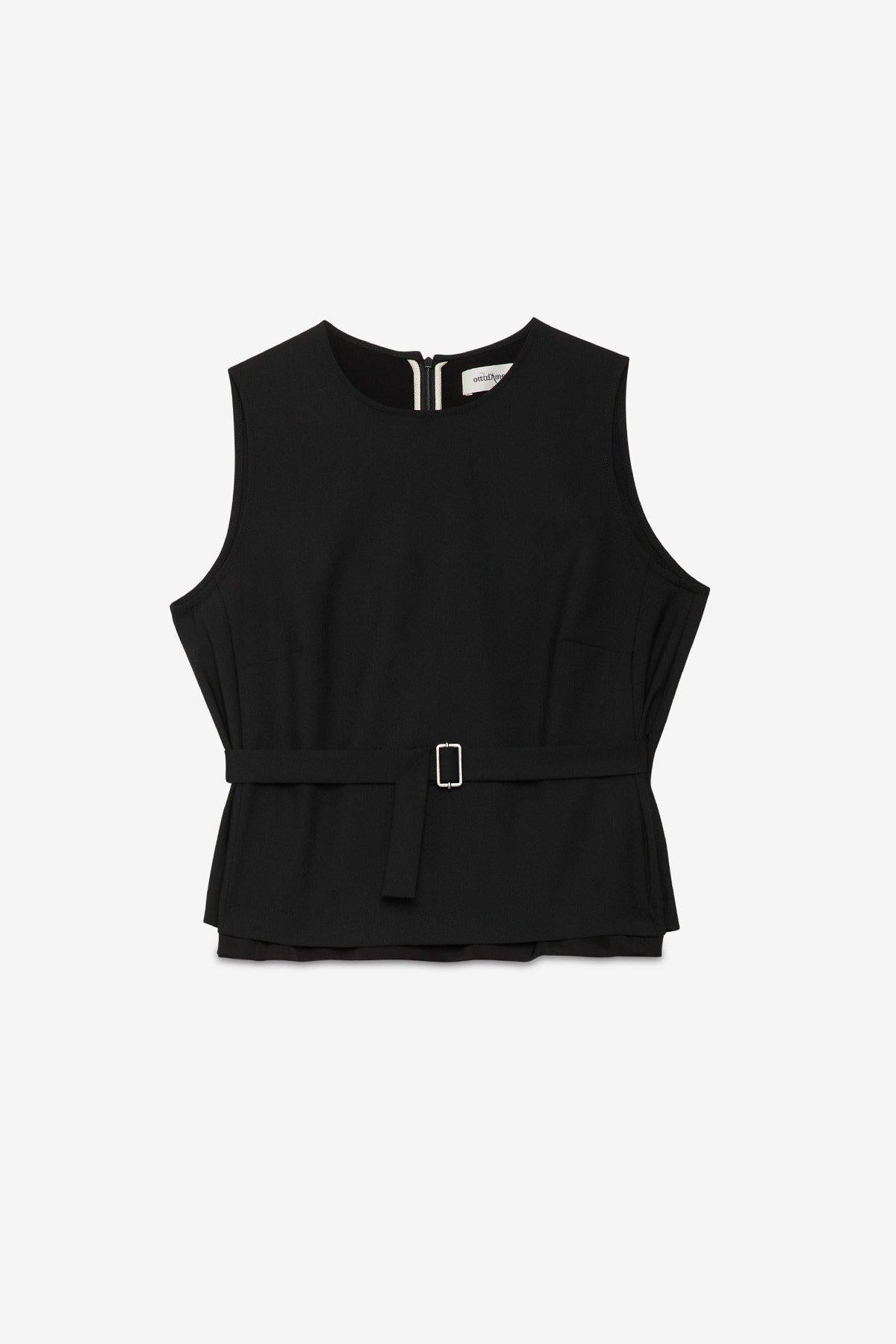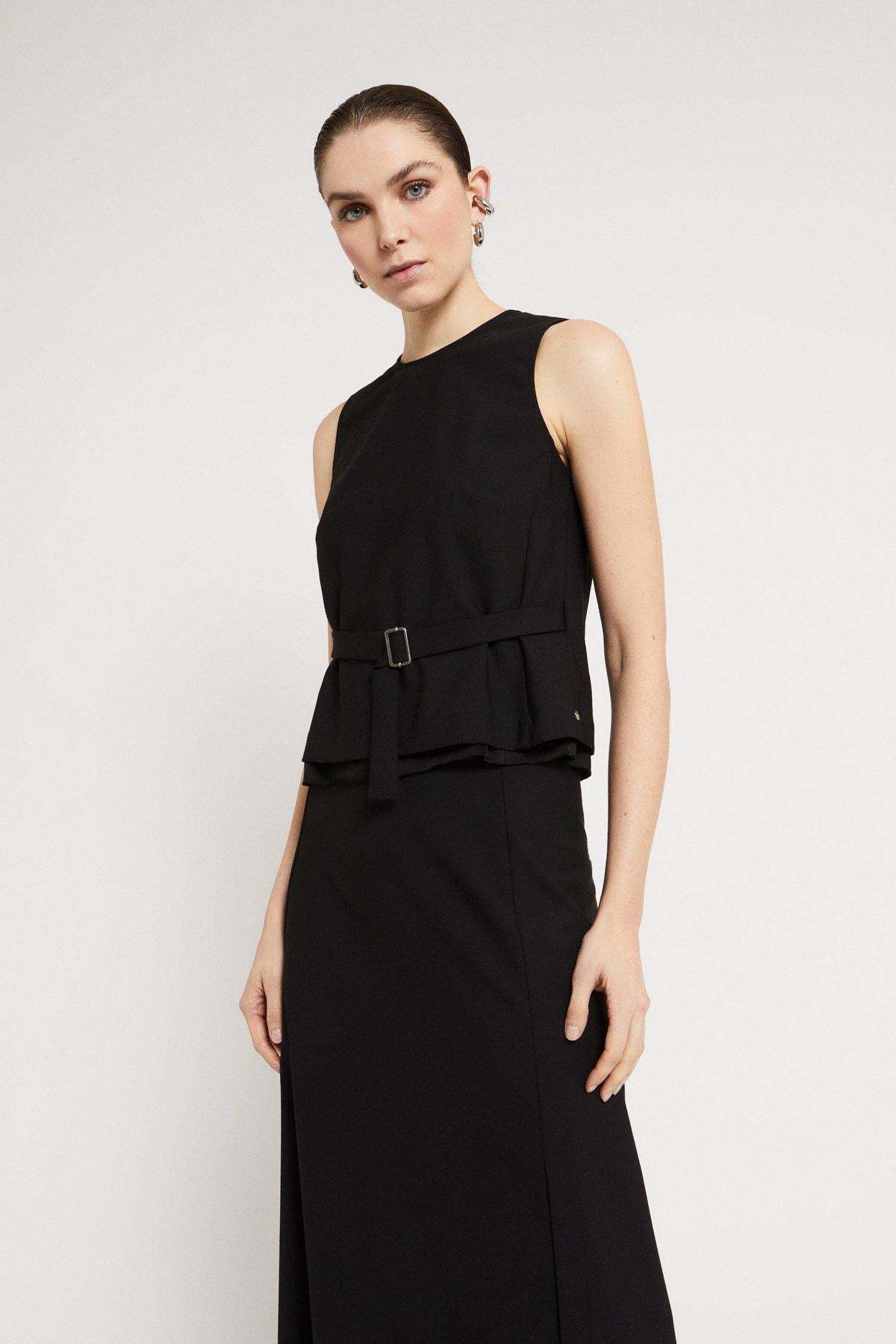 Top in misto lana con cintura e fibbia gioiello. La modella è alta 178 cm e indossa la taglia 40.