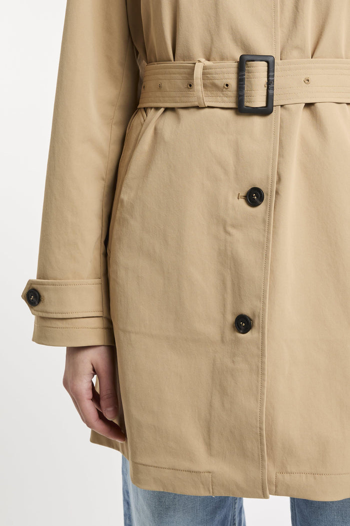 Trench Verve realizzato in gabardina traspirante e leggera. Chiusura centrale con bottoni logati. Due tasche a filo laterali. Manica lunga con cinturino regolabile. Badge tondo in nuance applicato sulla manica. Cintura con fibbia removibile. La modella è alta 178 cm e indossa la taglia I.