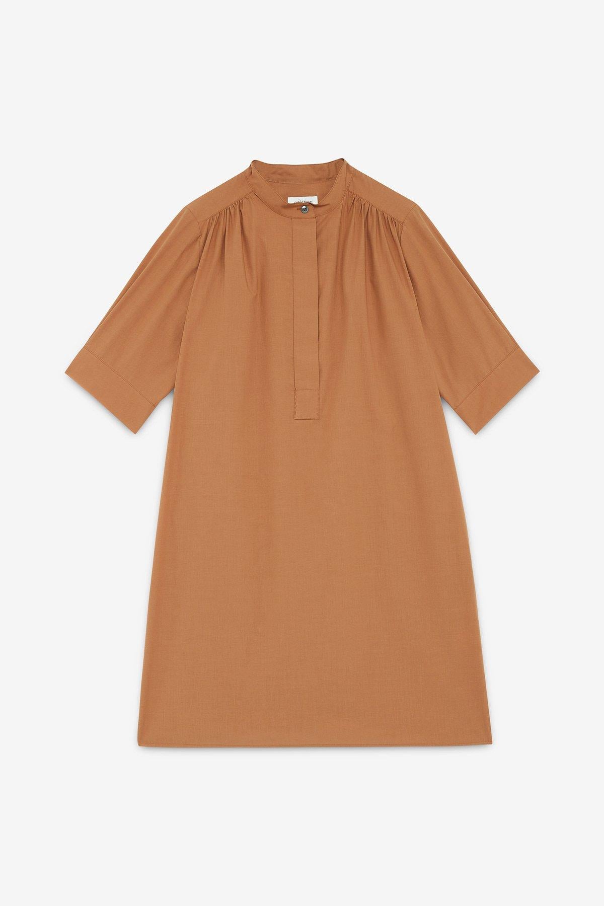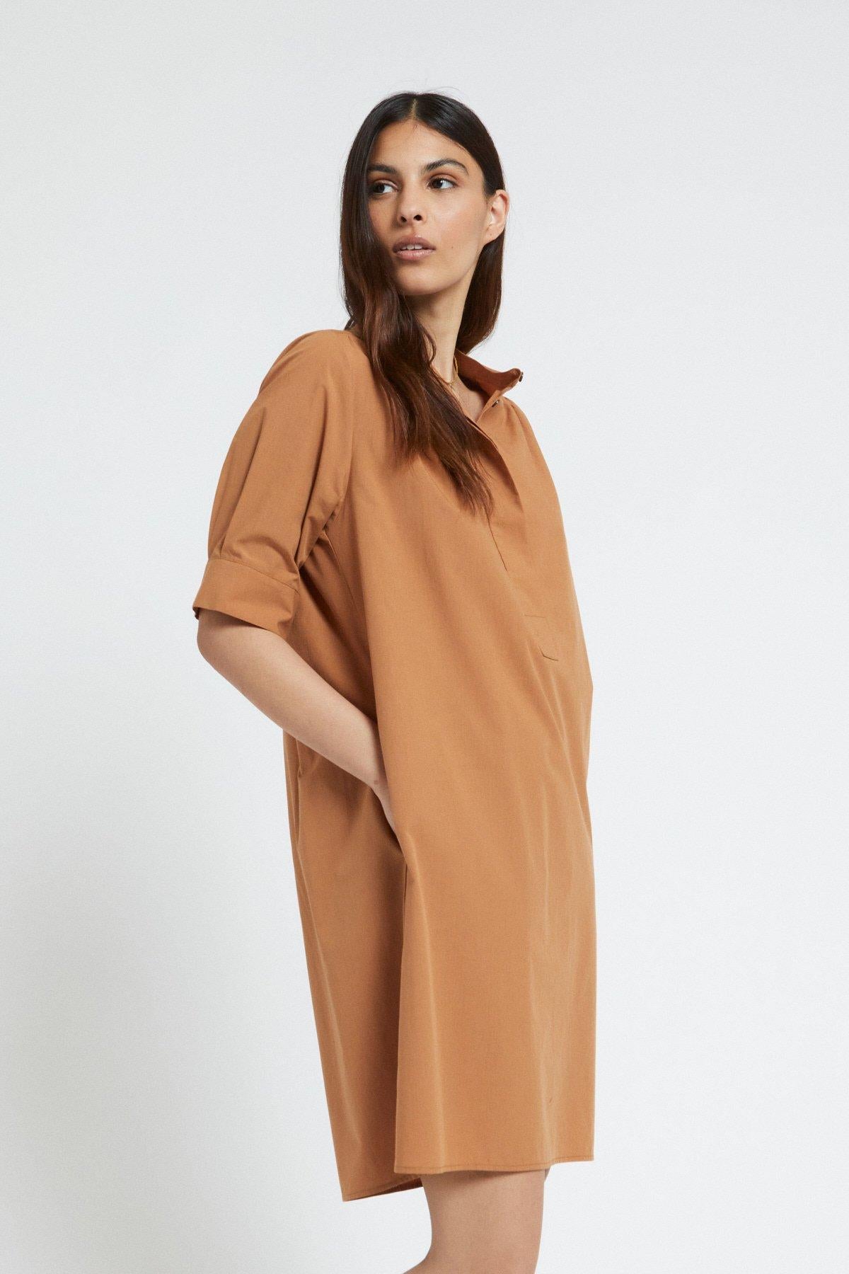 Abito corto in 100% popeline con collo coreano e manica 3/4. La modella è alta 178 cm e indossa la taglia 40.