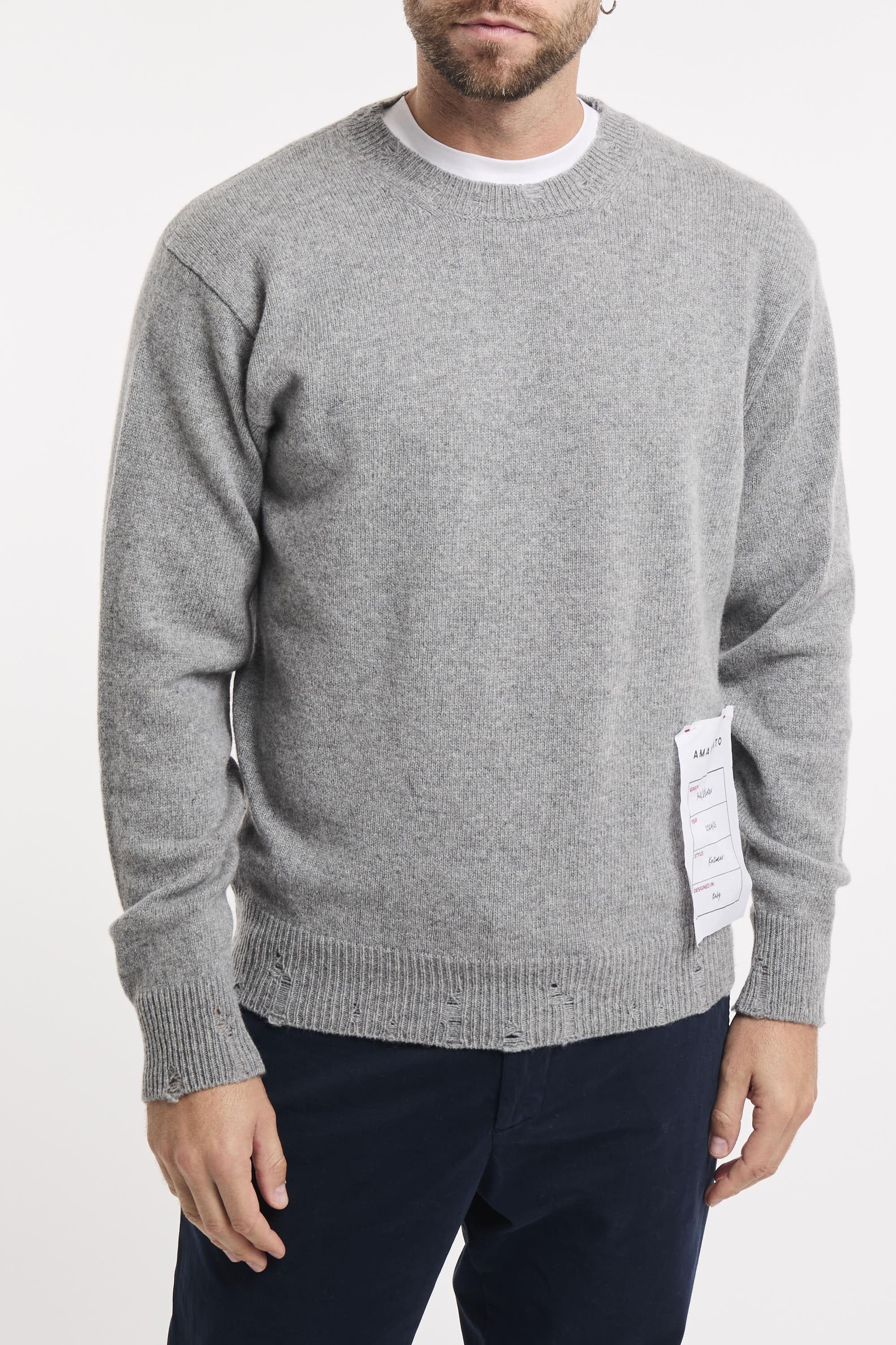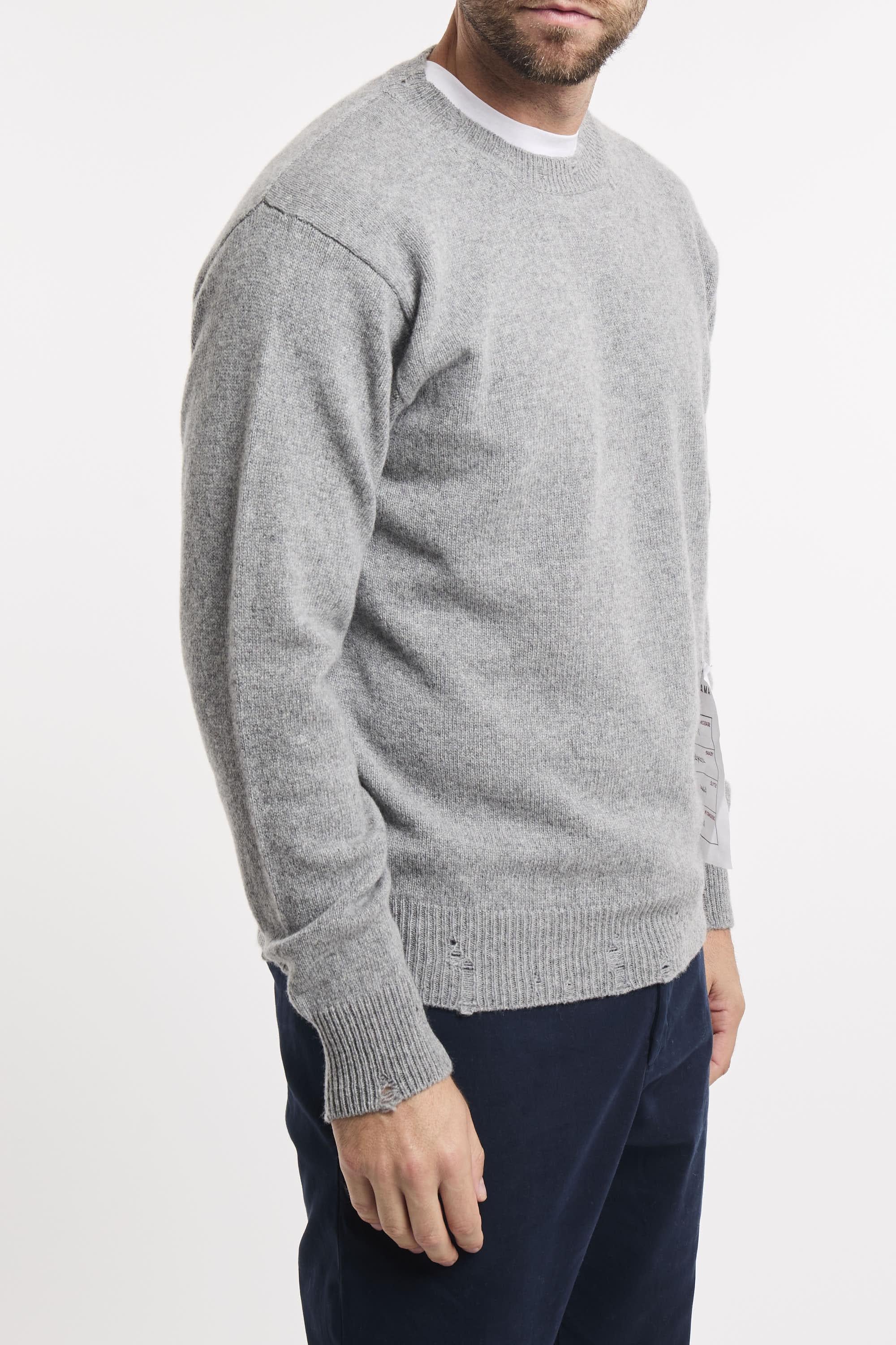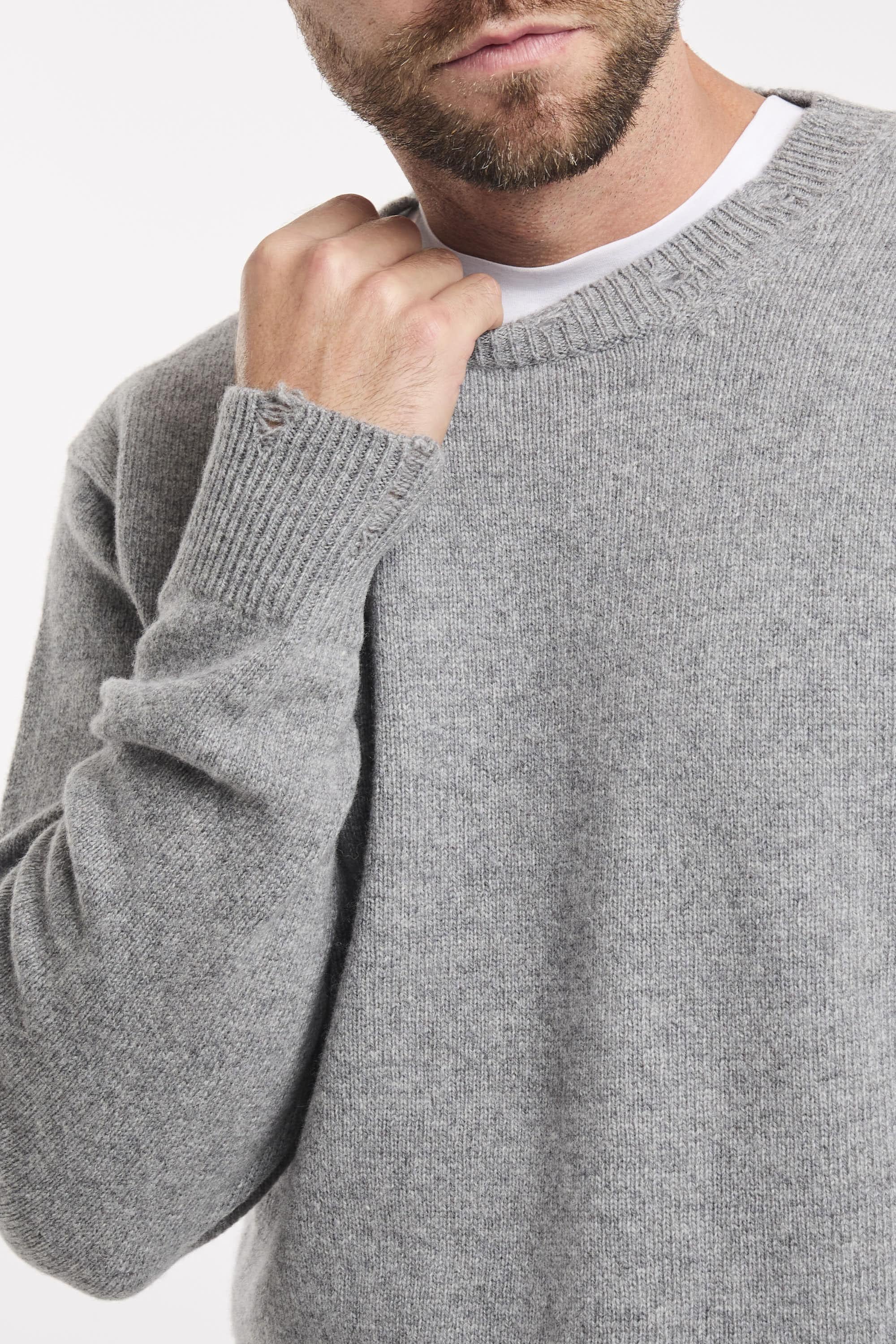 Maglia girocollo a maniche lunghe. Collo fondo e polsini a conste con rotture. Regular fit. Il modello è alto 187cm e indossa la taglia L.