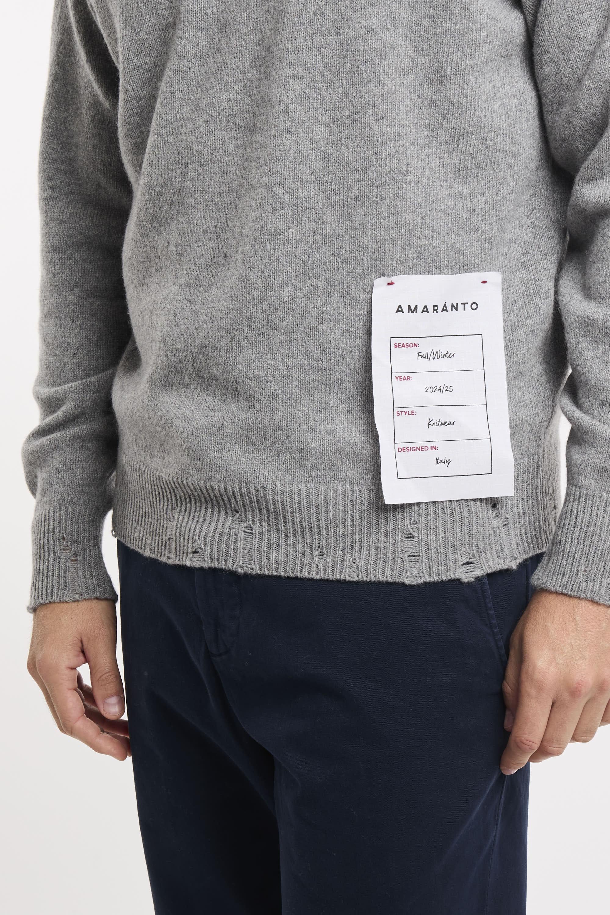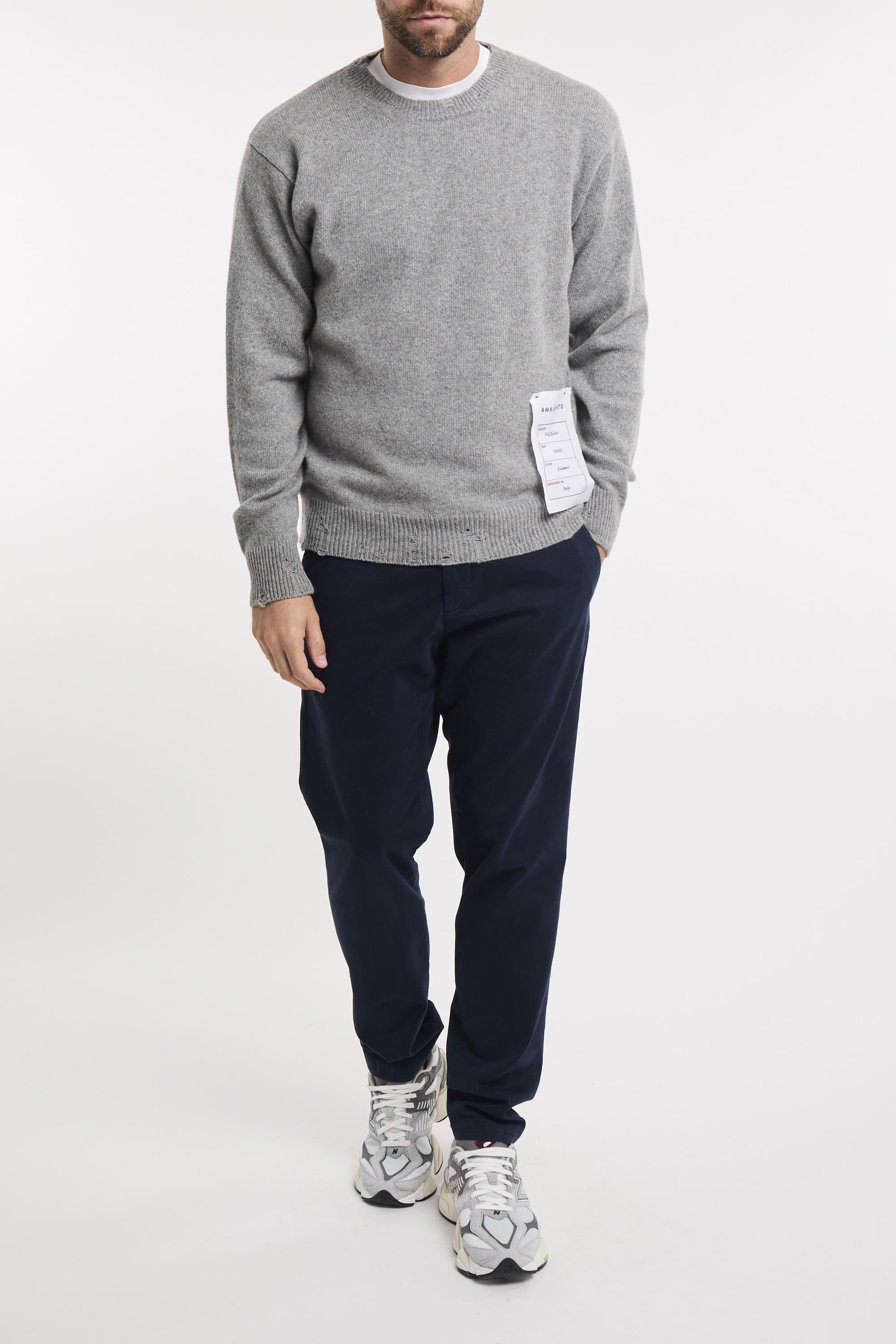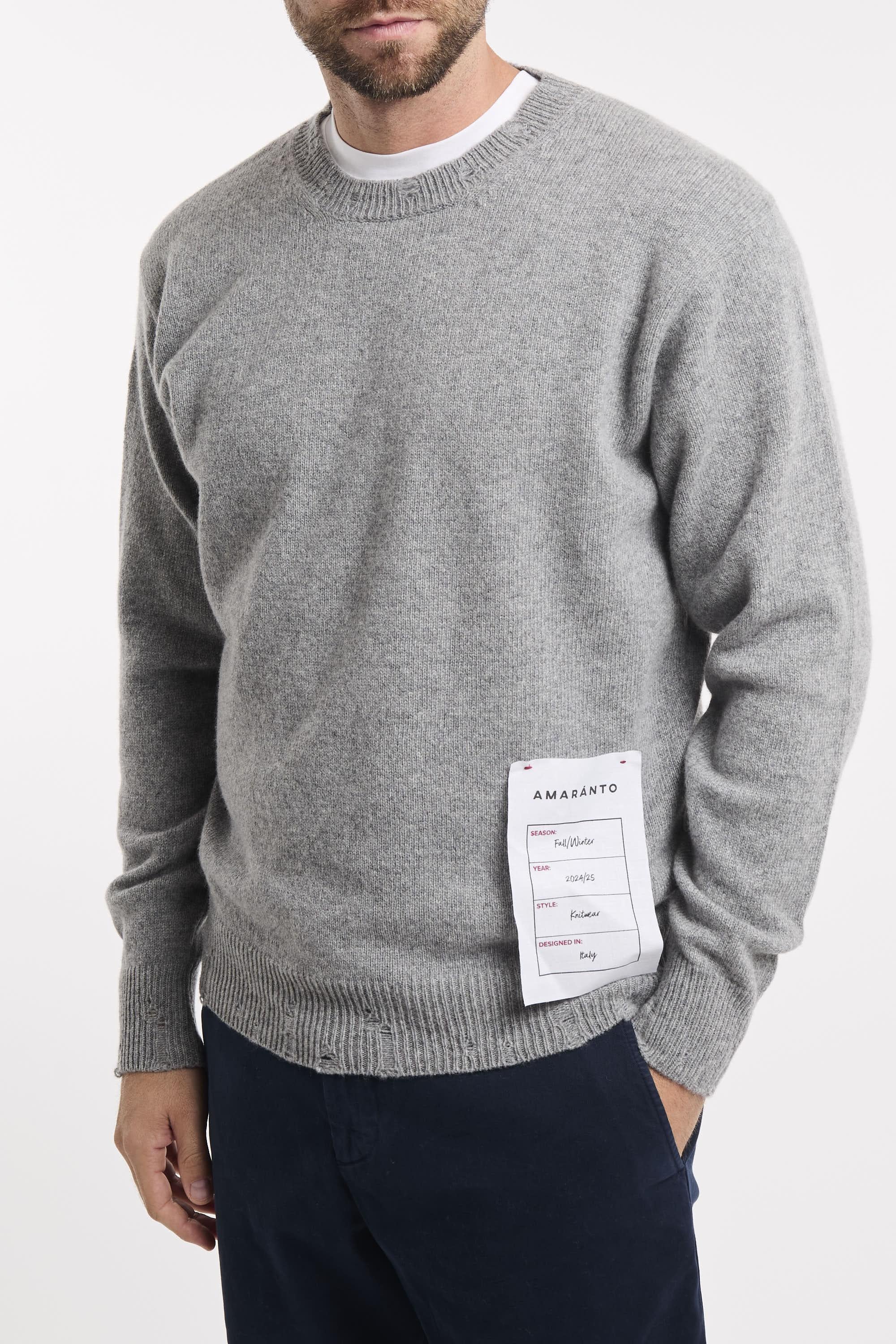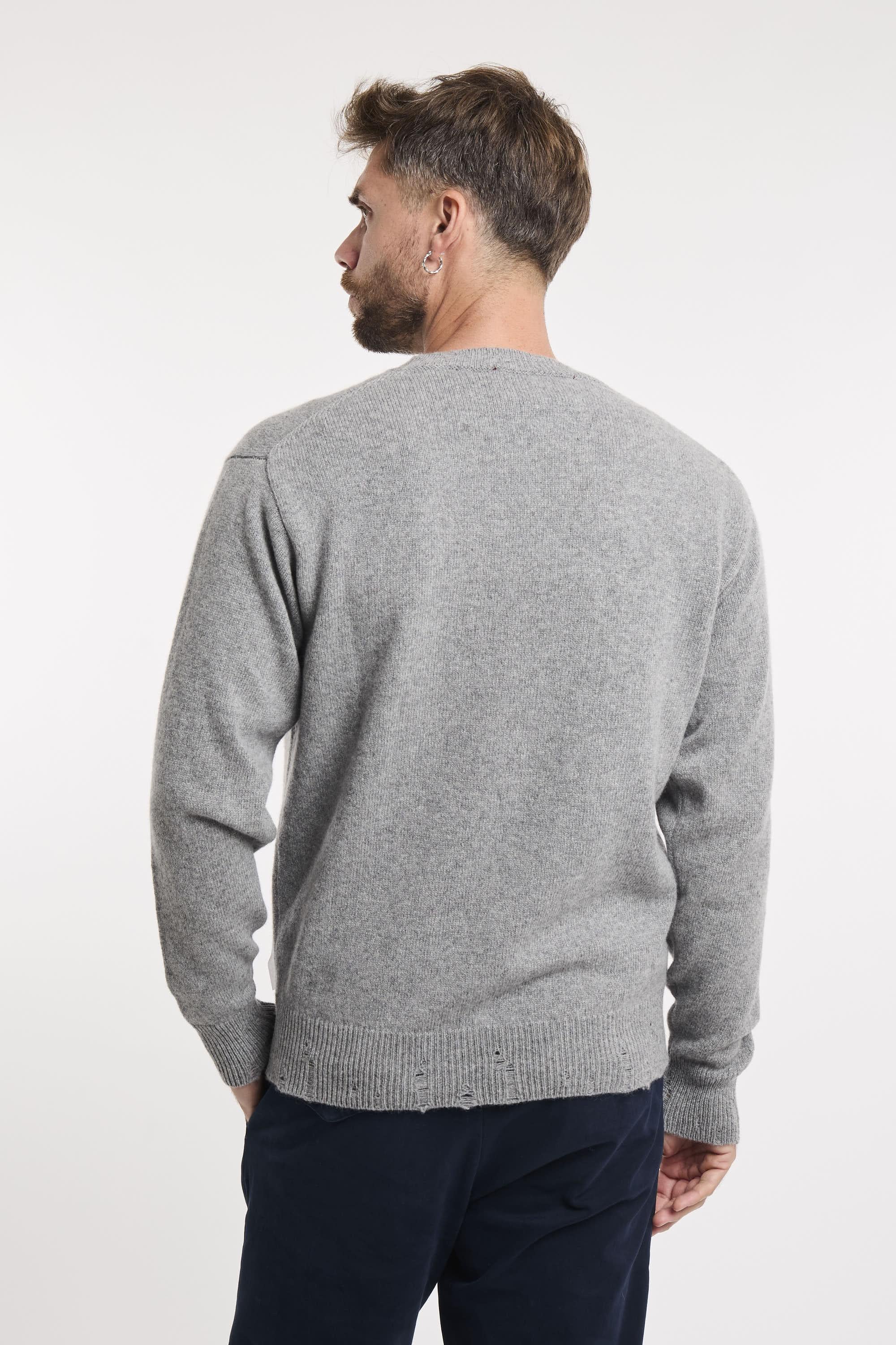 Maglia girocollo a maniche lunghe. Collo fondo e polsini a conste con rotture. Regular fit. Il modello è alto 187cm e indossa la taglia L.