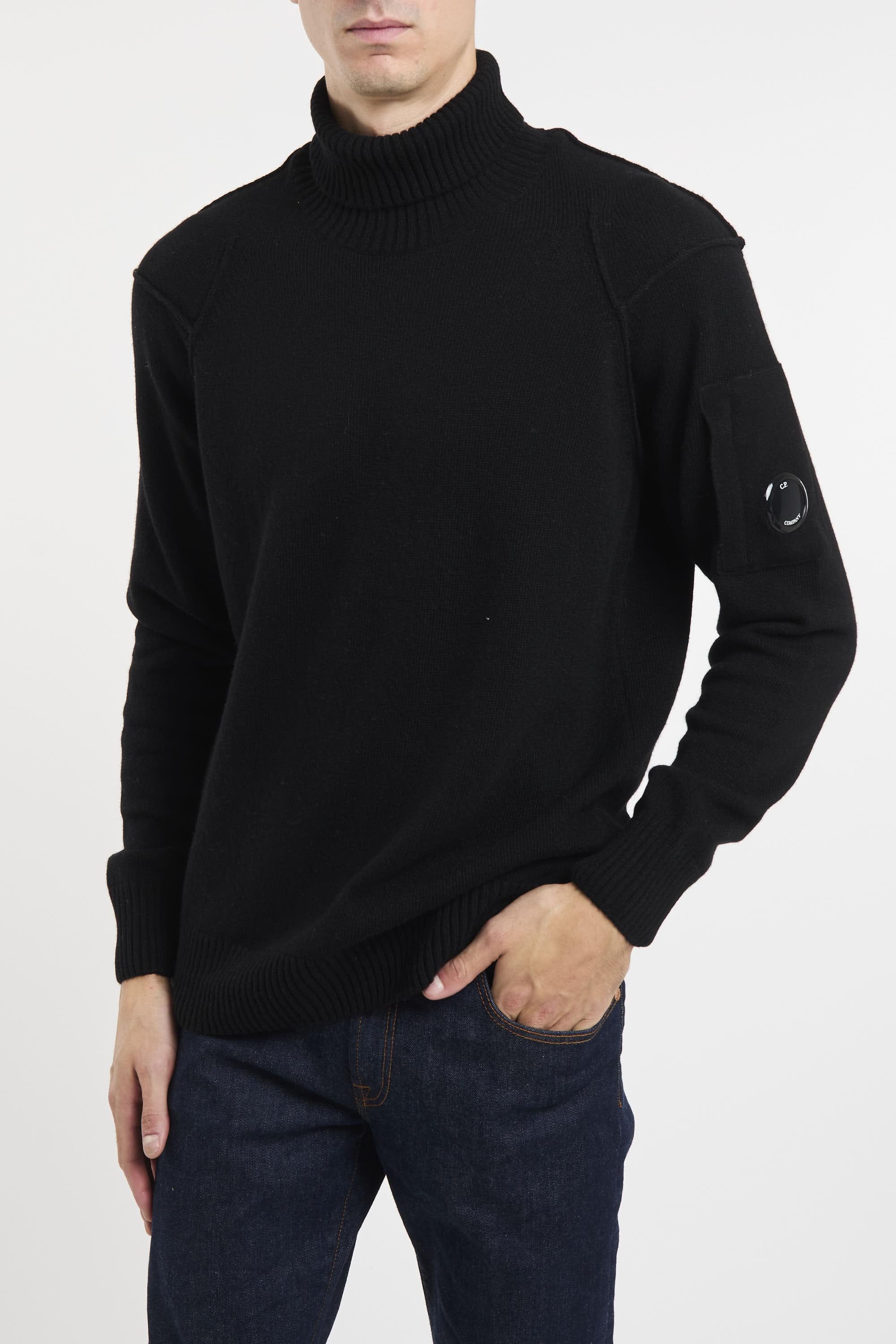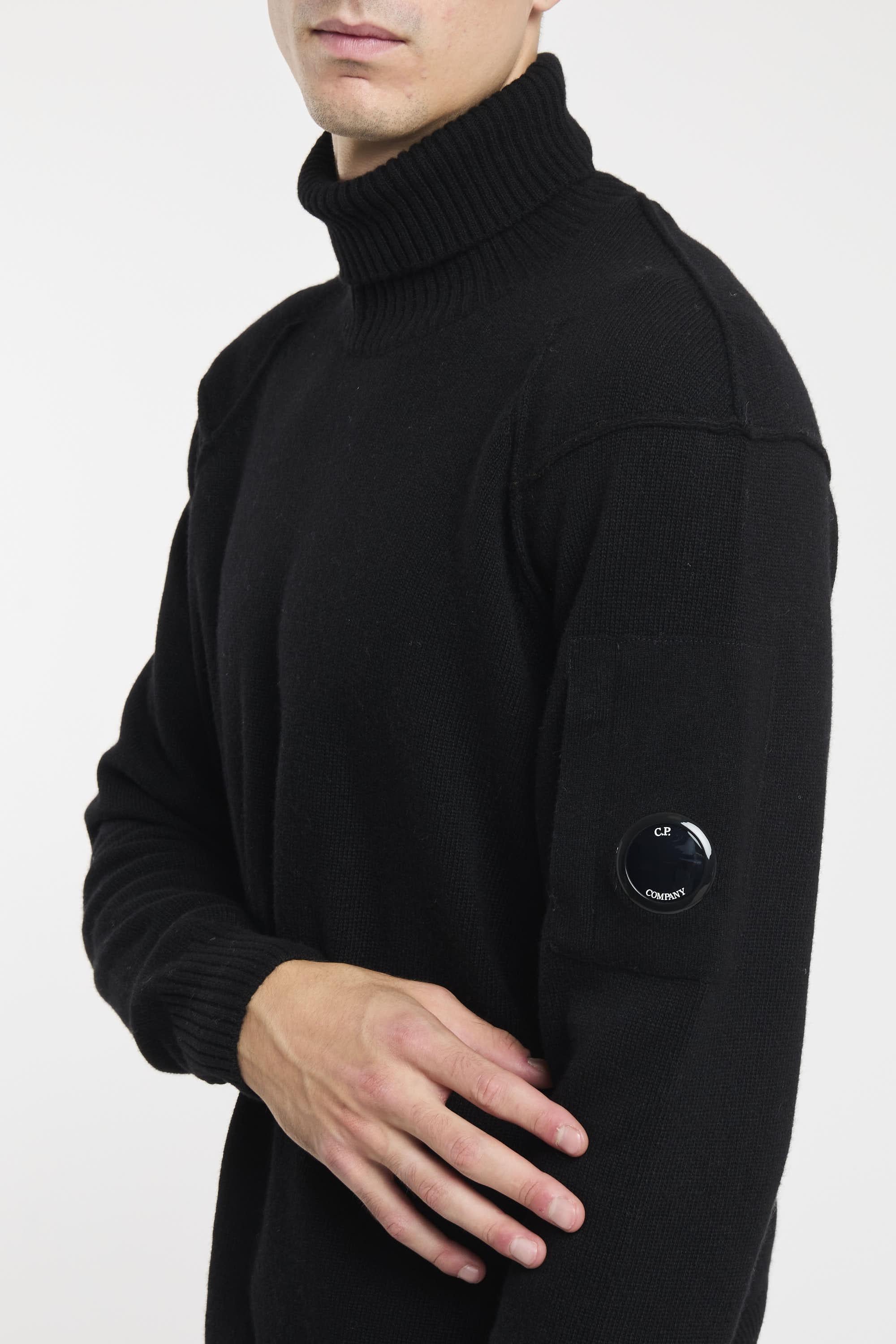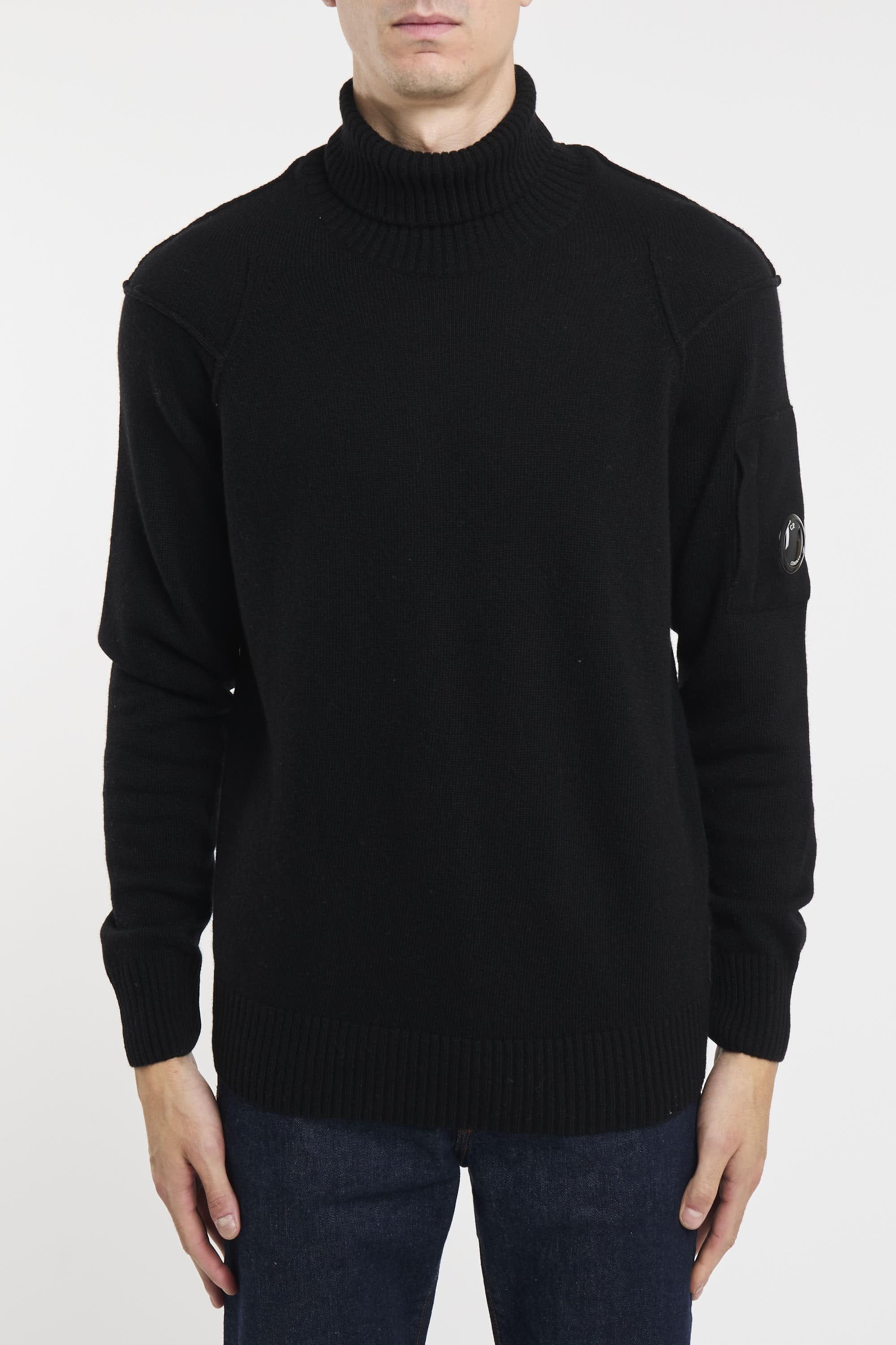 Maglione collo alto realizzato in Lambswool GRS. Global Recycled Standard certifica l'uso di prodotti nel rispetto di criteri ambientali e sociali estesi a tutte le fasi della filiera produttiva. Fondo, collo e polsini a costine, e scomparto sulla manica con C.P. Company Lens. Finezza 7. Regular fit. Il modello è alto 187cm e indossa la taglia 50.