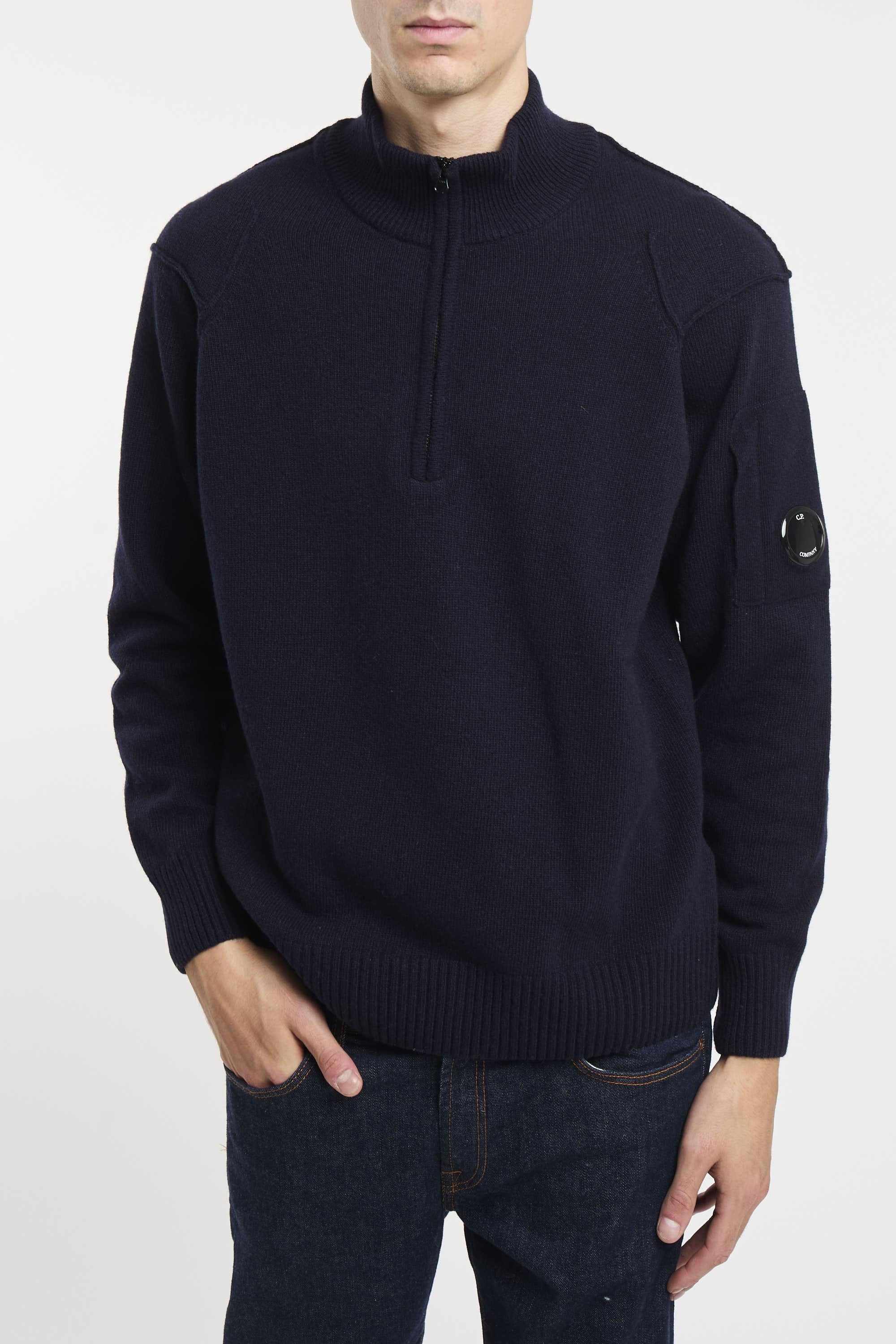 Maglione con mezza zip realizzato in Lambswool GRS. Global Recycled Standard certifica luso di prodotti nel rispetto di criteri ambientali e sociali estesi a tutte le fasi della filiera produttiva. Fondo, collo e polsini a costine, e scomparto sulla manica con C.P. Company Lens. Finezza 7. Regular fit. Il modello è alto 187cm e indossa la taglia 50.