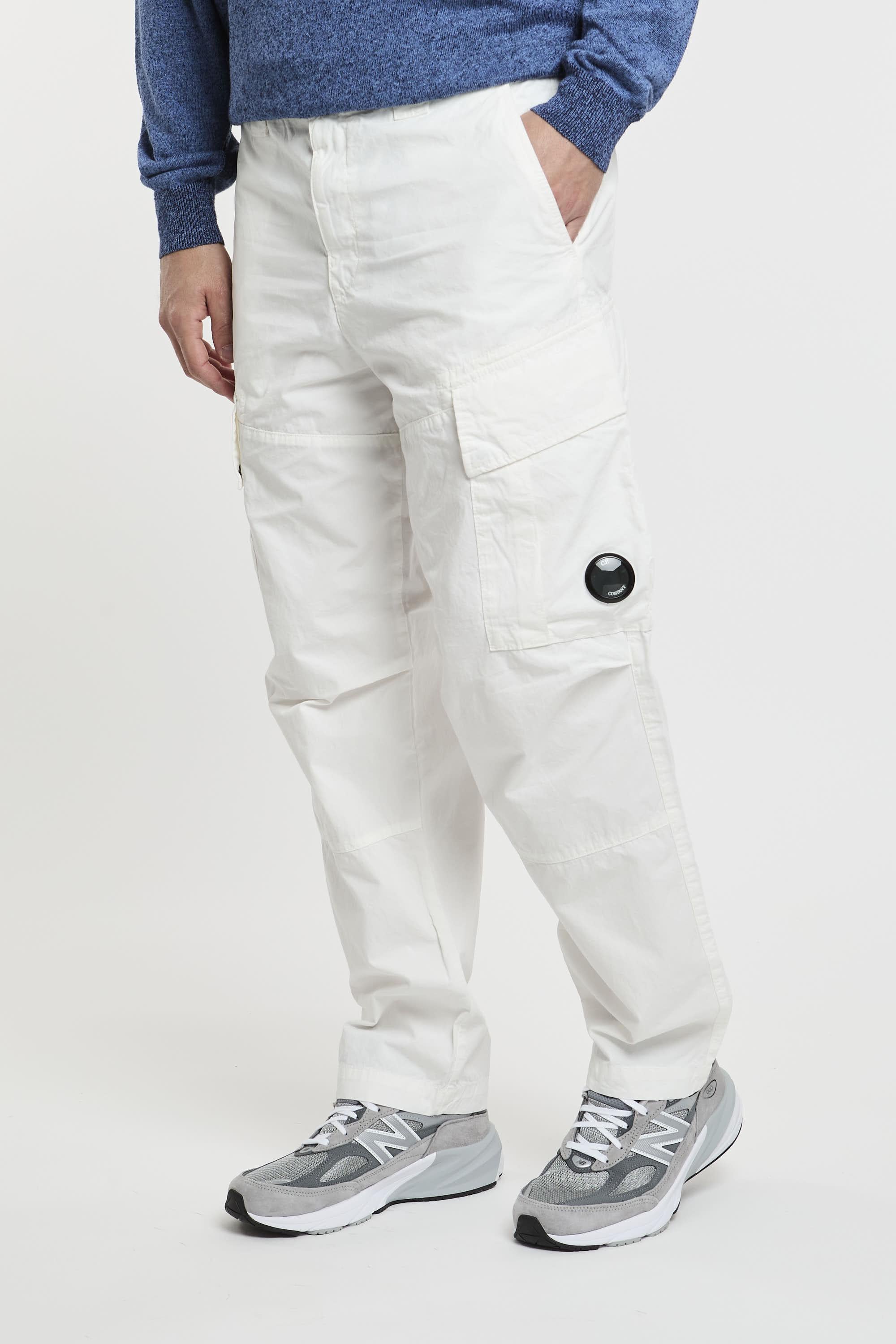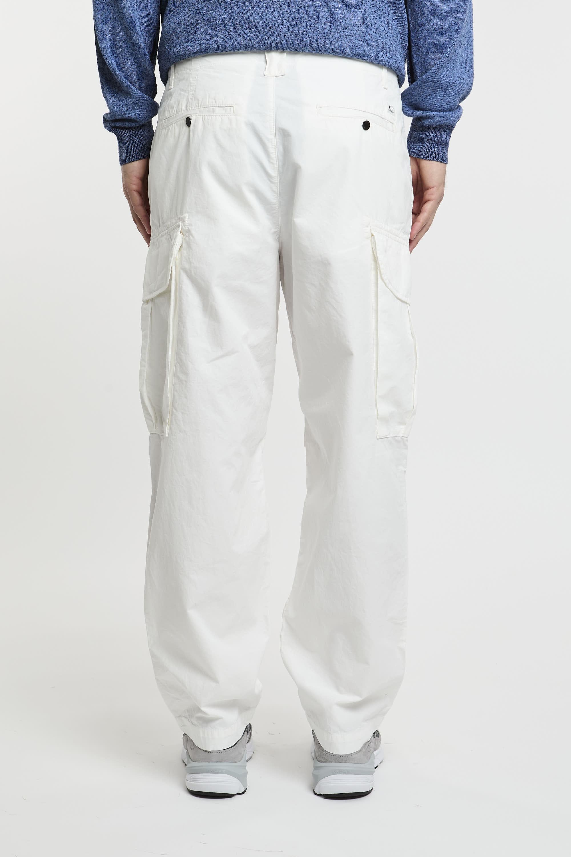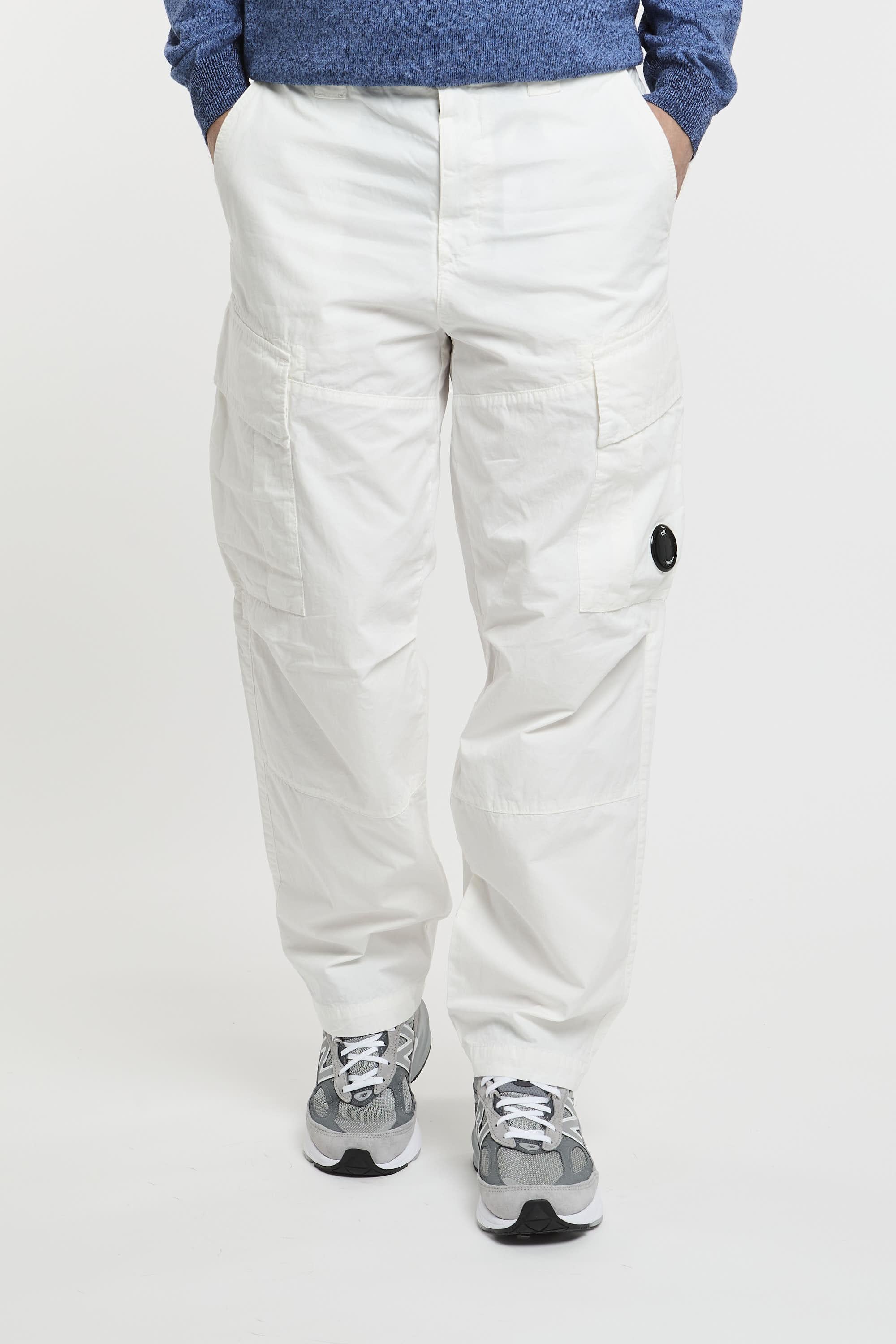 Pantaloni cargo realizzati con passanti per la cintura rinforzati, chiusura con zip e bottoni, tasche per le mani oblique ed estese. Due tasche cargo con lente C.P. Company e due tasche posteriori con bottoni a pressione. Fit ampio. Il modello è alto 187 cm e indossa la taglia 48.