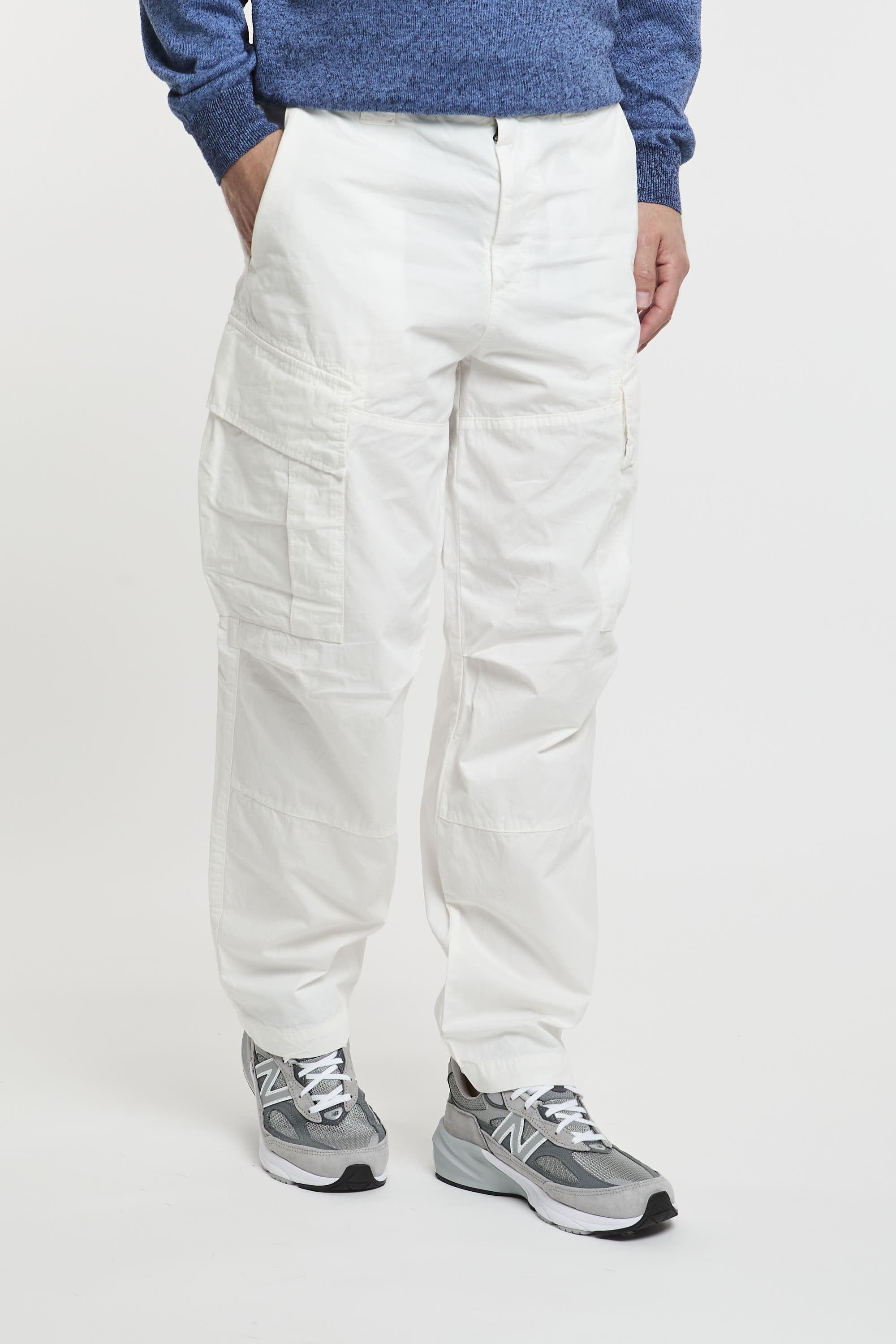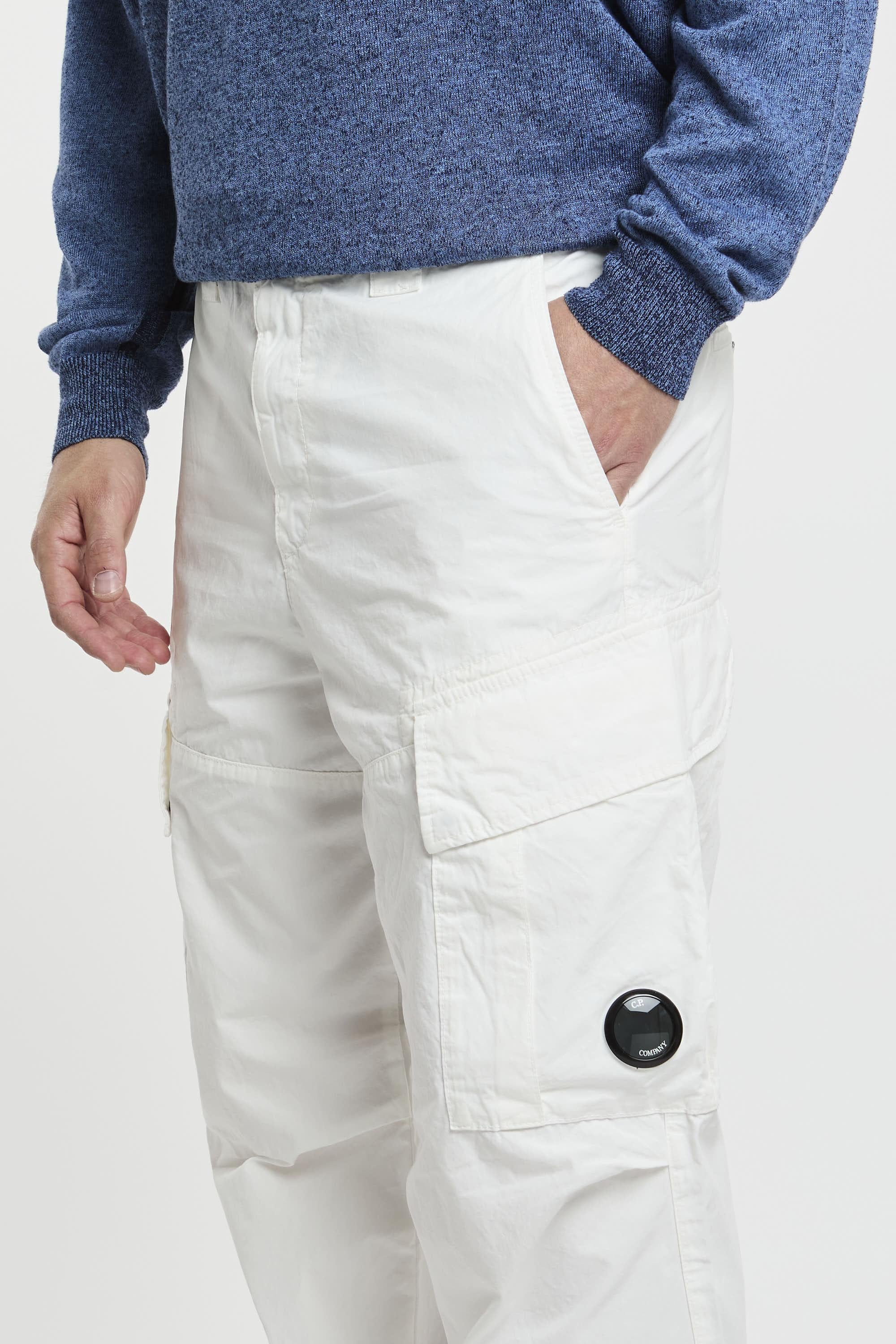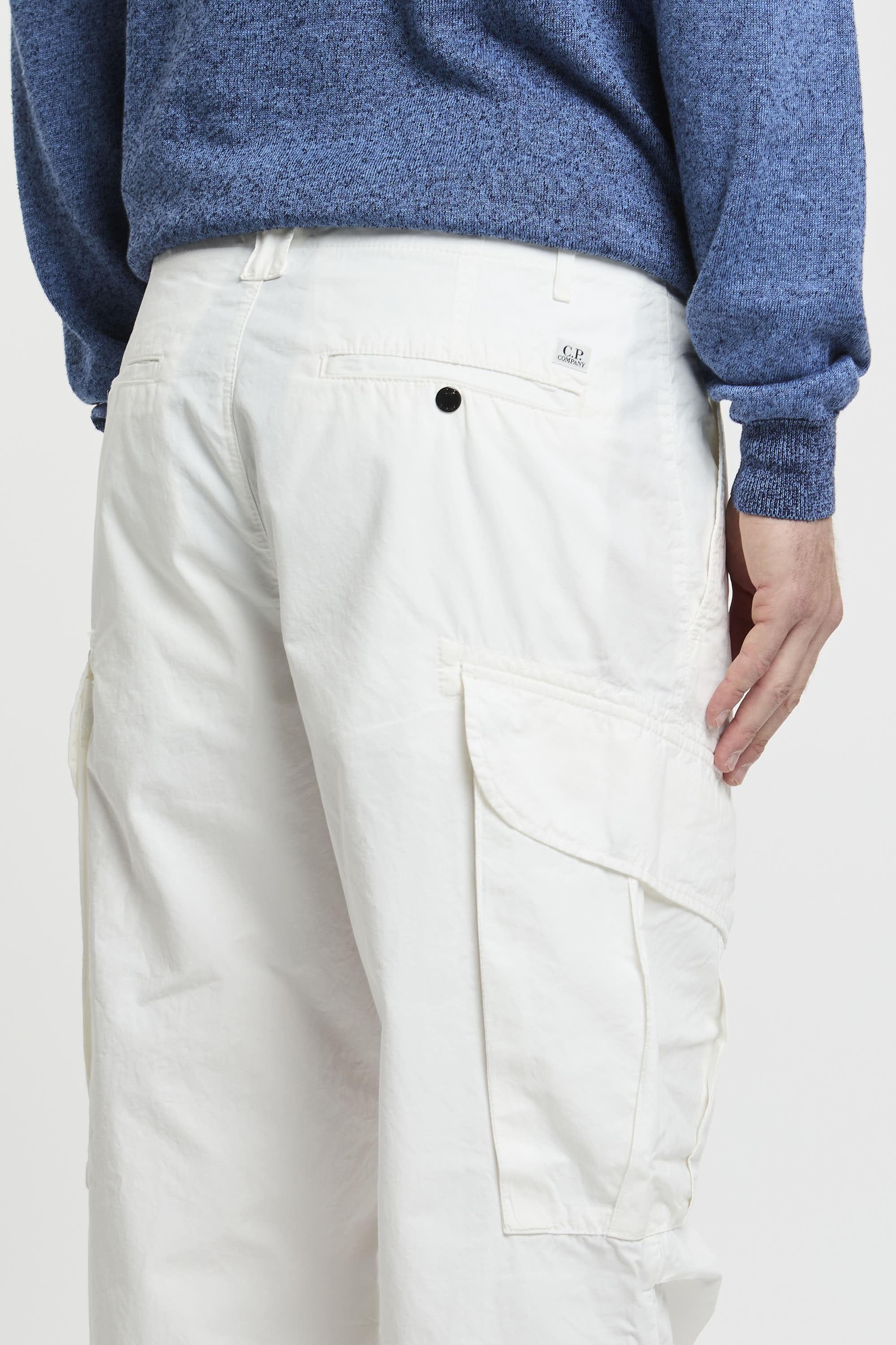 Pantaloni cargo realizzati con passanti per la cintura rinforzati, chiusura con zip e bottoni, tasche per le mani oblique ed estese. Due tasche cargo con lente C.P. Company e due tasche posteriori con bottoni a pressione. Fit ampio. Il modello è alto 187 cm e indossa la taglia 48.