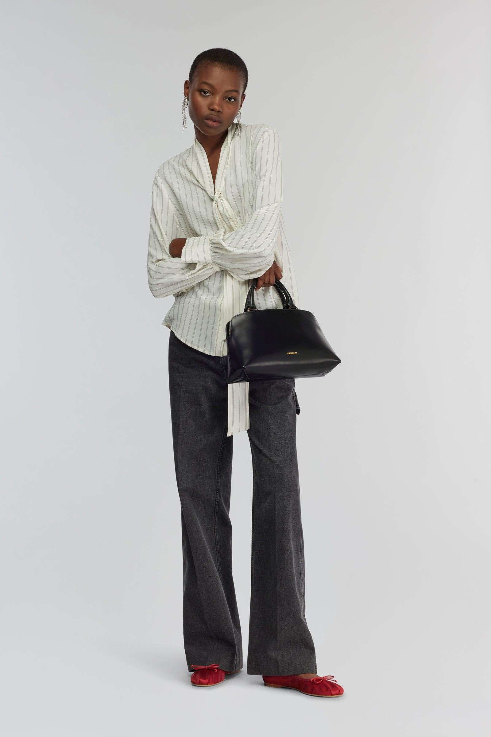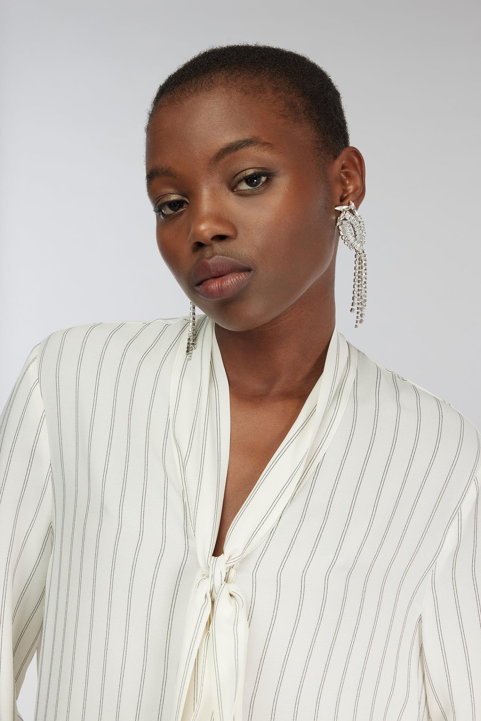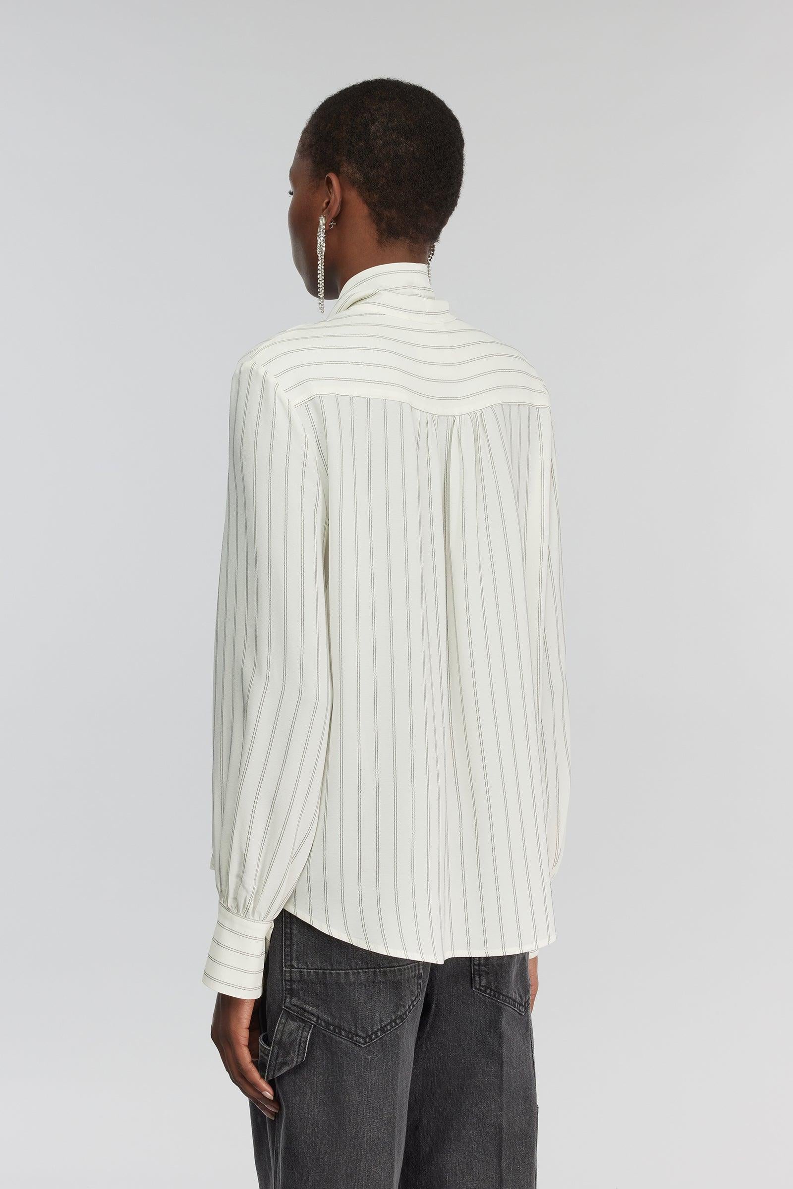 Camicia in crepe de chine gessato. Chiusura frontale con fiocco. Vestibilità regular e lunghezza bacino. La modella è alta 178 cm e indossa la taglia 40. Made in Italy.