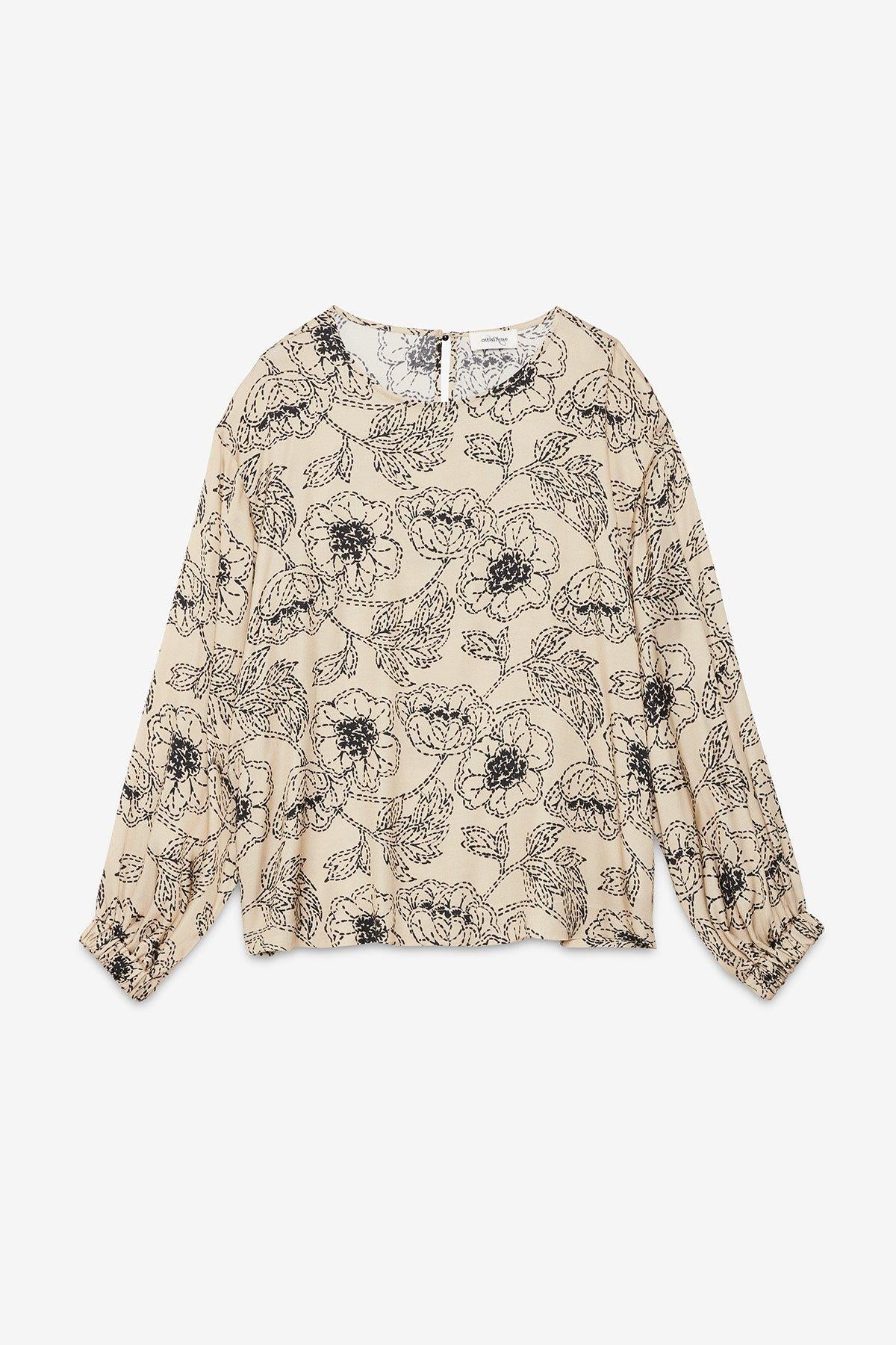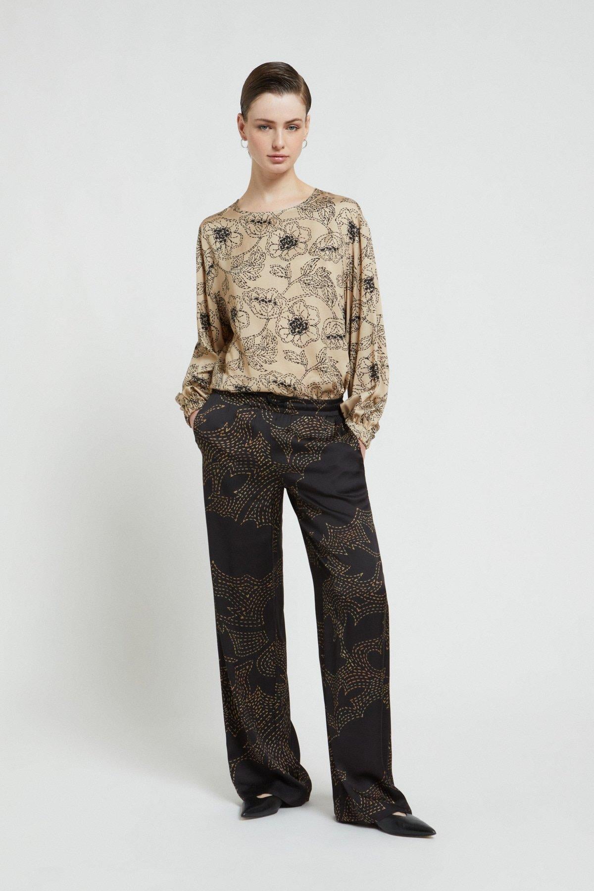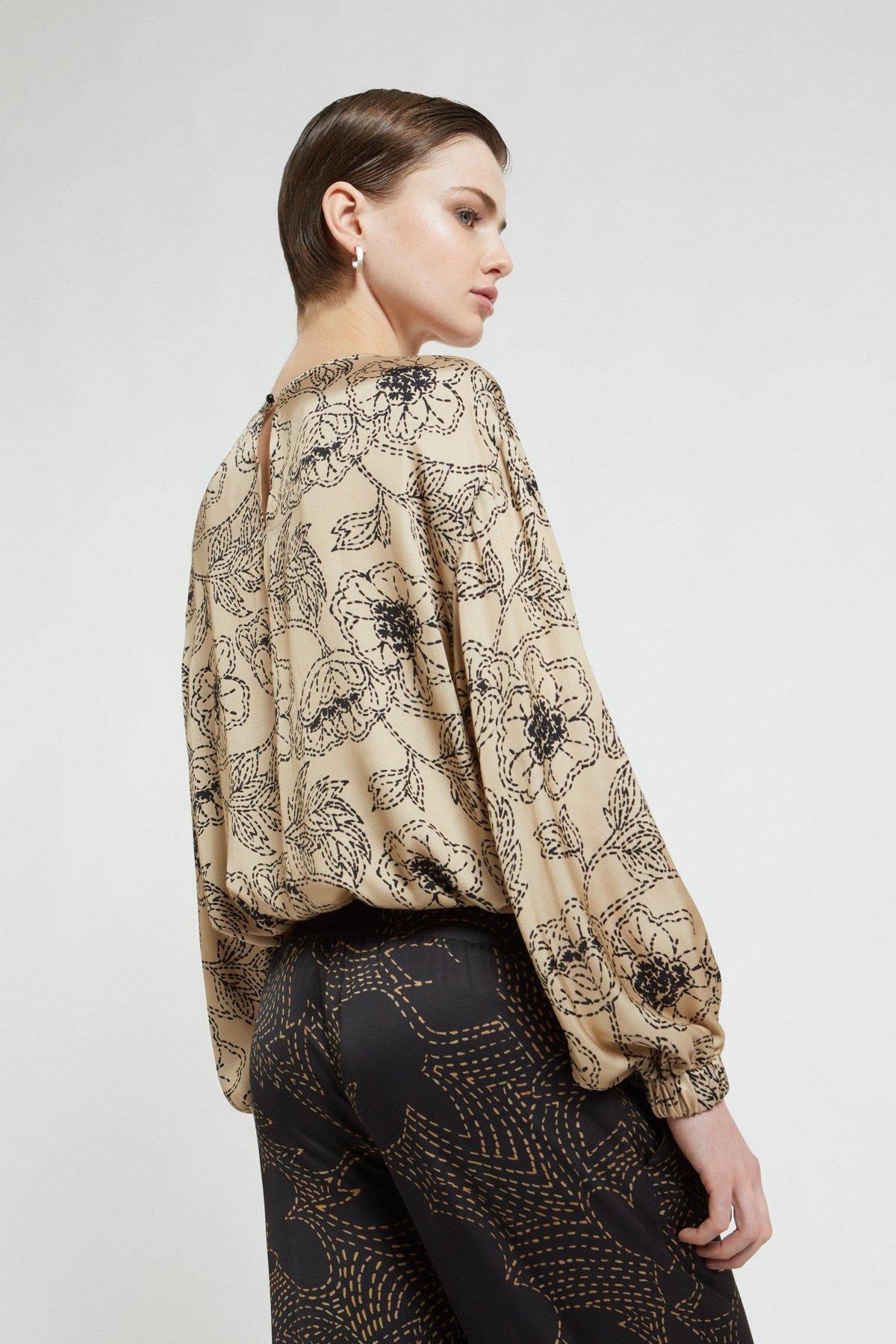Camicia in pura viscosa stampata con chiusura a goccia e manica increspata. La modella è alta 178 cm e indossa la taglia 40.
