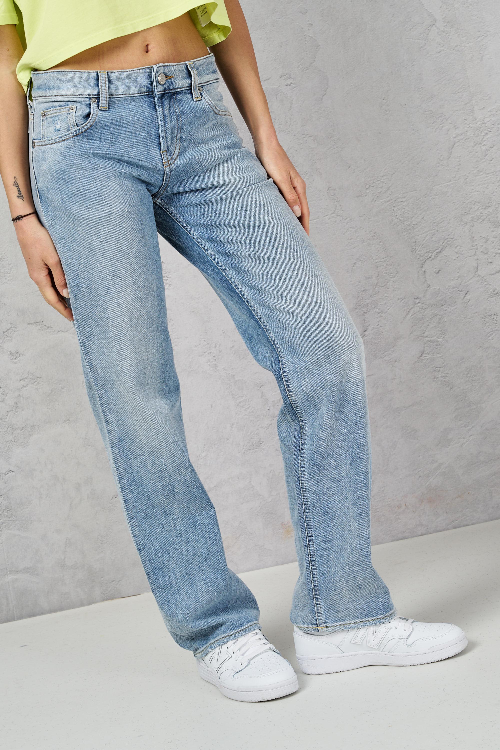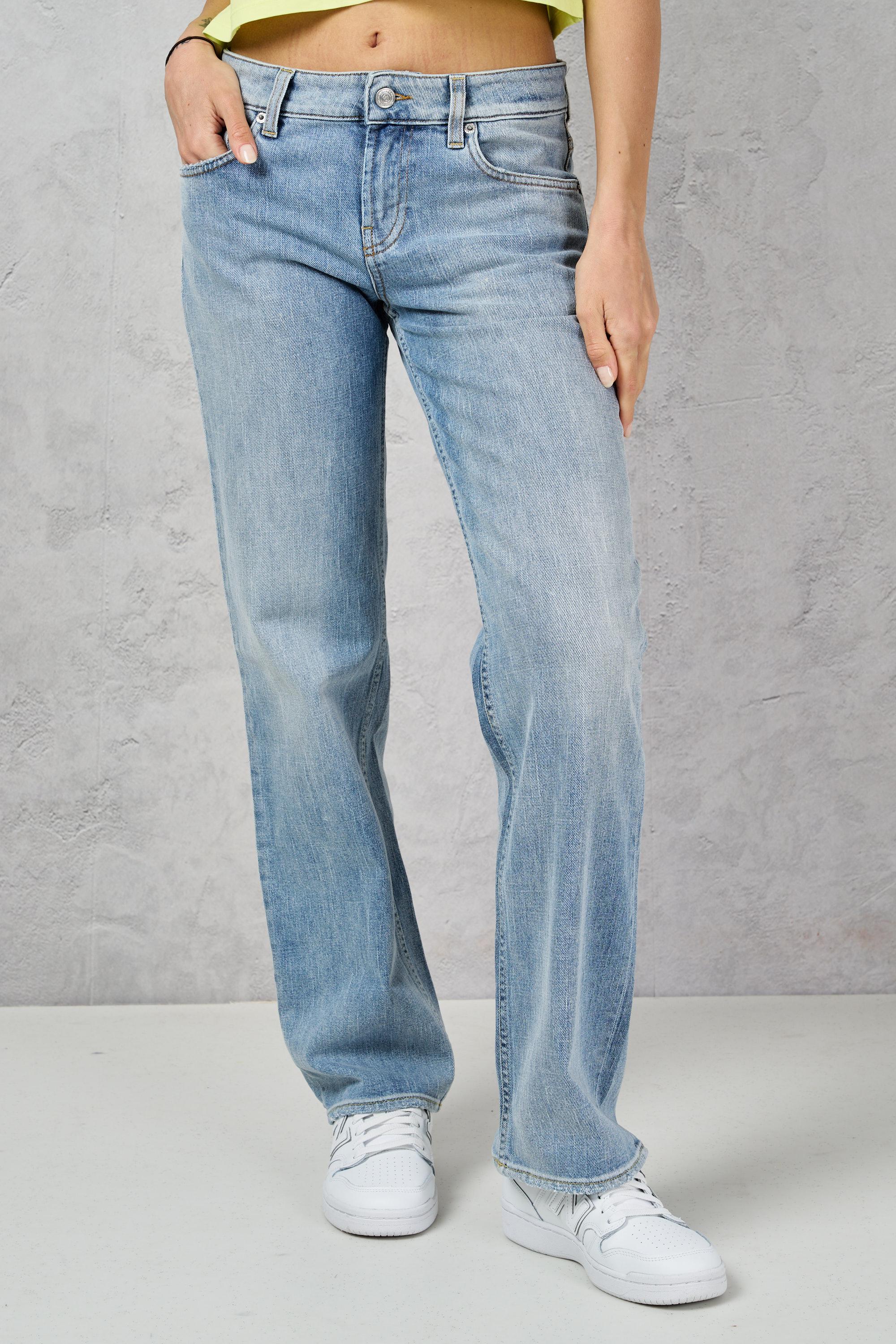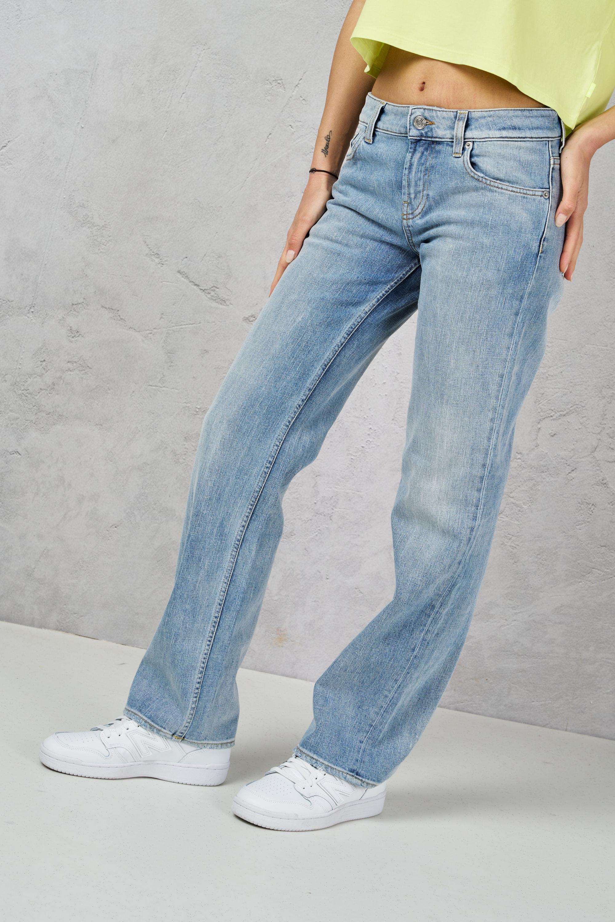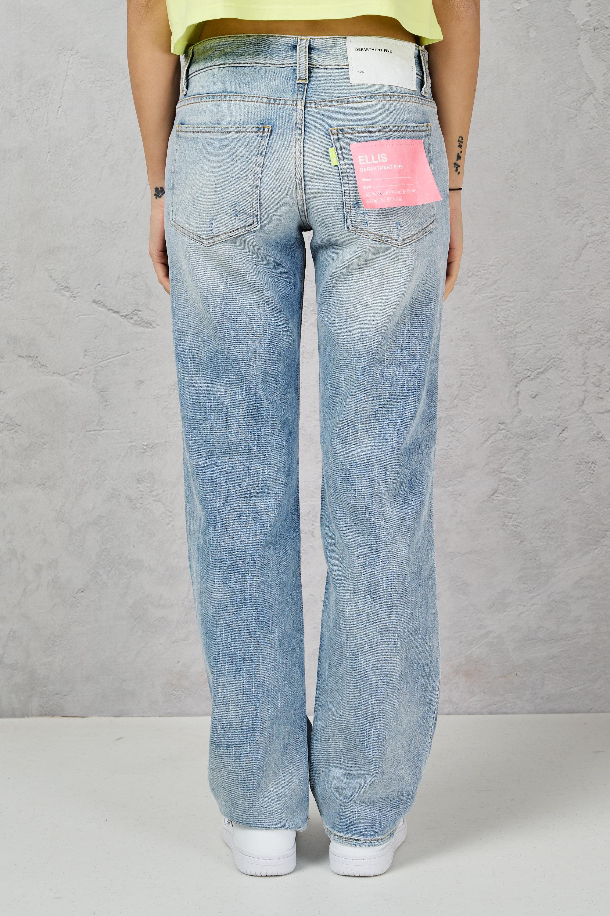 Jeans modello Ellis cinque tasche a vita bassa. Chiusura frontale con bottone e zip, passanti per la cintura e salpa con logo sul retro. La modella è alta 178cm e indossa la taglia 26. Made in Italy.