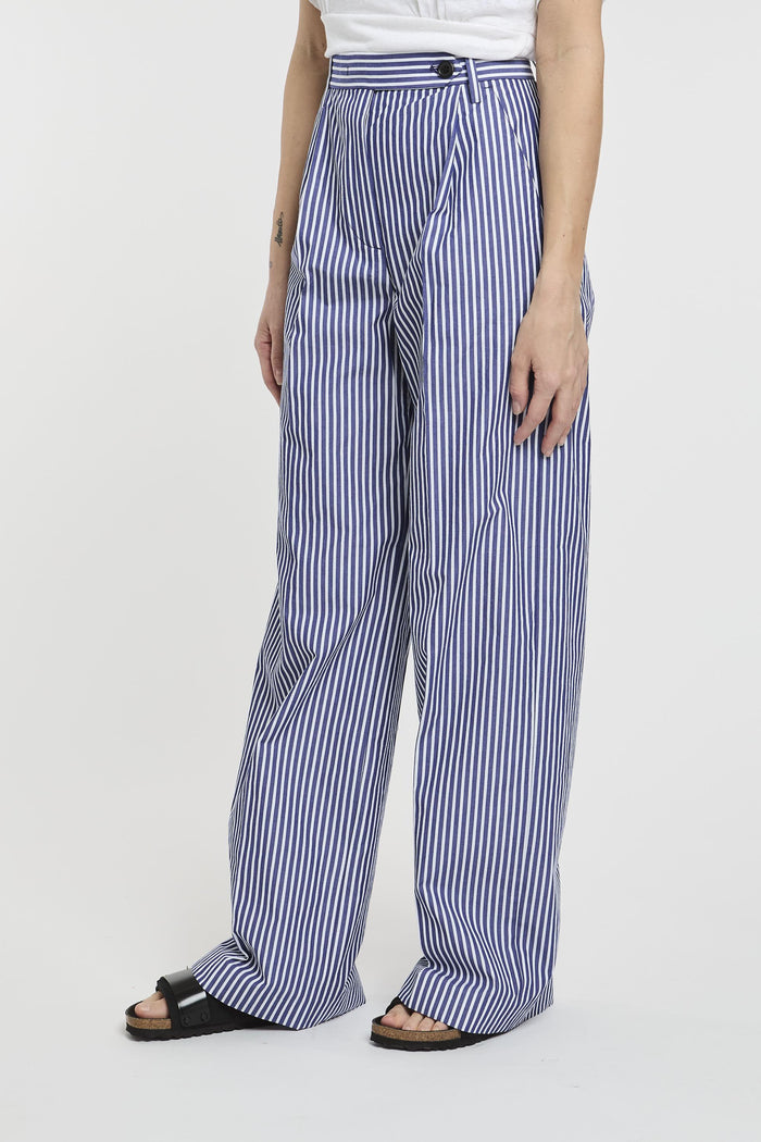 Pantalone Fairmont, gamba ampia realizzato in popeline di cotone a righe bianco/azzurre, passanti per cintura, vita alta, pence, chiusura frontale con bottone e zip, tasche a filetto sui lati e dietro, taglio dritto. Fit regolare. Made in Italy. La modella è alta 178cm e indossa la taglia 40.