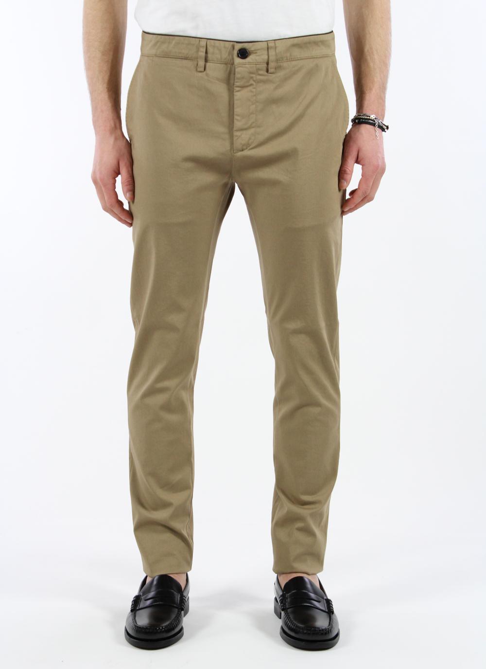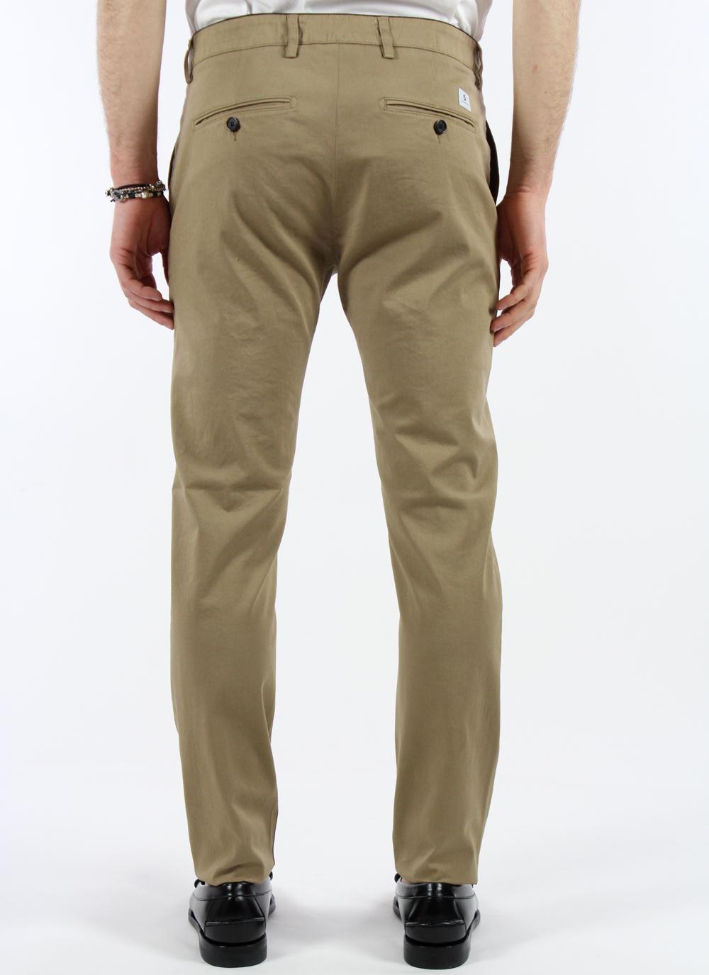 Pantalone chino modello Mike in gabardina di cotone, vita media con passanti, tasche all'americana laterali, tasche posteriori a filetto con bottone. Chiusura frontale con bottone zip e bottone interno in vita.