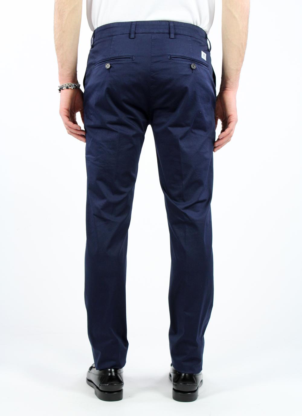 Pantalone chino modello Mike in gabardina di cotone, vita media con passanti, tasche all'americana laterali, tasche posteriori a filetto con bottone. Chiusura frontale con bottone zip e bottone interno in vita.