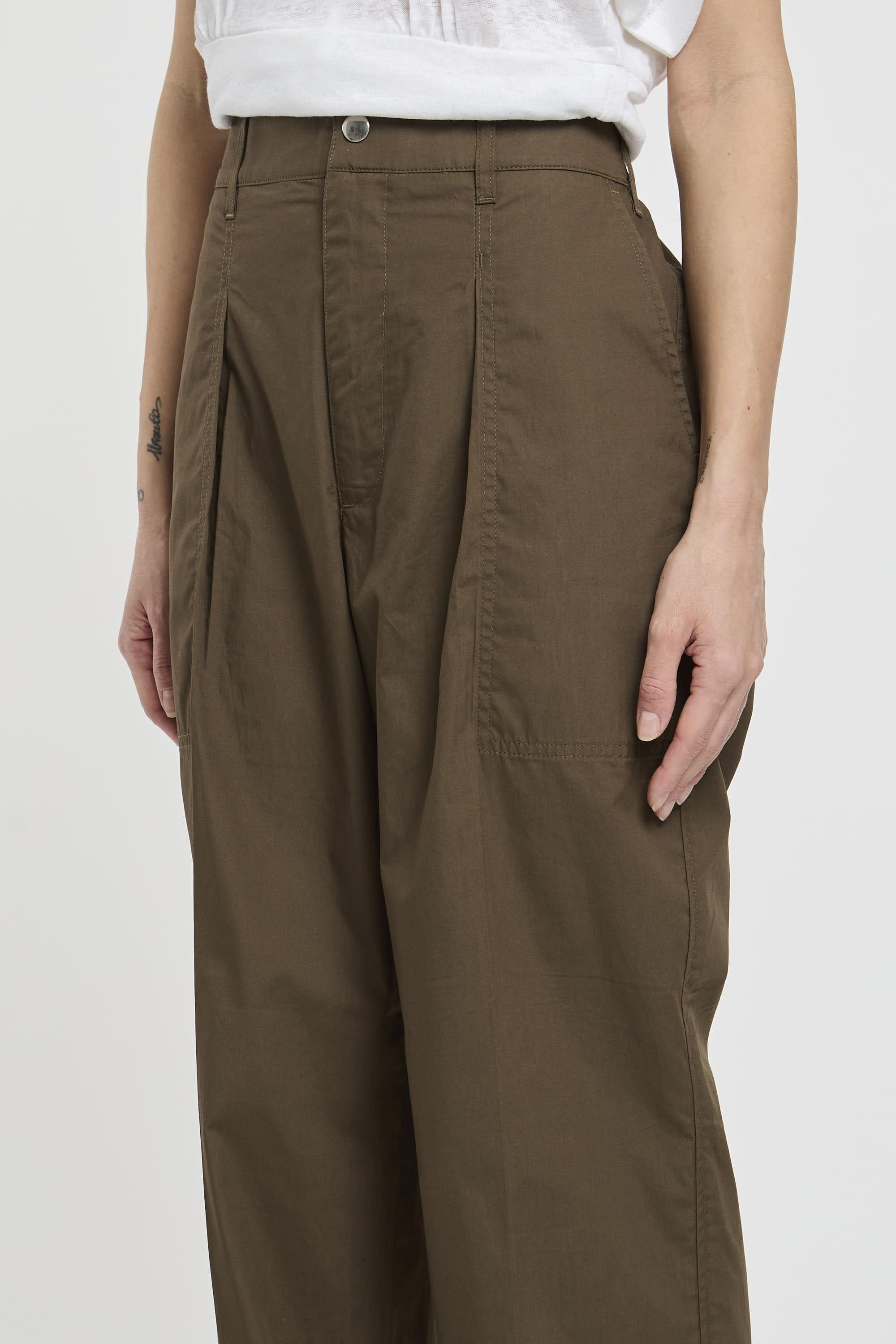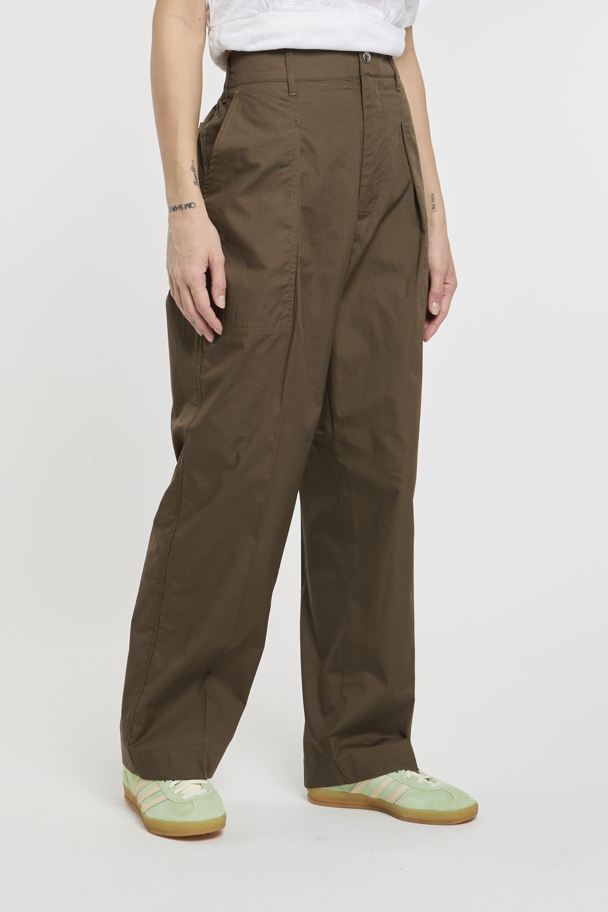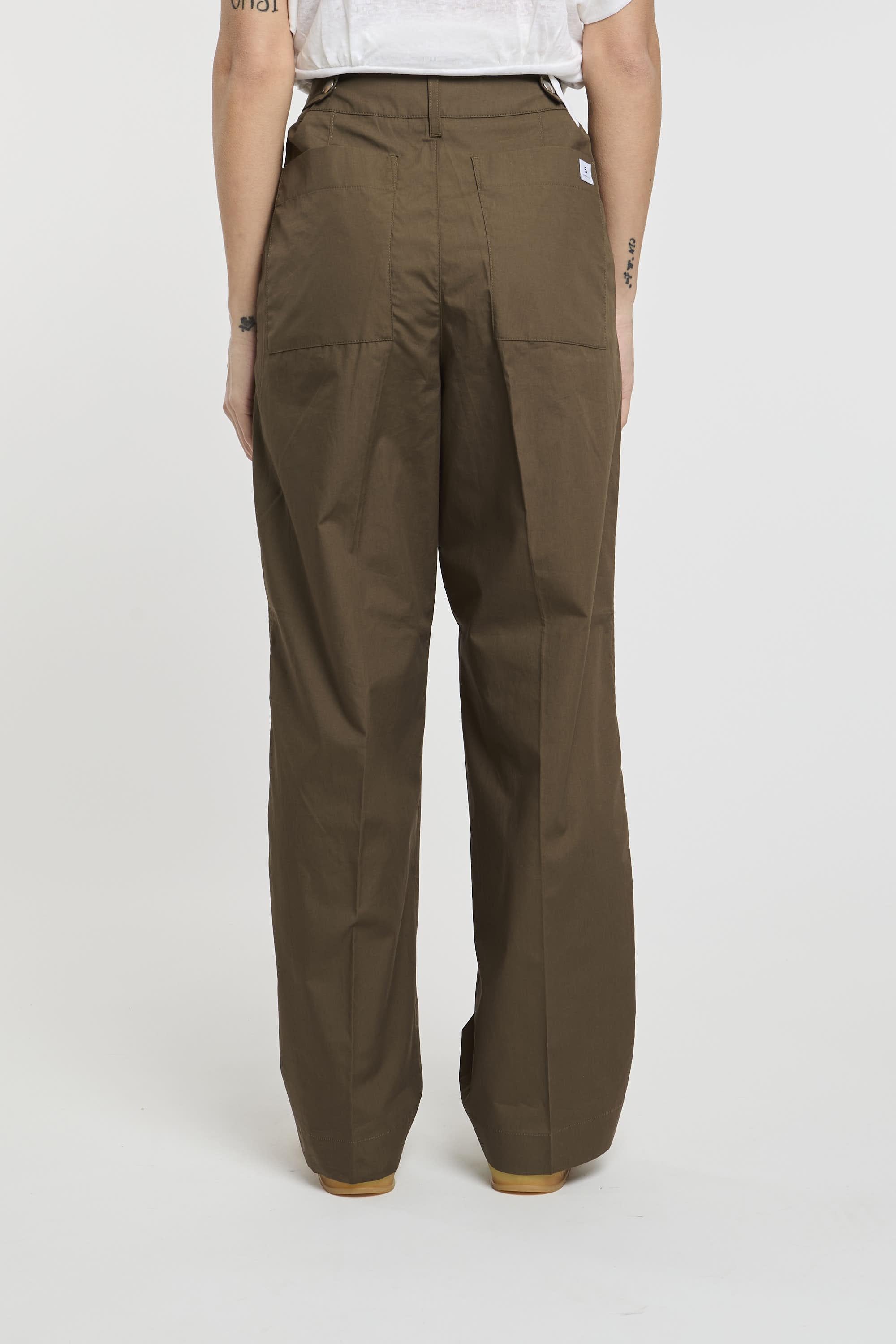 Pantalone Podshare fatique, gamba ampia realizzato in popeline di cotone, passanti per cintura, vita alta, chiusura frontale con bottone e zip, tasche a filetto sui lati e tasche a toppa dietro, taglio dritto. Fit ampio. La modella è alta 178cm e indossa la taglia 38.