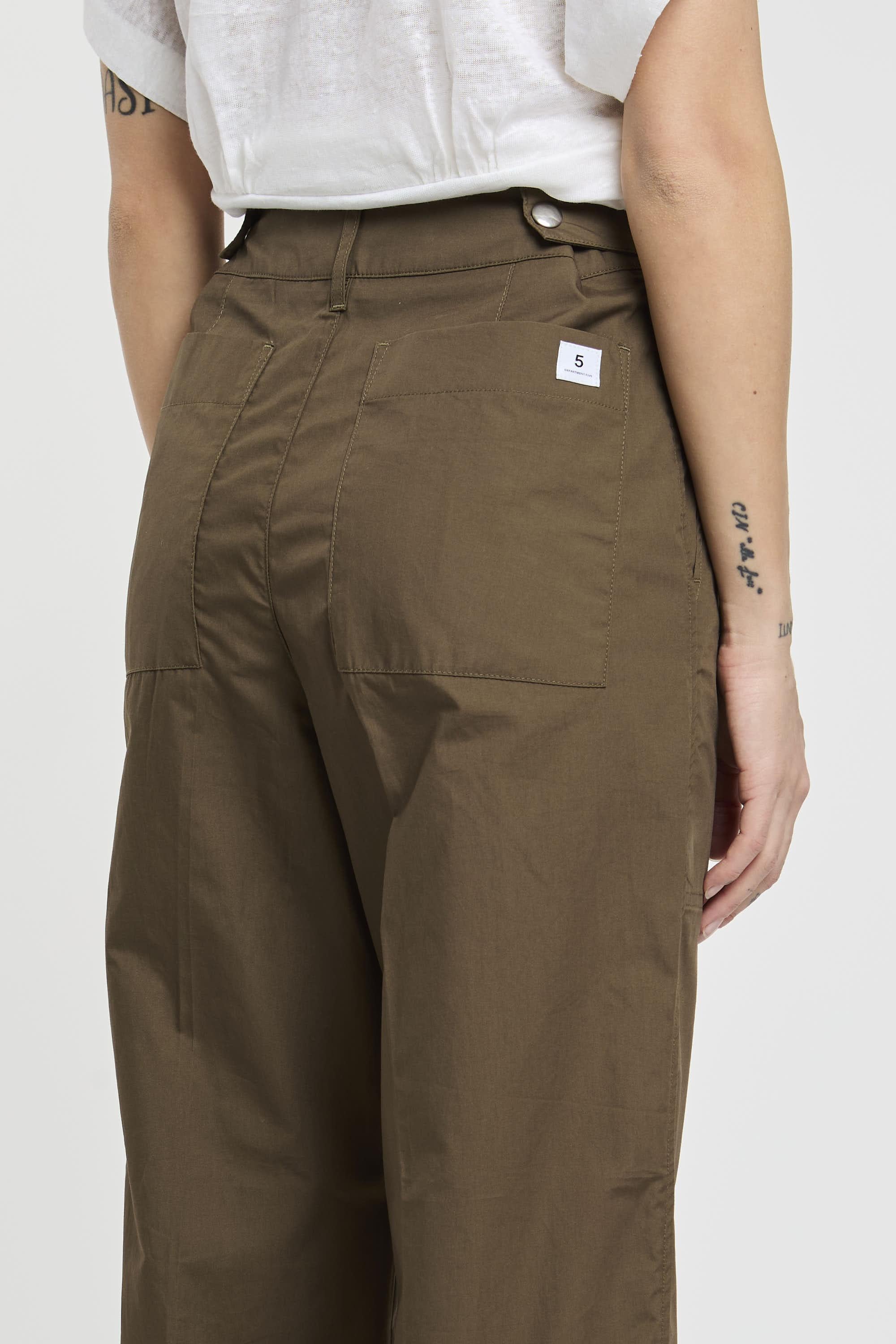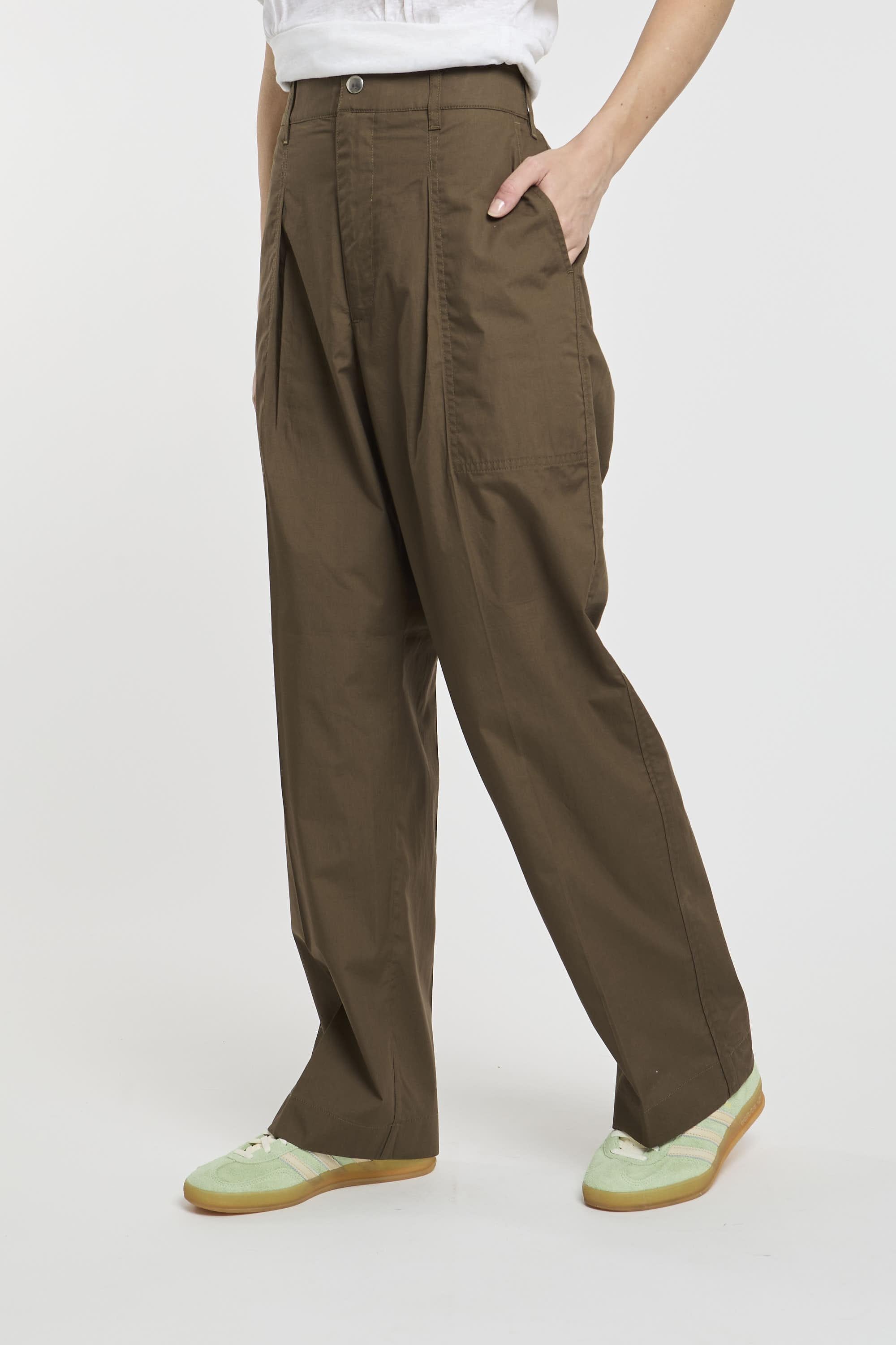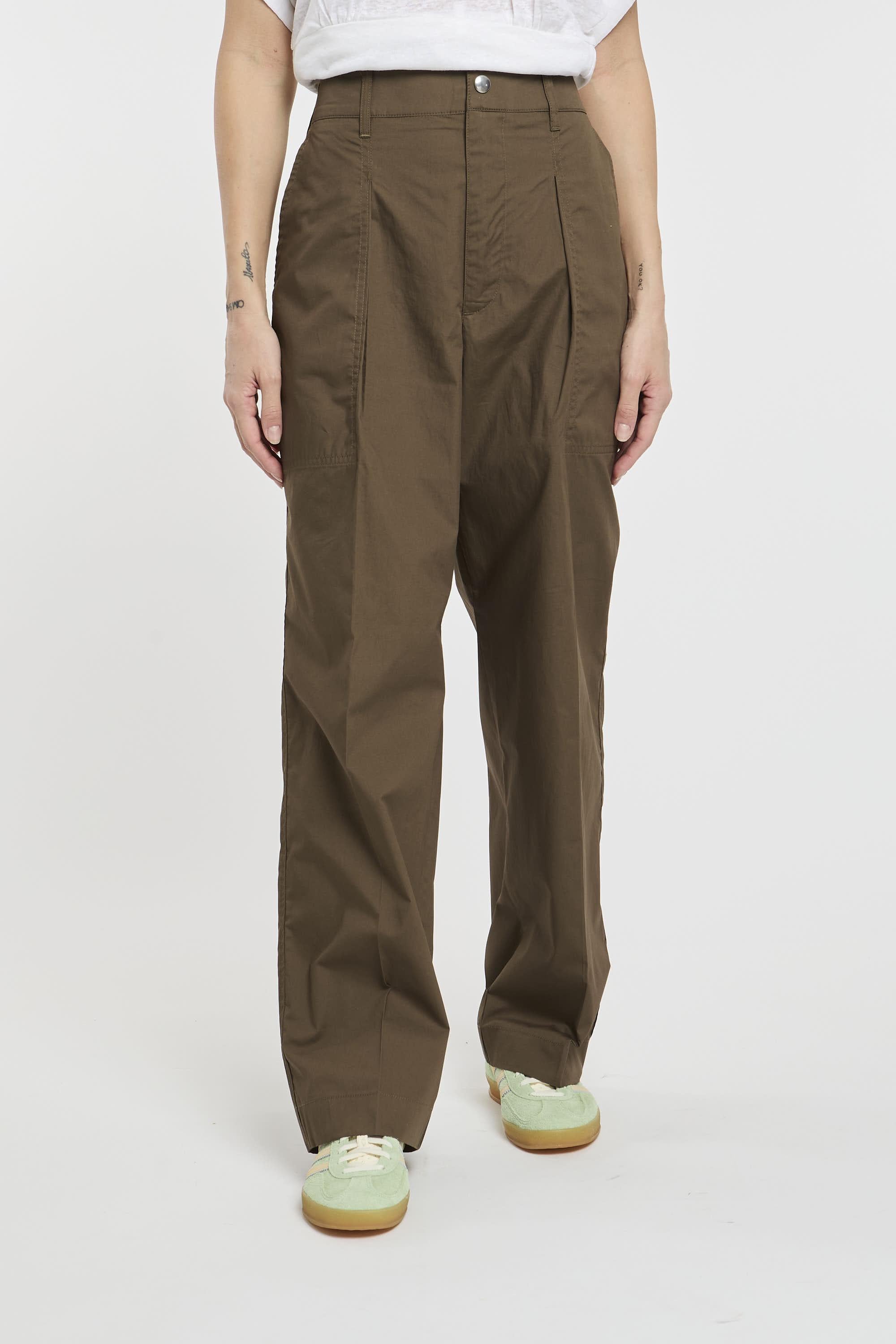 Pantalone Podshare fatique, gamba ampia realizzato in popeline di cotone, passanti per cintura, vita alta, chiusura frontale con bottone e zip, tasche a filetto sui lati e tasche a toppa dietro, taglio dritto. Fit ampio. La modella è alta 178cm e indossa la taglia 38.