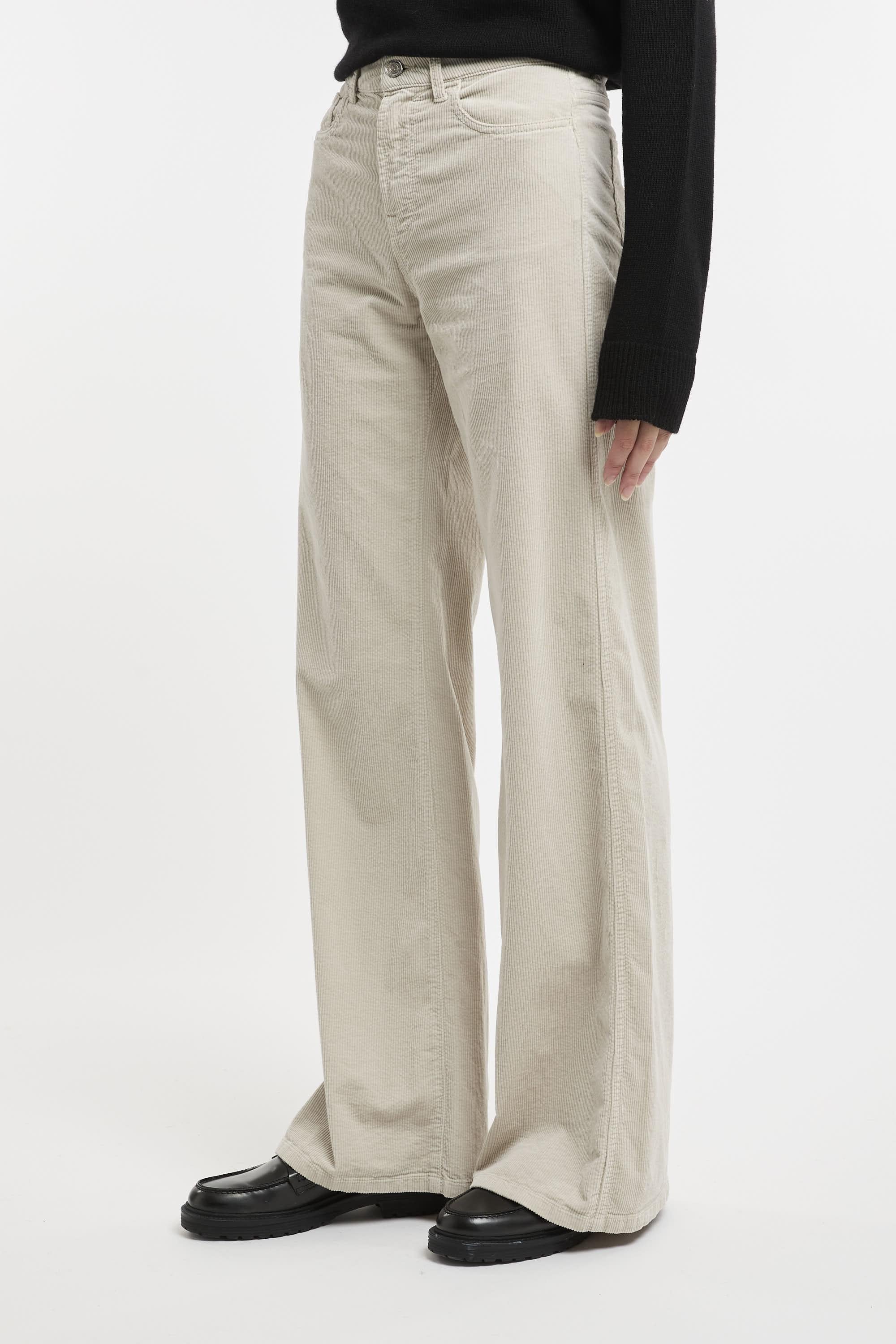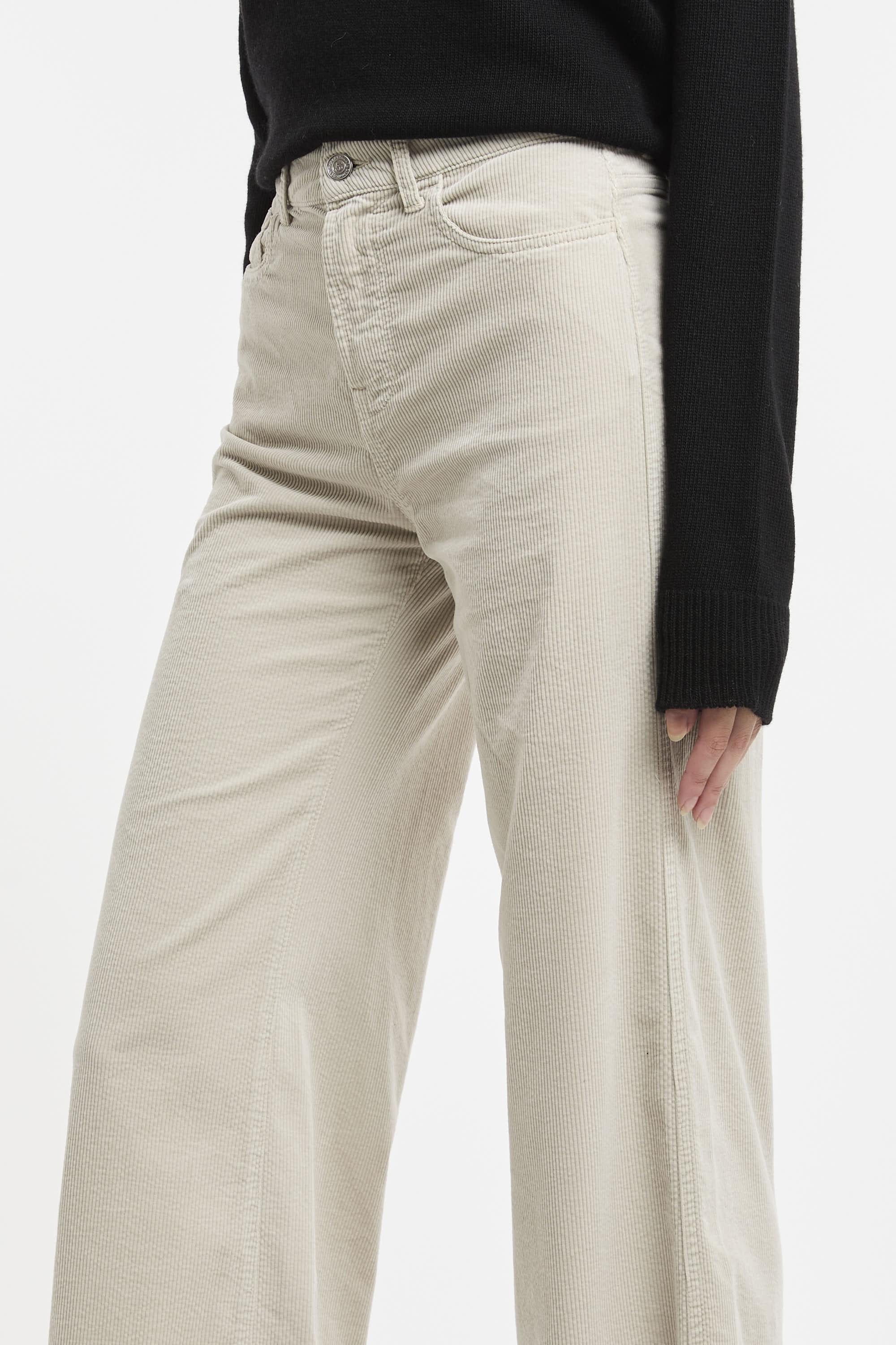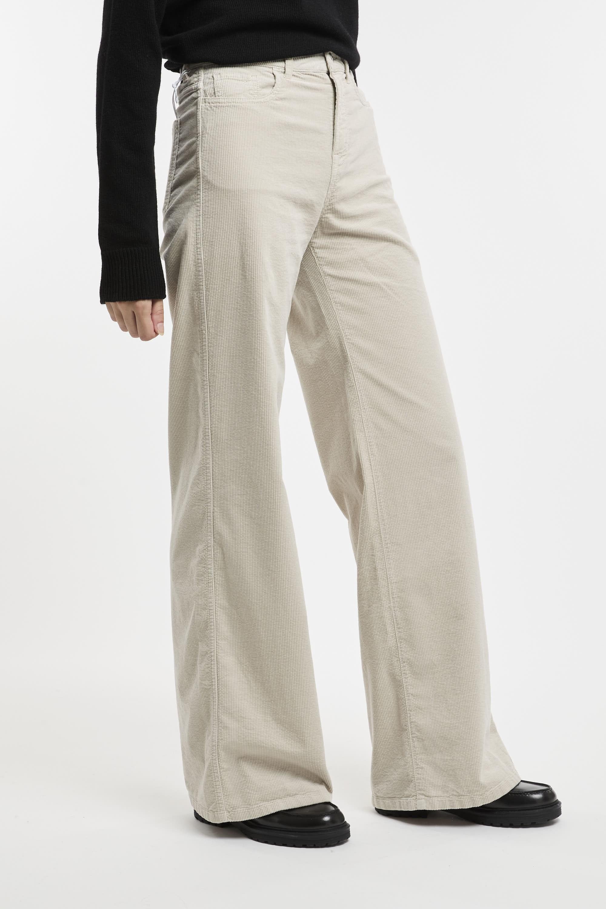 Pantalone a palazzo realizzato in velluto sabbia, passanti per cintura, vita media, chiusura frontale con bottone e zip, taglio 5 tasche, gamba dritta, etichetta logo. Fit regolare. Made in Italy. La modella è alta 178 cm e indossa la taglia 40.