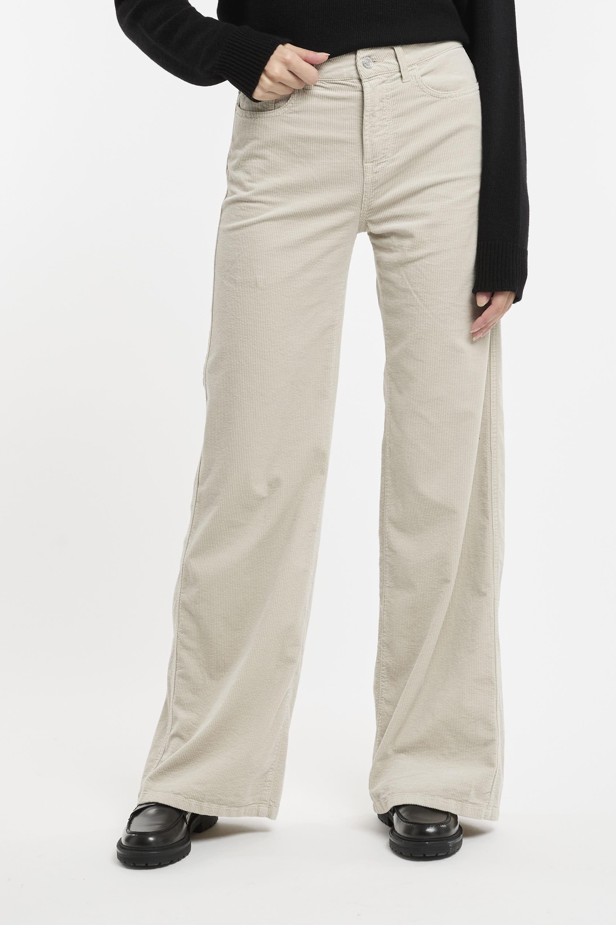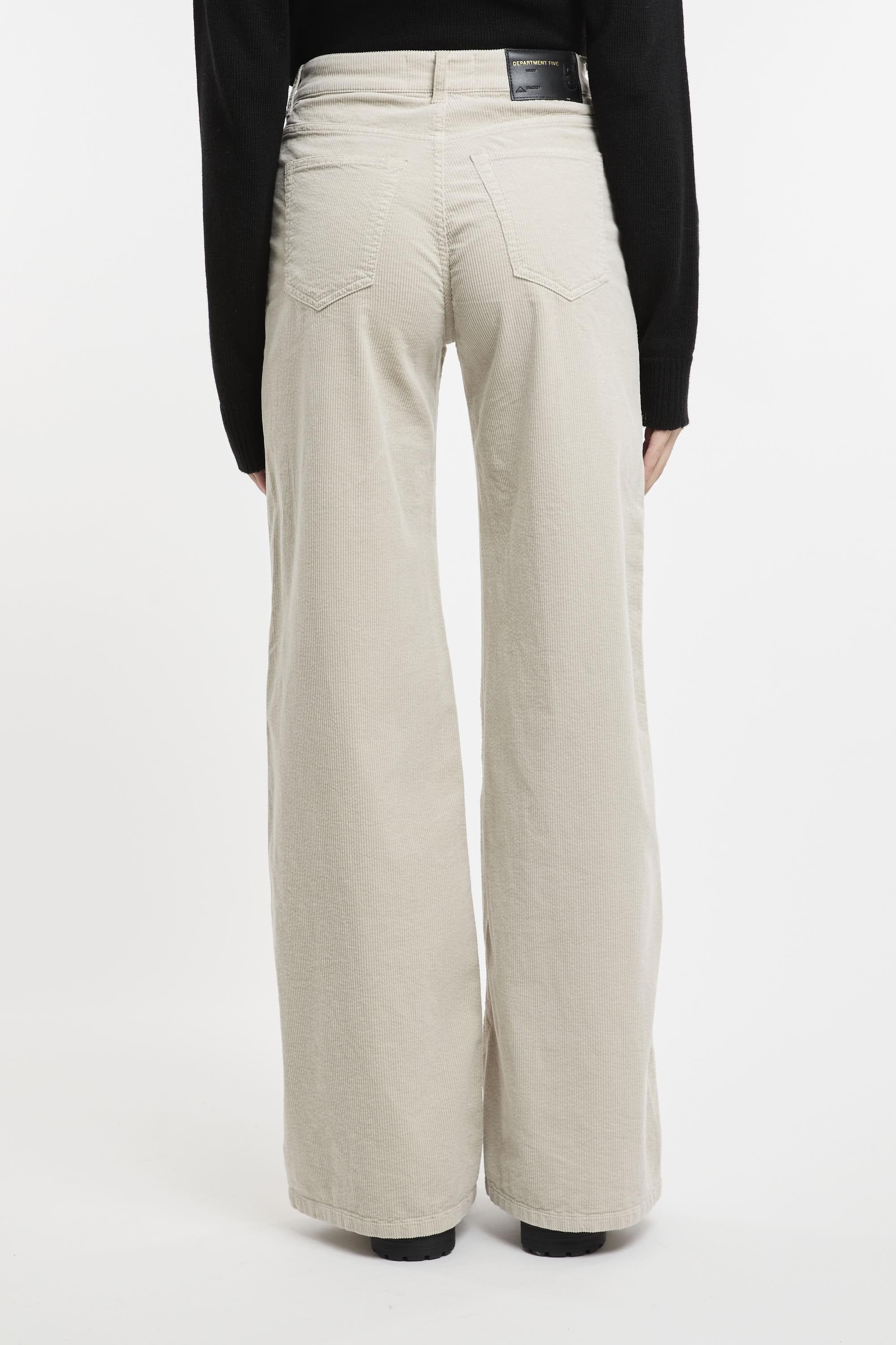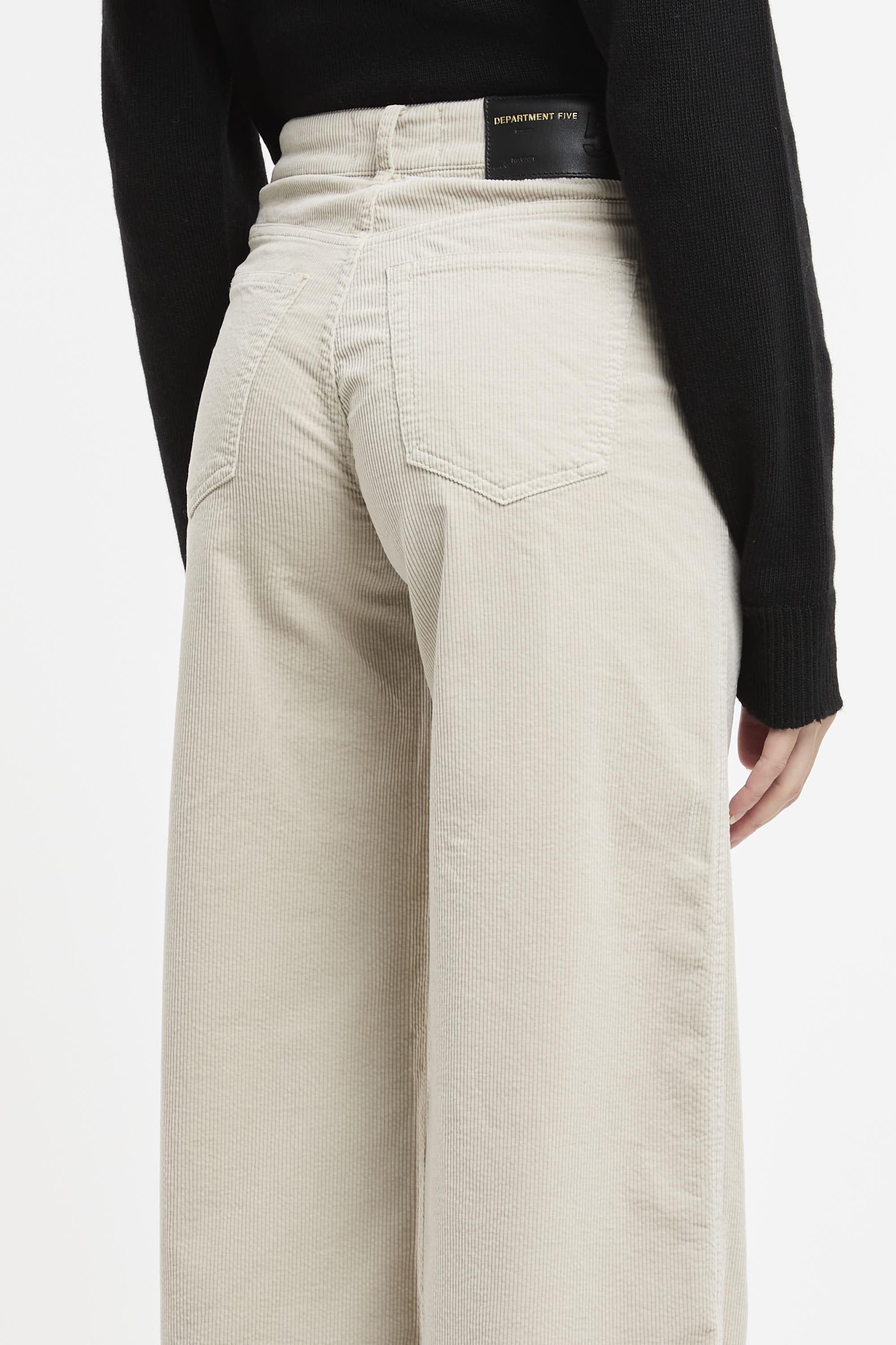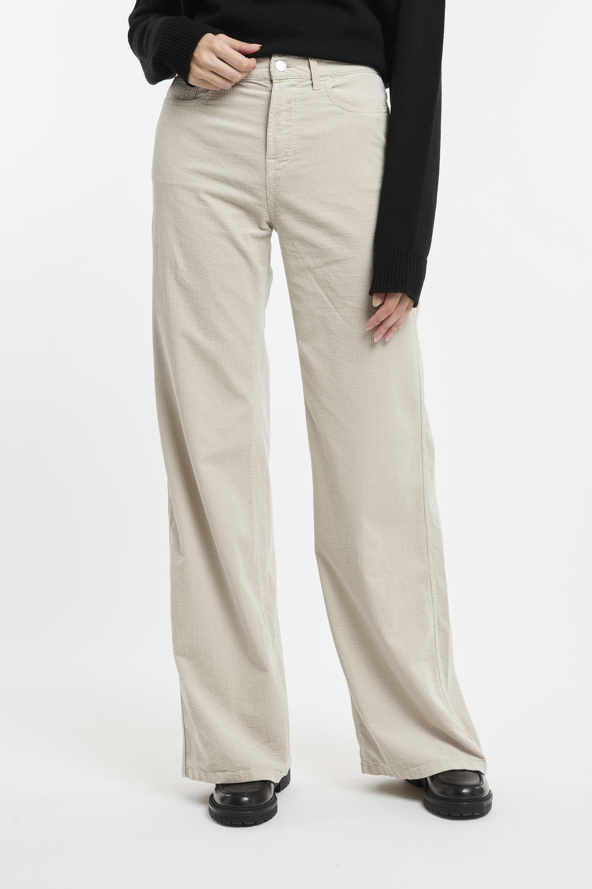 Pantalone a palazzo realizzato in velluto sabbia, passanti per cintura, vita media, chiusura frontale con bottone e zip, taglio 5 tasche, gamba dritta, etichetta logo. Fit regolare. Made in Italy. La modella è alta 178 cm e indossa la taglia 40.