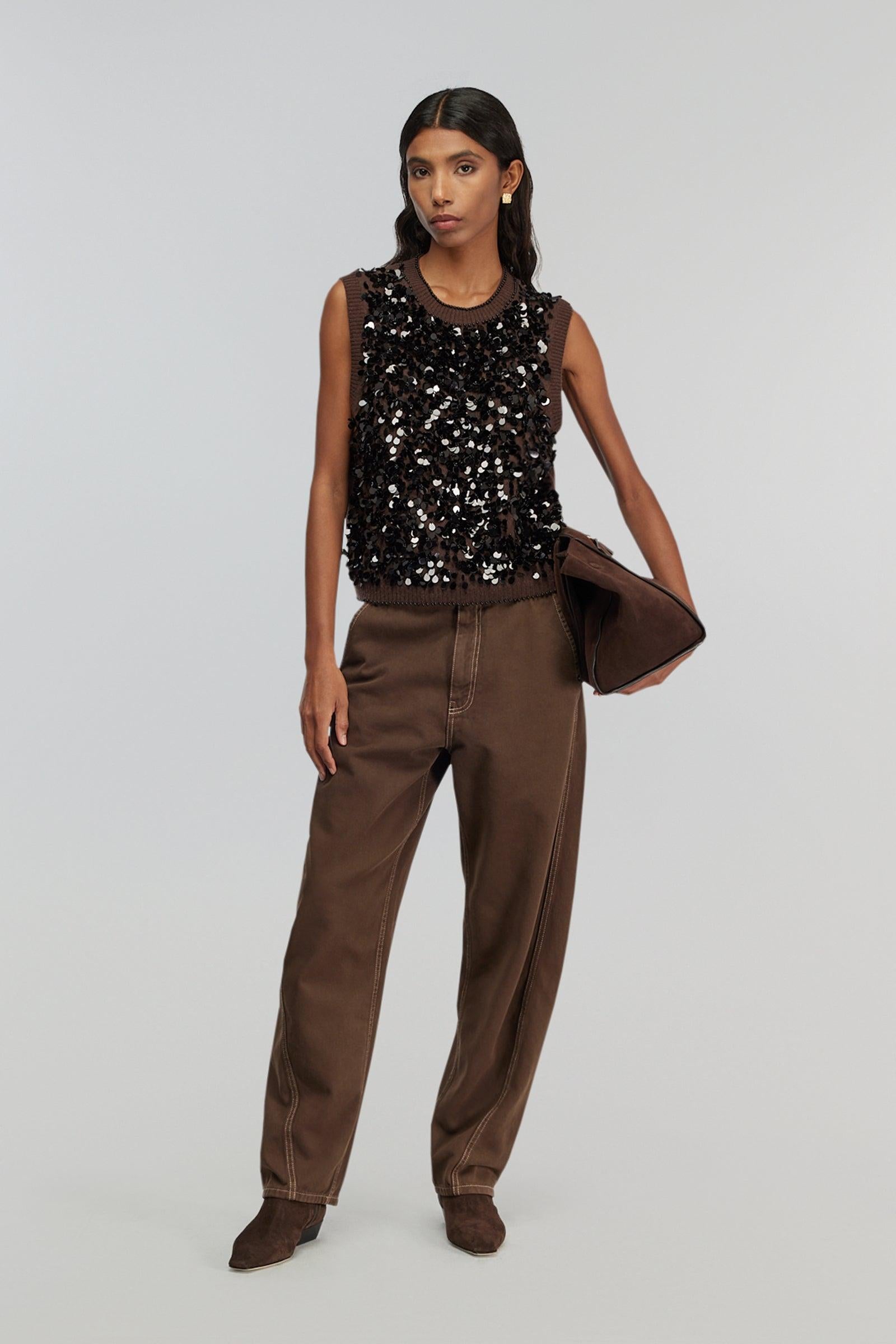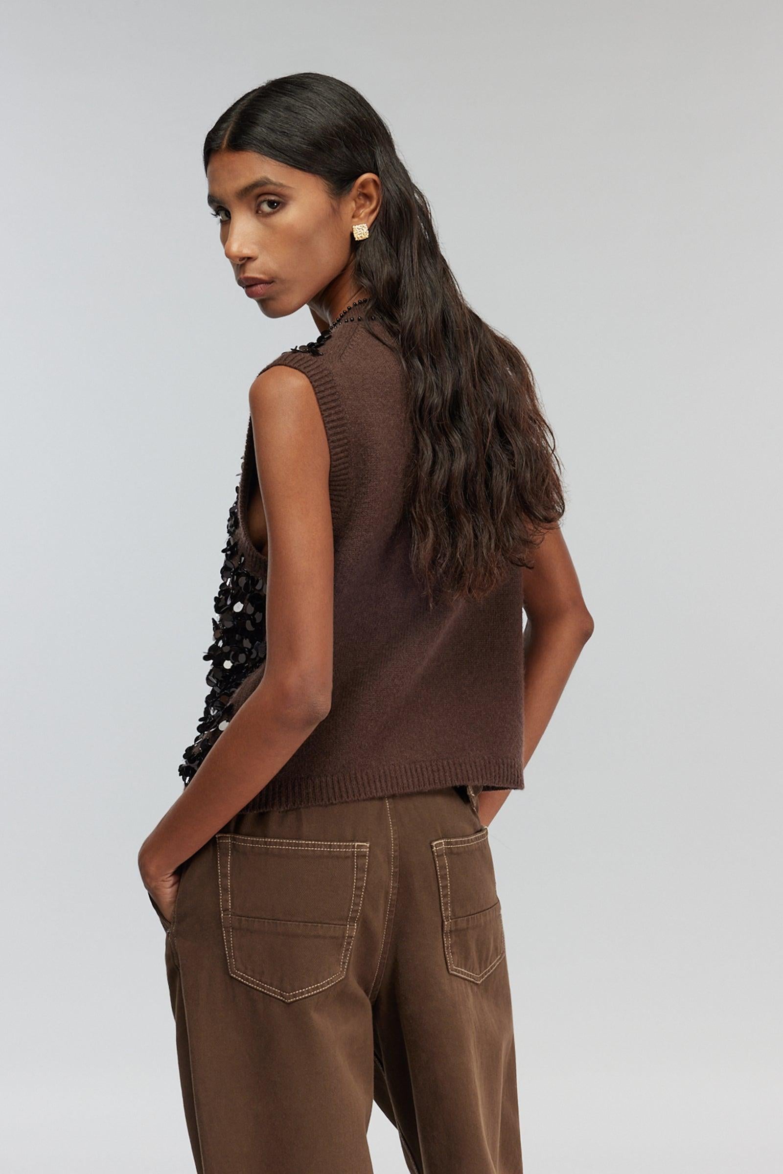 Gilet in misto cachemire. Ricamo all-over di paillettes e perline. Vestibilità regular, lunghezza bacino. La modella è alta 178 cm e indossa la taglia S.