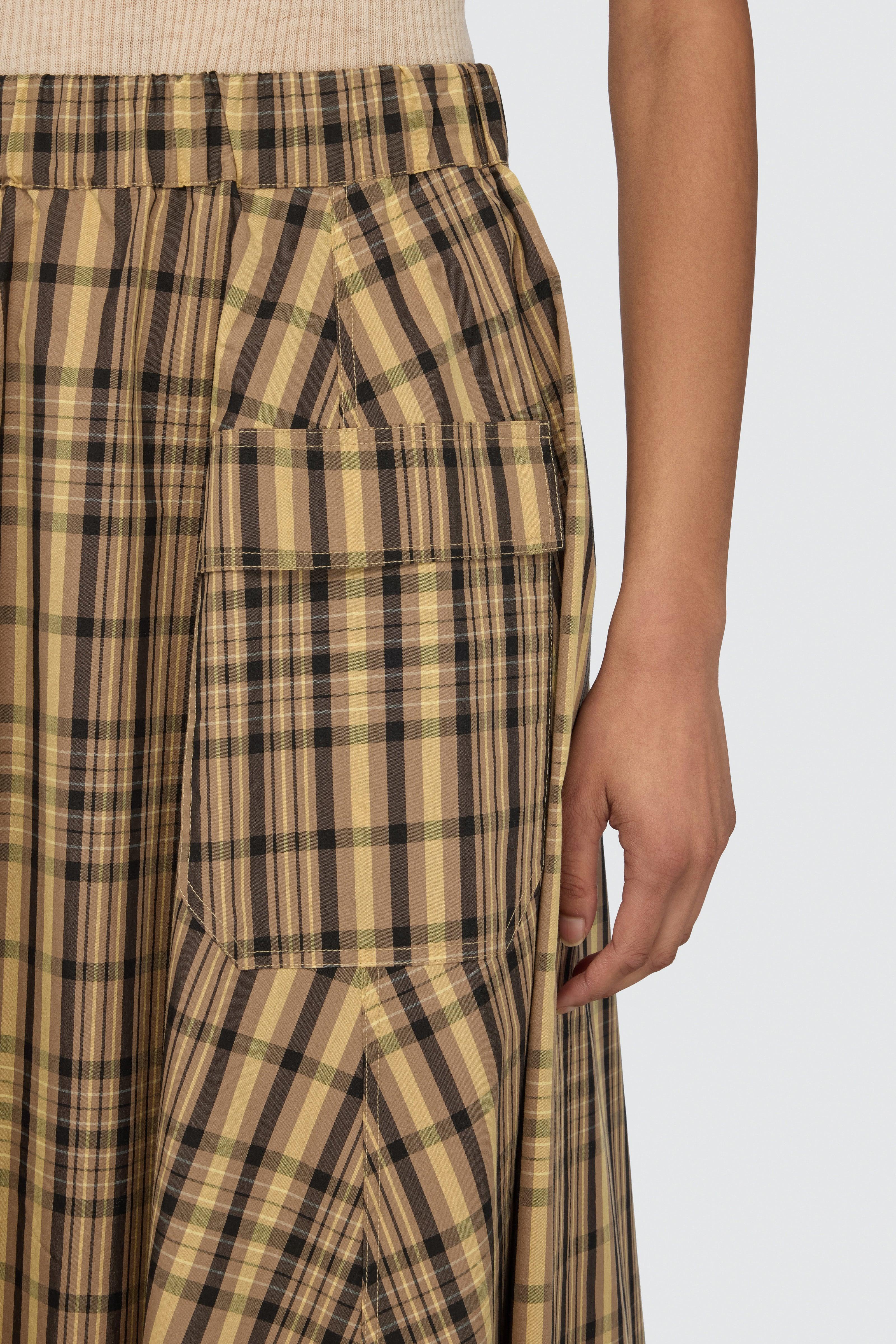 Gonna in cotone nylon disegnato. Dettagli due tasche grandi applicate sul davanti. Elastico con coulisse in vita. Lunghezza caviglia. Vestibilità regular. La modella è alta 178 cm e indossa la taglia 40. Made in Italy.