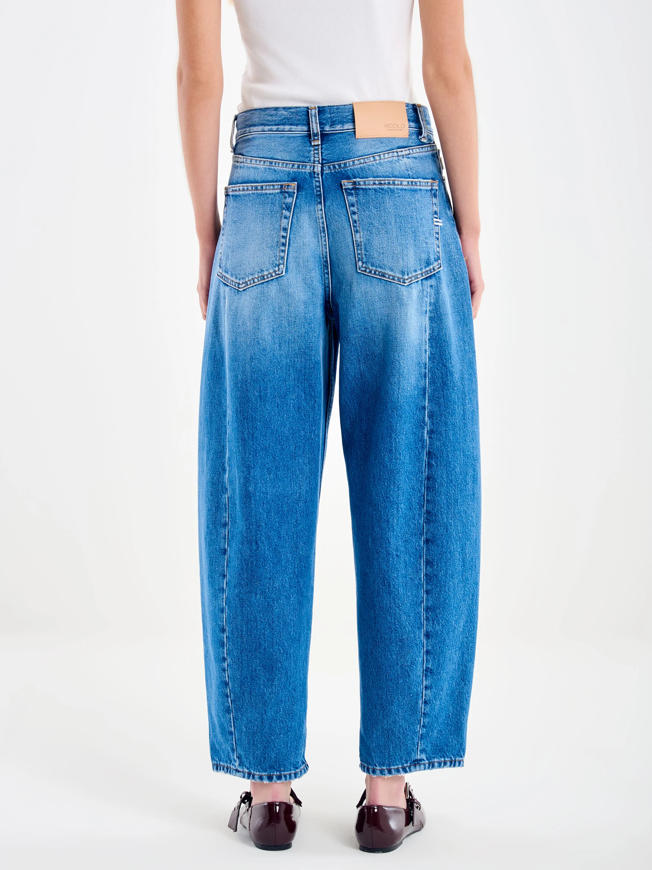 Jeans Chiara Barrel fit vita media. Chiusura frontale con zip e bottone in metallo. Modello cinque tasche, a ovetto. Denim blu. Dettaglio cucitura sulla gamba. La modella è alta 178 cm e indossa la taglia S.