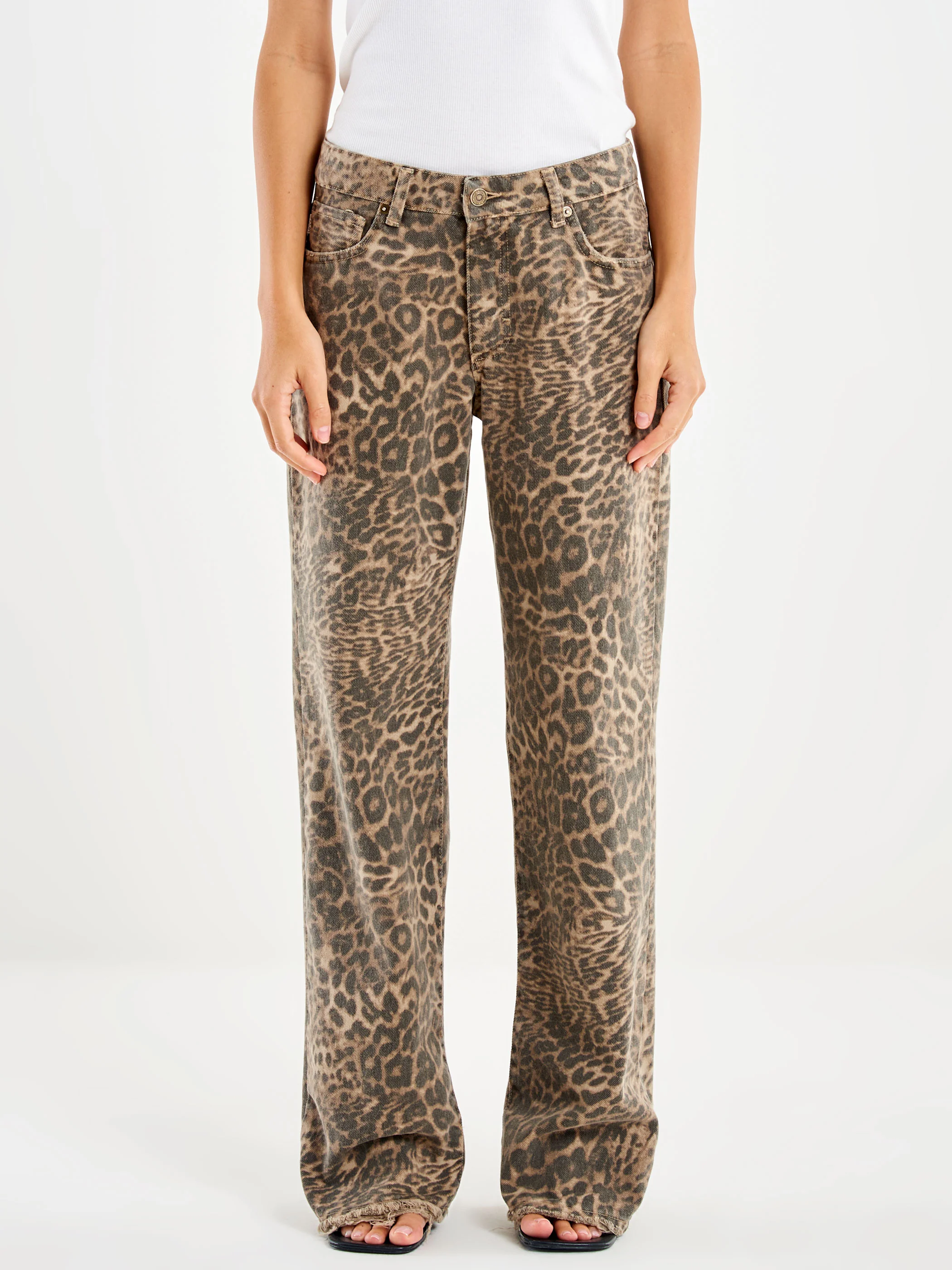 Jeans Melody in fantasia animalier, a gamba dritta. Vita Media, regular fit. Modello cinque tasche. Chiusura con bottone in metallo e zip. Dettaglio fondo sfilacciato con rotture. La modella è alta 178 cm e indossa la taglia S.