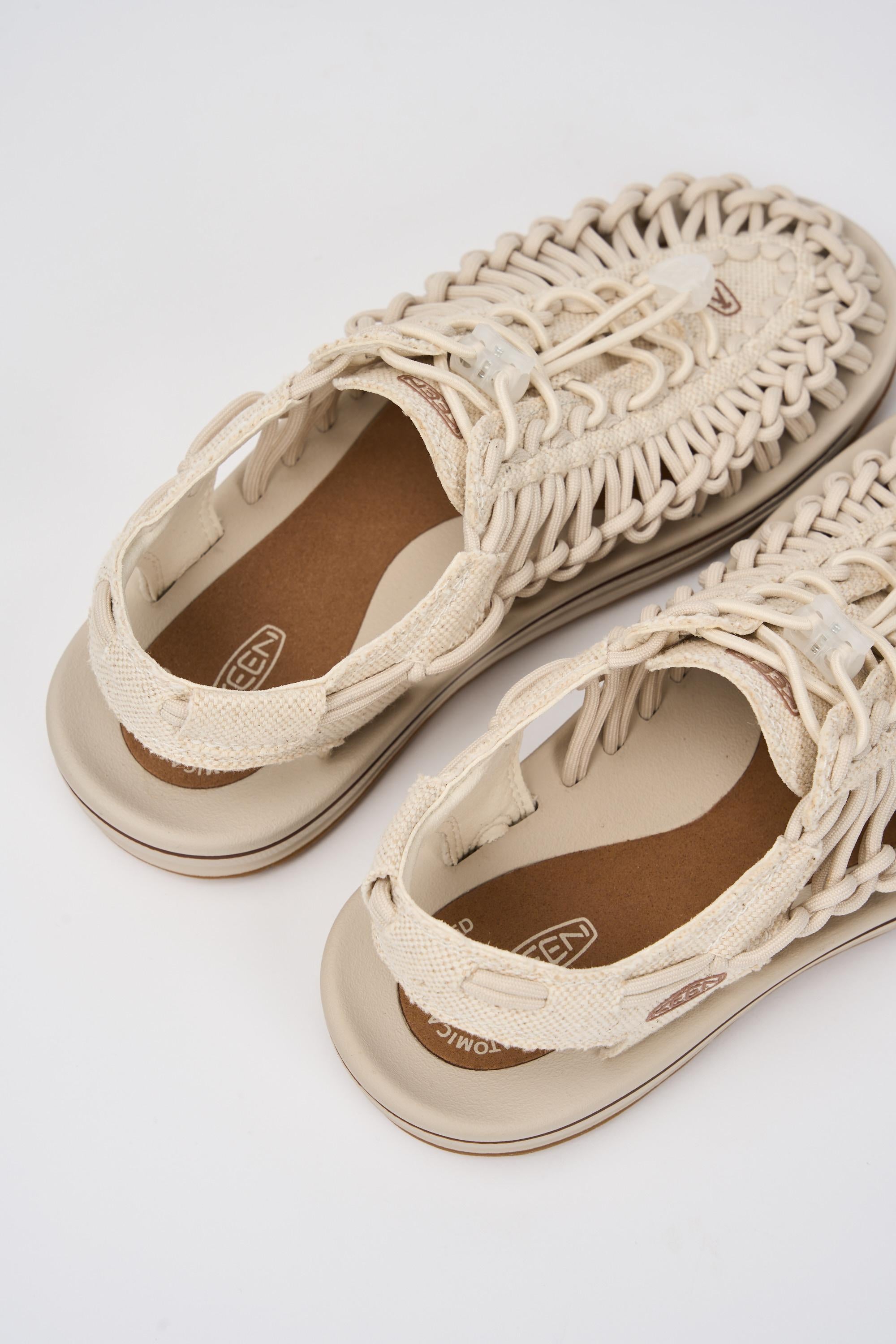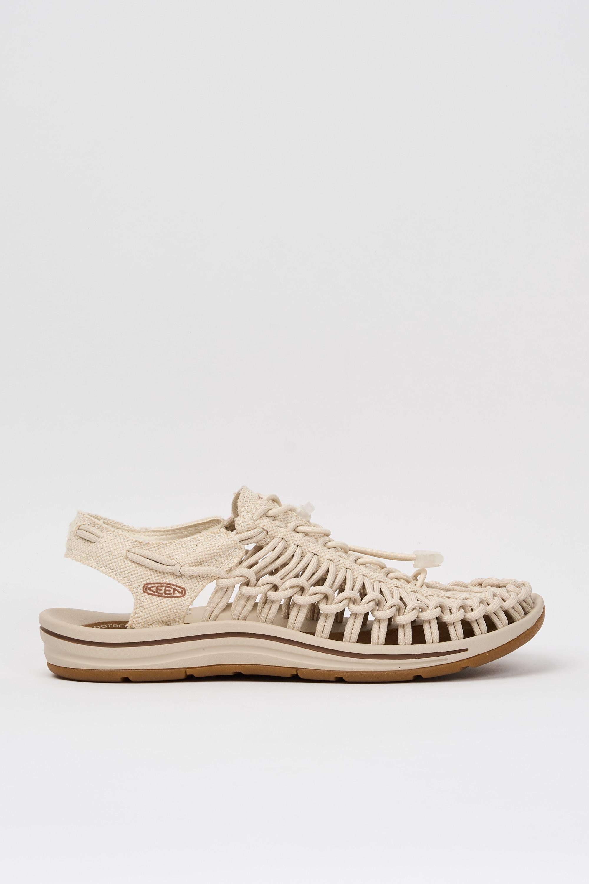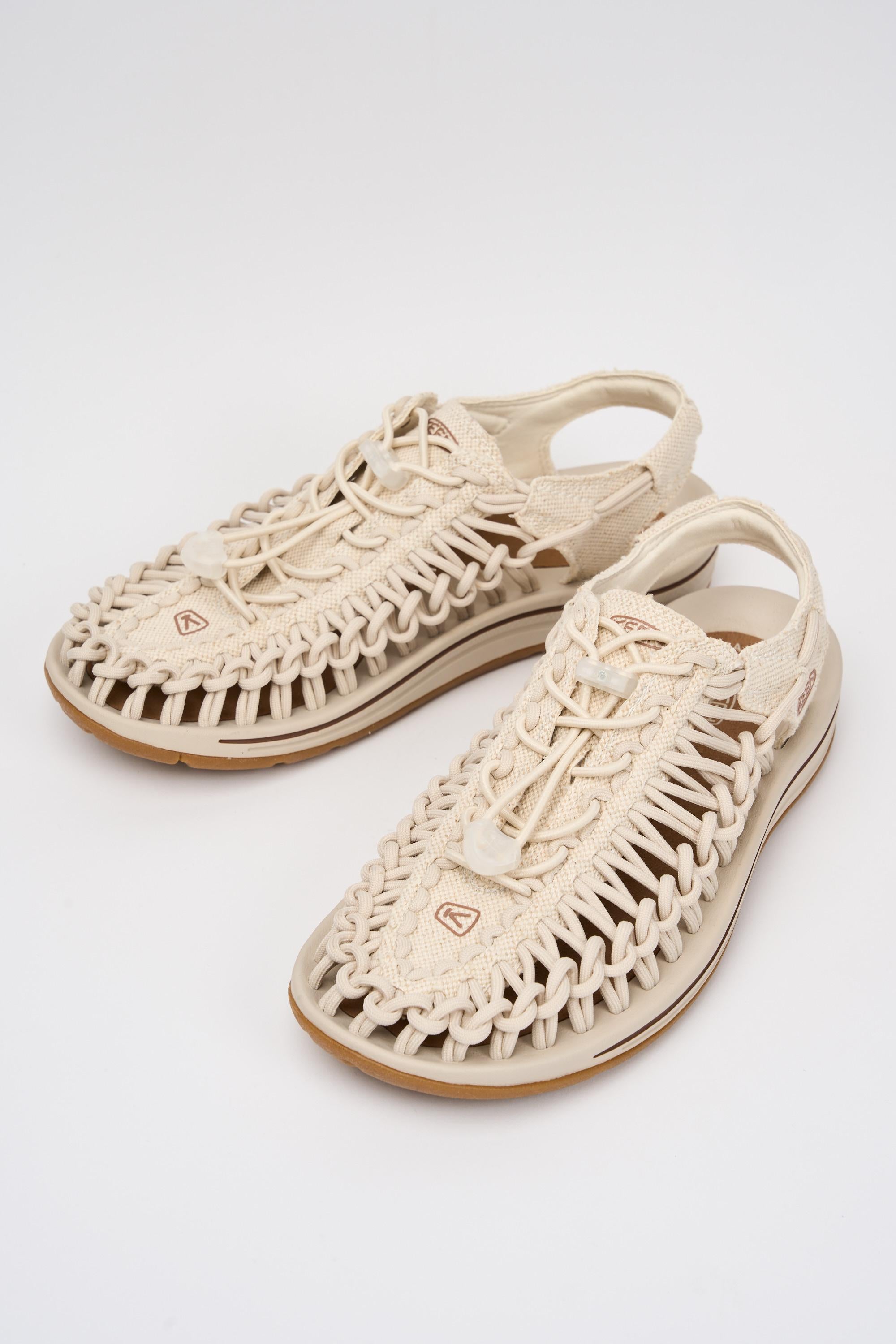 Sandalo modello Uneek di Keen caratterizzato da una tomaia intrecciata a doppia corda, con sistema di allacciatura 'Bungee' e tecnologia Cleansport NXT per il controllo naturale degli odori.