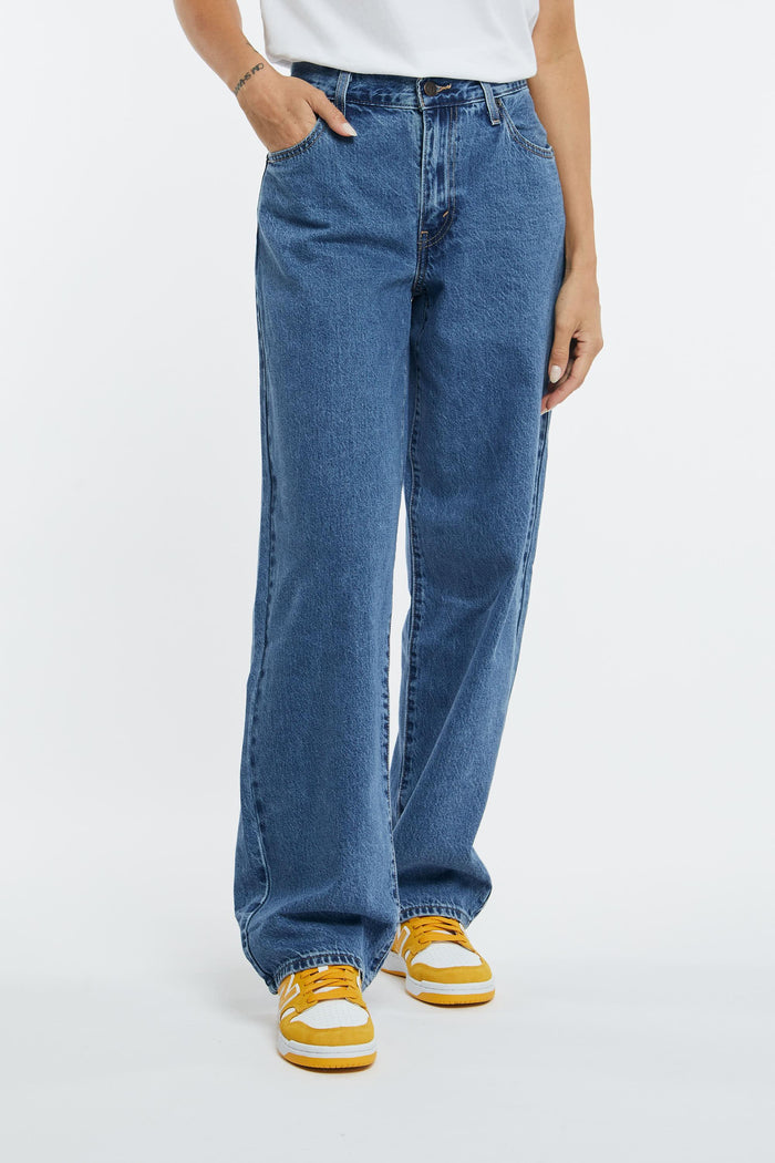 Jeans modello "Dad" in denim, gamba dritta e vita media. Modello ampio e morbido su fianchi e cosce. Cinque tasche, chiusura frontale con bottone e cerniera con patch logo sul retro. La modella è alta 178 cm e indossa la taglia 26.