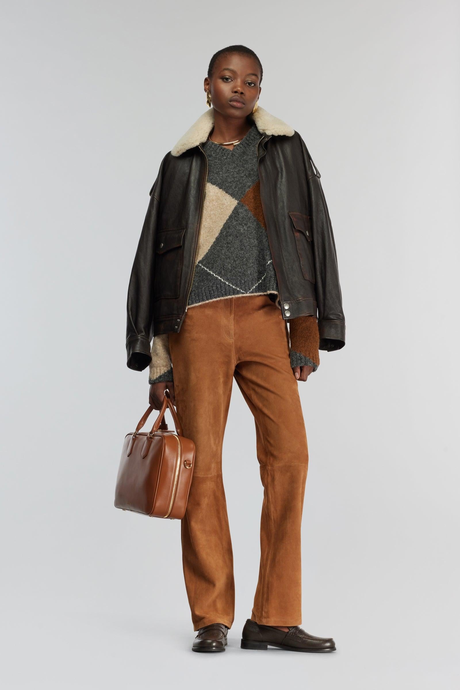 Maglia a rombi in misto alpaca. Modello scollato a V, manica lunga. Boxy fit, lunghezza bacino. La modella è alta 178 cm e indossa la taglia S. Made in Italy.