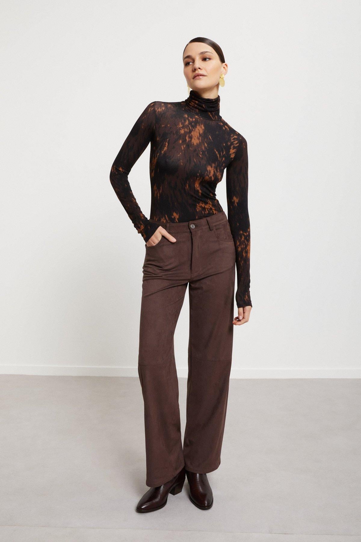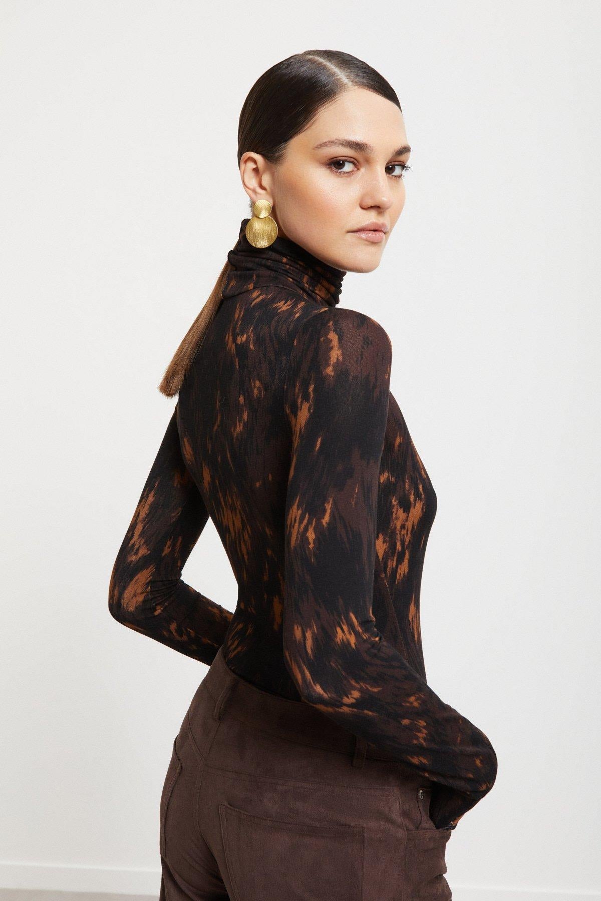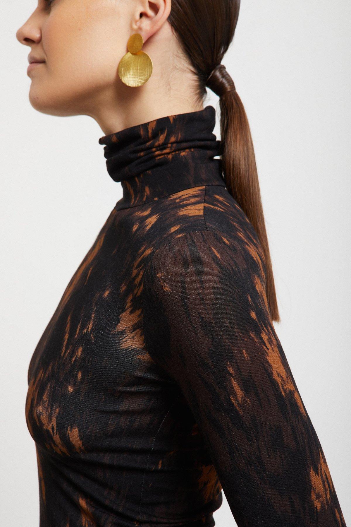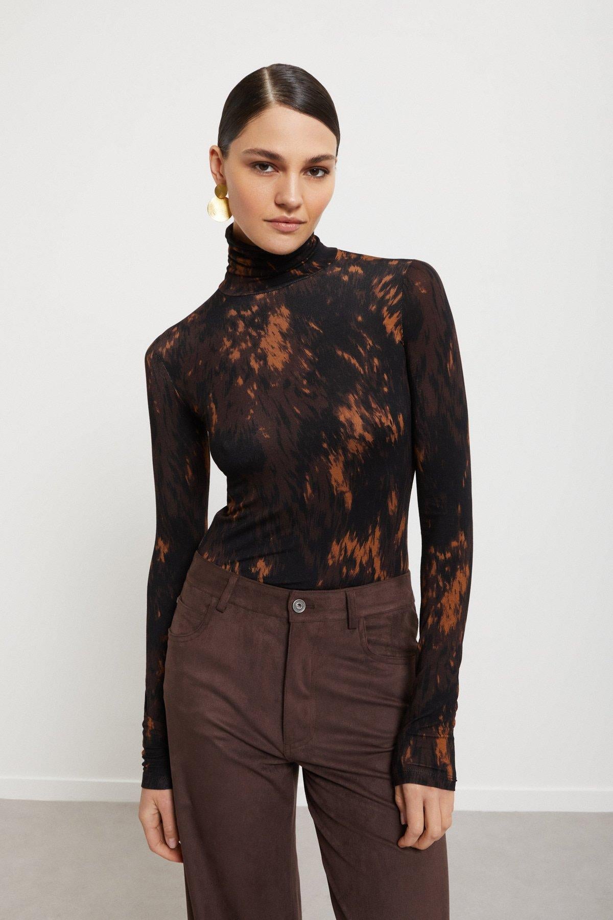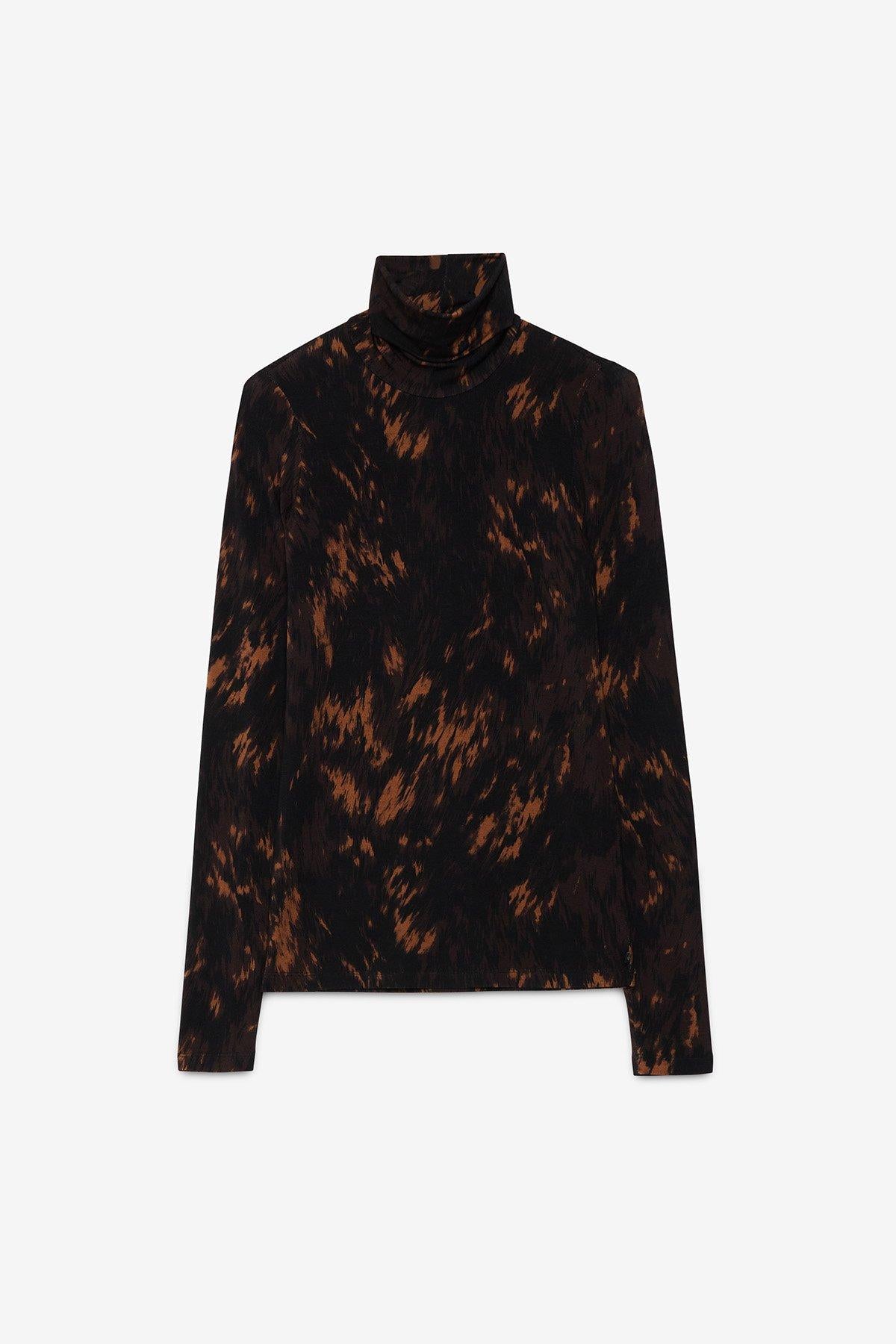 Maglia dolcevita in pura viscosa stampata. La modella è alta 178 cm e indossa la taglia S.