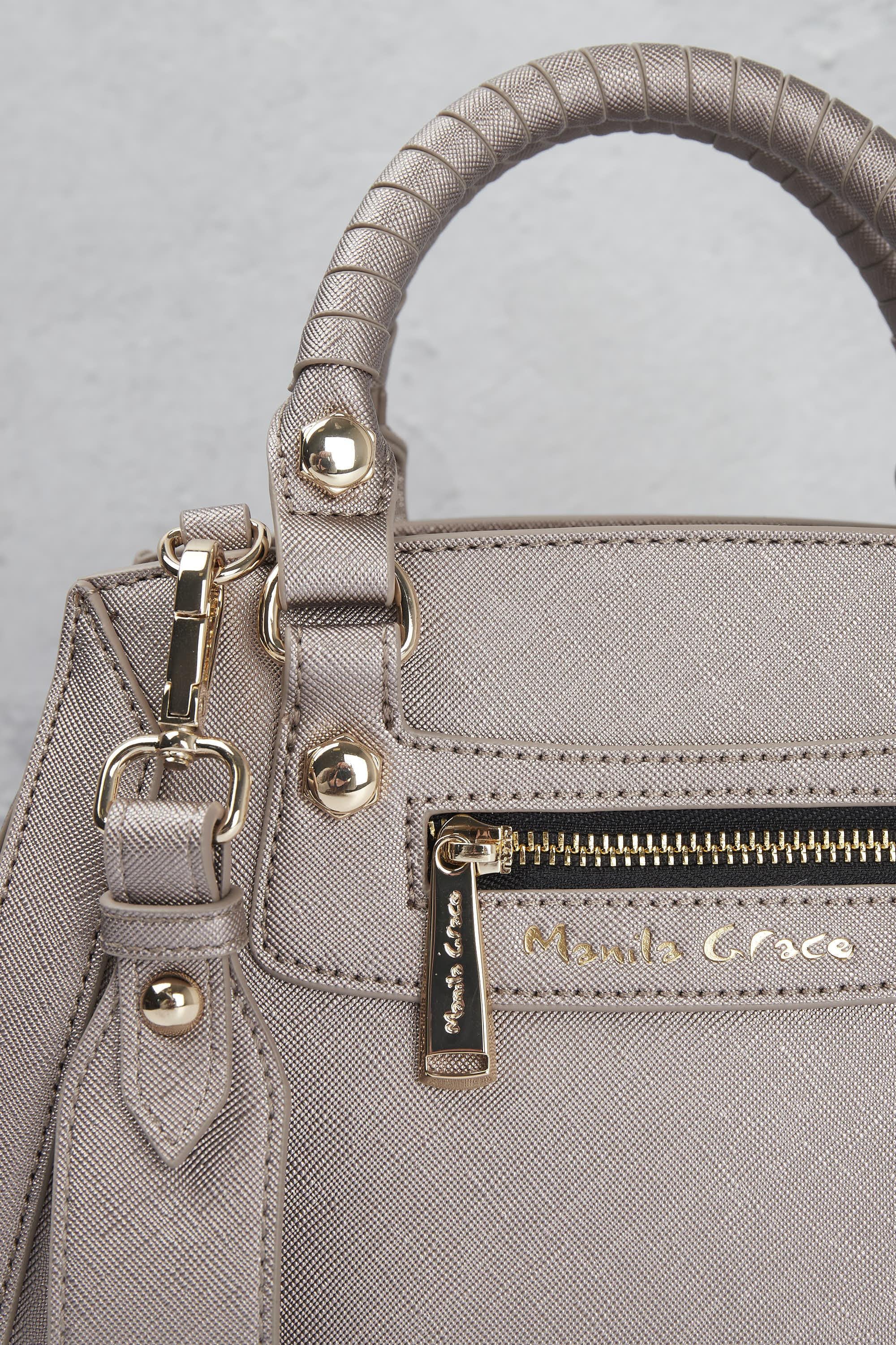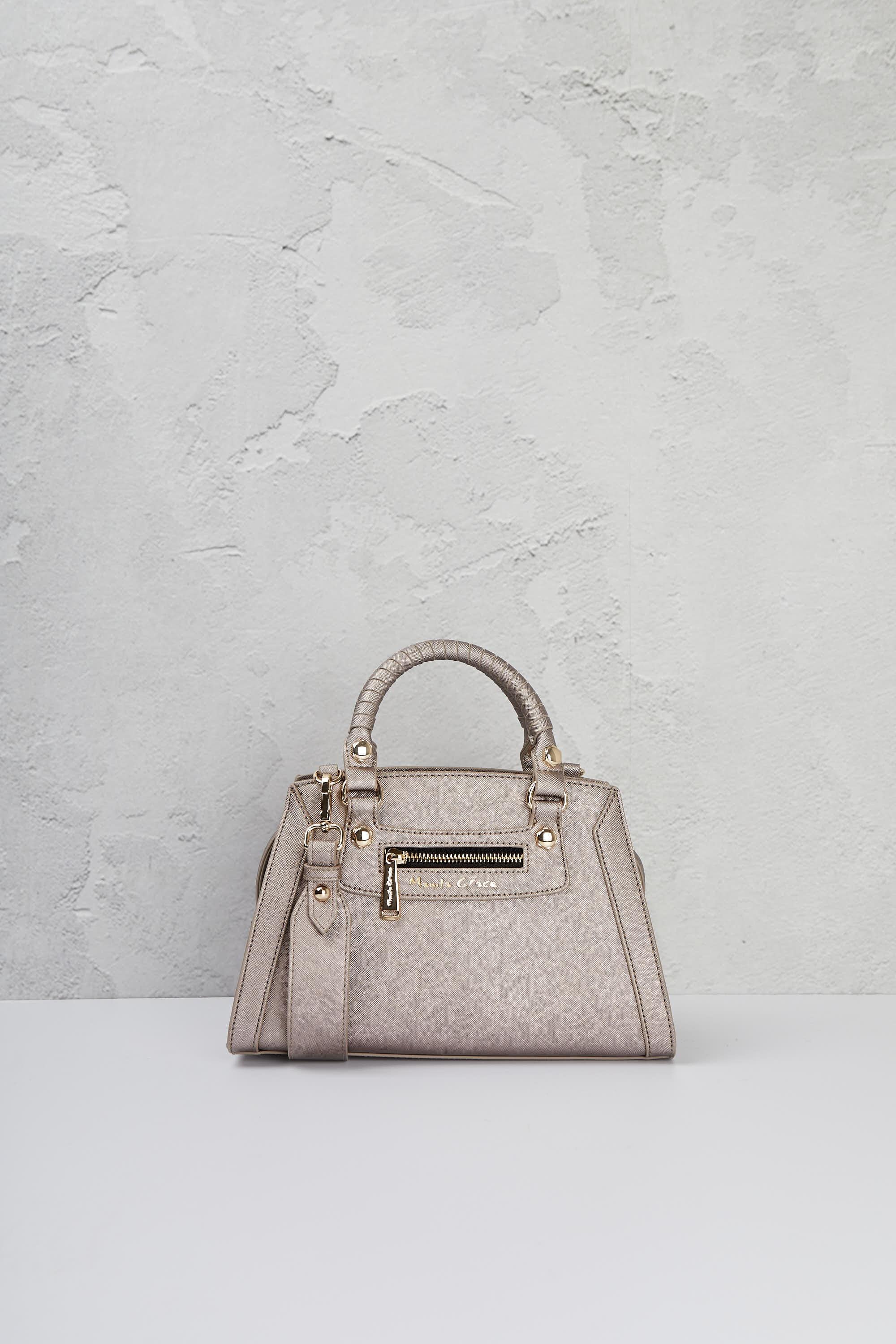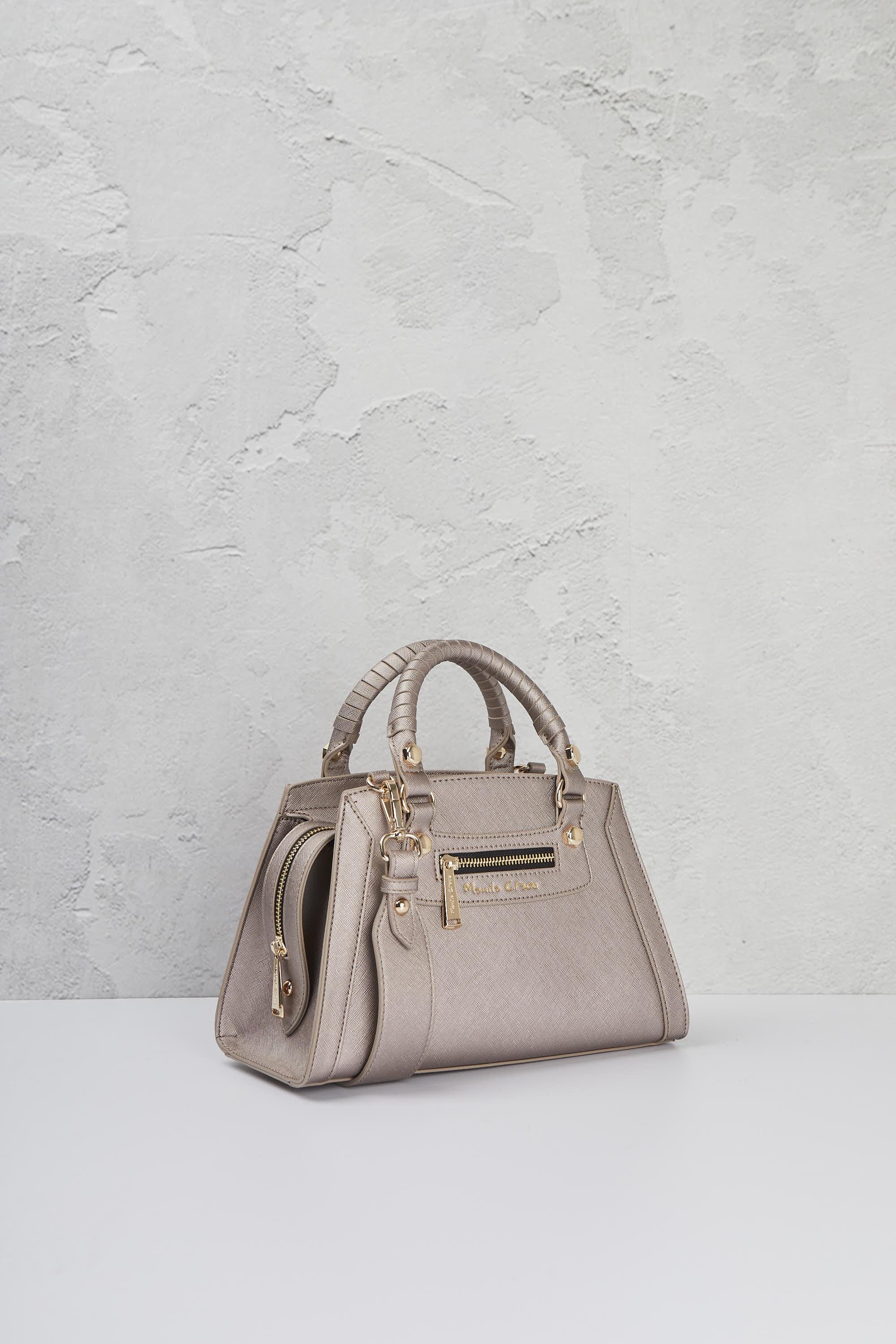 Borsa Mirama, qui nel modello small, realizzata in saffiano. Il dettaglio del manico intrecciato, a spirale, dona contemporaneità e crea una particolarità che contraddistingue la borsa. Dotata anche di tracolla per confermare la sua praticità giornaliera. La borsa è larga 28 cm, alta 18 cm e profonda 13 cm.
