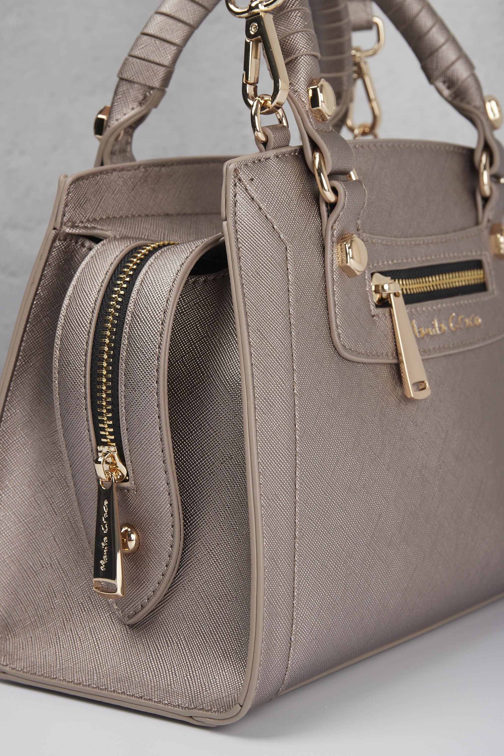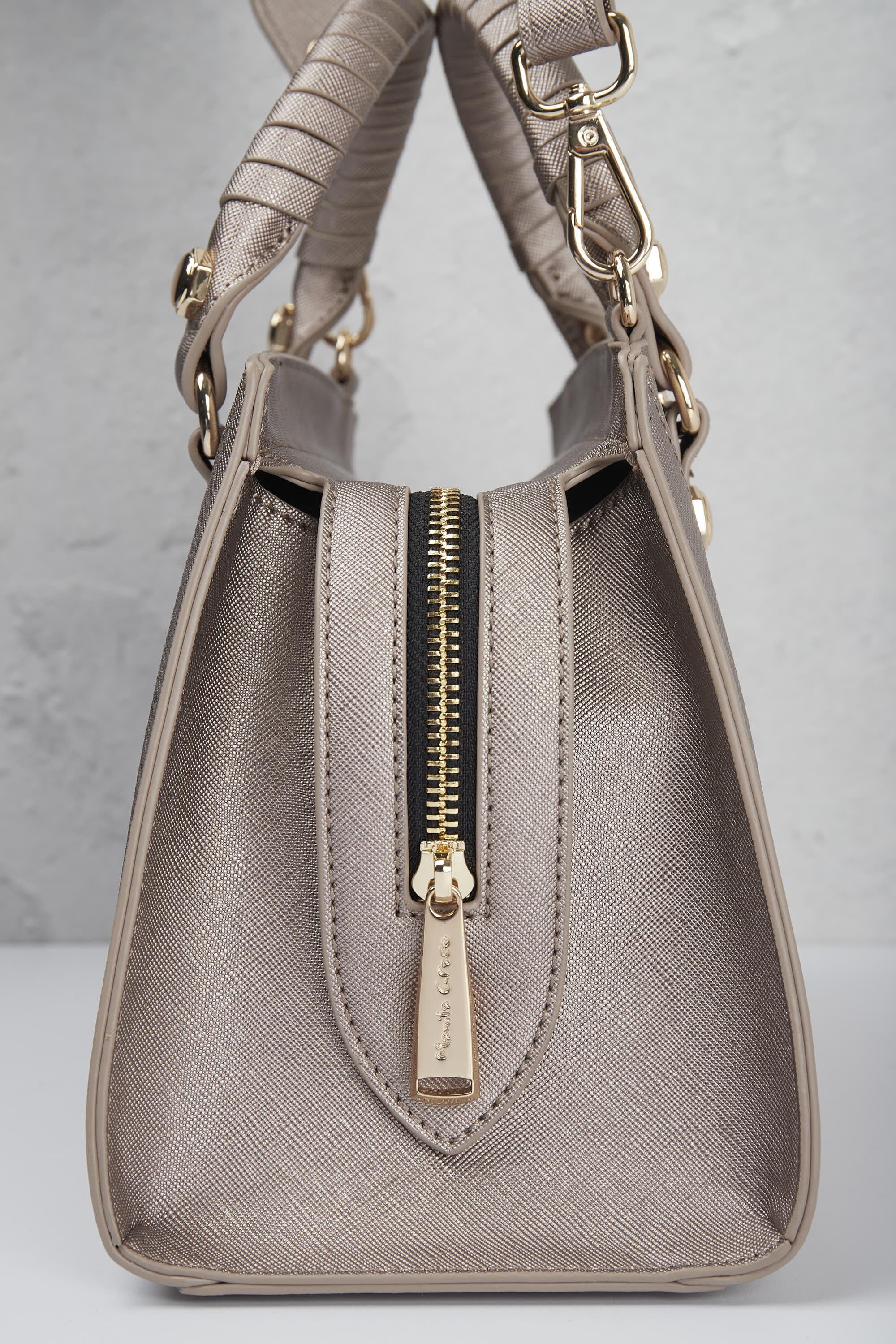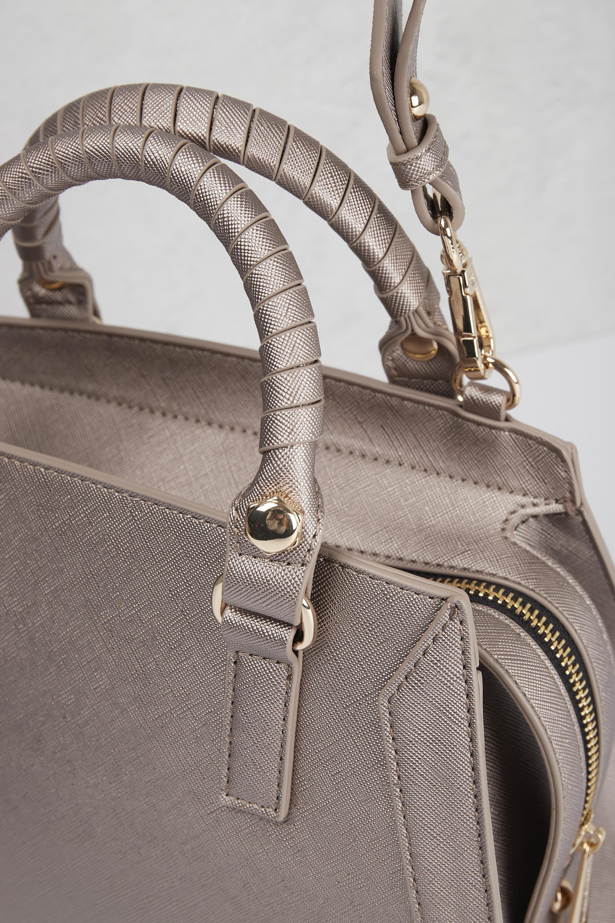 Borsa Mirama, qui nel modello small, realizzata in saffiano. Il dettaglio del manico intrecciato, a spirale, dona contemporaneità e crea una particolarità che contraddistingue la borsa. Dotata anche di tracolla per confermare la sua praticità giornaliera. La borsa è larga 28 cm, alta 18 cm e profonda 13 cm.